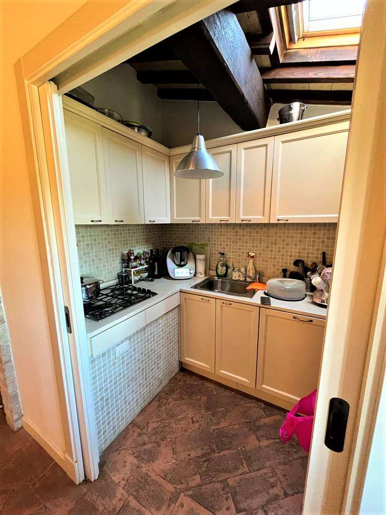 L'immobile, sviluppato su due livelli, si compone di un piccolo ingresso, una cucina abitabile, una sala da pranzo, un soggiorno, due camere da letto (una matrimoniale e una singola/studio) due bagni e due piccoli ripostigli.
