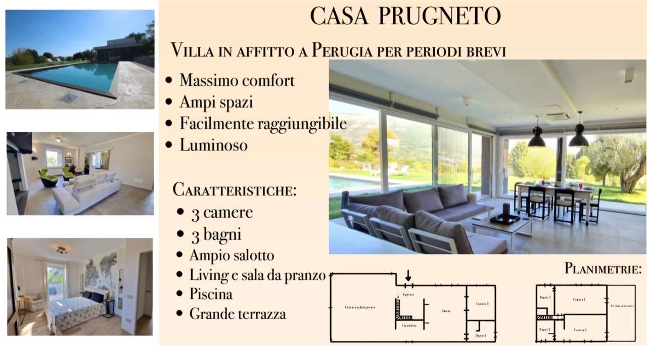 Referente immobile: Giuseppe Casella 3884778338\n\nSinergie Immobiliare è lieta di proporti in affitto, con un contratto di massimo un anno, una splendida Villa a San Giovanni del Prugneto (Perugia - Umbria).\n\nDescrizione della Villa:\n- Ampia zona living con salotto e camino\n- Cucina attrezzata (forno, forno a microonde, frigorifero, lavastoviglie)\n- Zona lavanderia attrezzata con lavatrice\n- 3 camere da letto con bagno esclusivo, ognuna dotata di doccia (una camera al piano terra)\n- Spazi all\'aperto: ampio giardino, zona pranzo all’aperto, barbecue\n- Piscina privata panoramica con zona acqua bassa (140 cm) - lettini e sdraio disponibili\n- Aria condizionata e riscaldamento\n- Protezione e sicurezza: accesso con chiavi, cancello telecomandato, allarme\n\n\nCosa c\'è nelle vicinanze:\n- Villa Colle del Cardinale a 700 m\n- Campo da Golf Antognolla a circa 8 km\n- Parco del Monte Tezio a 2 km, con percorsi escursionistici\n- Lago Trasimeno a 15 km\n- Perugia a 12 km\n- Campo di calcio a 1 km\n- Maneggio a 2 km\n- Parco Acquatico (apertura imminente) a 2 km\n\nAttività nelle vicinanze:\n- Escursionismo: Monte Tezio a 2 km, Lago Trasimeno a 15 km\n- Golf Club: Antognolla a 6 km, Santa Sabina a 14 km\n- Equitazione: Maneggio a 2 km\n- Città d\'arte: Perugia (12 km), Assisi (25 km), Spello (35 km), Gubbio (25 km), Spoleto (70 km), Todi (50 km)\n\nRistoranti e servizi:\n- Sultano a Colle Umberto a 2 km\n- Supermercato Gala a Colle Umberto a 2 km\n- Ristorante Casa Corsetti (presso il Lago Trasimeno) a 13 km\n- Pizzeria “Il Cucuzzaro” a 3 km\n\nAeroporti limitrofi:\n- Aeroporto dell\'Umbria - Perugia San Francesco d\'Assisi a 18 km\n- Aeroporti di Roma (Fiumicino e Ciampino) a 180 km\n- Aeroporto di L\'Aquila-Parchi a 88 km\n- Aeroporto internazionale di Ancona a 90 km\n\nAnche disponibile per affitti brevi.\n\nPer maggiori informazioni o per fissare un appuntamento, chiama ora Giuseppe Casella al 3884778338.