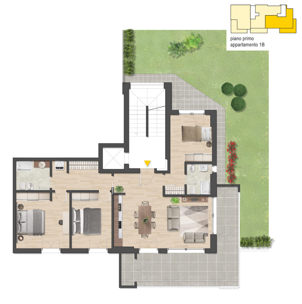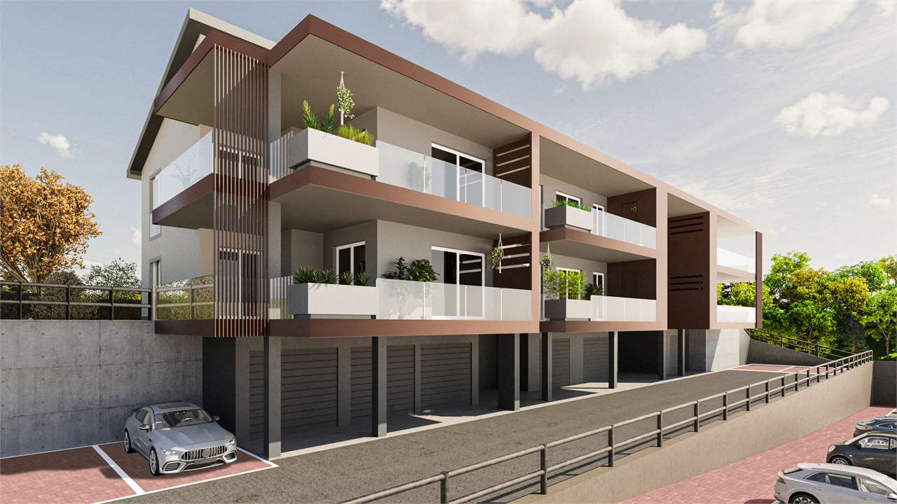 RESIDENZA DEL SOLE. In piccola palazzina di sole 6 unità proponiamo in vendita in esclusiva appartamenti con due o tre camere con giardino o grande terrazzo. Tutti gli appartamenti hanno garage e posto auto esclusivo. Dotata di ascensore. Nello Specifico questo appartamento ha soggiorno con cucina, tre camere, due bagni, un grande terrazzo e un giardino di 350 mq. Inoltre garage doppio posto auto. Capitolato di altissima qualità: \nCaratteristiche Principali:\nClasse Energetica A: Questo edificio è stato progettato e costruito con tecniche costruttive innovative per garantire un\'elevata efficienza energetica, contribuendo a ridurre i consumi ei costi energetici. \nAssenza di pilastri: La presenza di una piastra di solaio alleggerita elimina i pilastri discendenti, offrendo grande solidità e permettendo una maggiore libertà di progettazione degli spazi interni. \nInfissi altissima qualità: In PVC di alta qualità con cinque camere d\'aria. Tapparelle in alluminio coibentate. E molto altro ancora. Fissa un appuntamento per visionare il capitolato e avere maggiori informazioni su questa realizzazione esclusiva caratterizzata da qualità costruttiva, posizione panoramica, zona residenziale e tranquilla ma vicina a tutti i servizi. Un piccolo estratto del capitolato per evidenziare la qualità costruttiva: Tutte le tamponature esterne verranno realizzate con metodo a secco utilizzando un\npacchetto tipo Knauf o similare con spessore finito di cm 30 circa ancorato ad idonea struttura il cui montaggio verrà effettuato esternamente ai pilastri onde evitare ponti termici e garantire ottimo isolamento termo-acustico. Il tutto dimensionato e specificato nei grafici esecutivi. La finitura esterna sarà eseguita con tonachino di colore scelto dalla D.L.\nLe superfici esterne come previsto nei grafici dei prospetti verranno tinteggiate utilizzando vernice “silossanica”. Puoi vedere l\'appartamento in 3D su: https://sinergieimmobiliare.widget.floor-plan.online/?id=2fee16b8-5e82-4207-a708-c54b1958b123