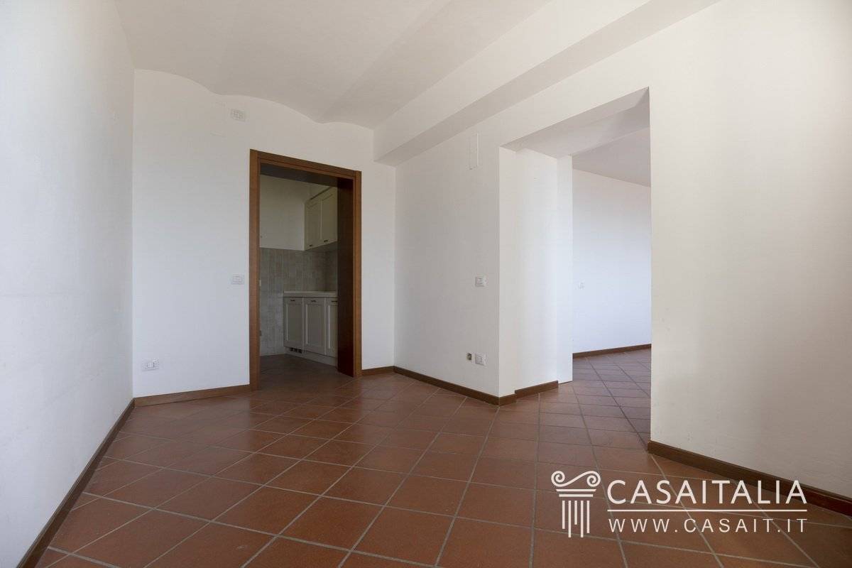A seguire troviamo un soggiorno, con tre belle porte finestra che si aprono su un grande terrazzo panoramico di 23 mq, da cui è possibile godere della vista tipica dei borghi umbri, che dai tetti e dai campanili del centro storico scorre sulla vallata fino a trovare, all'orizzonte, le dolci verdi colline che contrastano con l'azzurro del cielo.