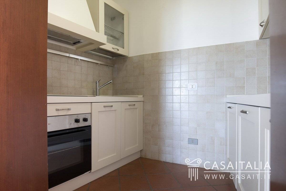 L'accesso all'appartamento avviene su un ampio e luminoso vano, con un angolo cottura da un lato e un grazioso terrazzino panoramico dall'altro.