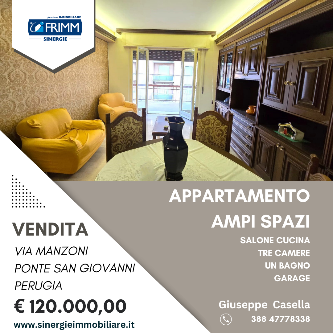 Frimm Sinergie Immobiliare ha il piacere di proporti un’ottima soluzione abitativa. Siamo Ponte san Giovanni in ottima posizione, in zona servita. In questo contesto proponiamo in vendita unità abitativa, Parliamo di un appartamento posto al primo piano di sei con ampi spazi. All’ingresso ci accoglie un ampio salone di 23 mq. confortevole con accesso ad una terrazza profonda 1.80 m. per 4 m., proseguendo cucina con angolo cottura e ripostiglio entrando nella zona notte 3 camere di cui due matrimoniali e una con terrazza, una cameretta e bagno, il tutto per un totale di circa 125 mq. La palazzina è dotata di ascensore, costruita nel 1966, al momento non sono stati deliberati lavori straordinari. L\'appartamento si presenta in buone condizioni, abitabile. Il bagno ristrutturato nel tempo, non sono stati eseguiti lavori di aggiornamento impianti ma solo la normale manutenzione ordinaria. Le spese di condominiali sono circa 115,00 €, riscaldamento centralizzato con termo valvole, sono incluse le classiche spese di condominio, incluso il riscaldamento a conguaglio. \nChe dire, posizione centralissima, molto confortevole per i suoi ampi spazi, gradevole, servito, silenzioso visto che è posto dal lato opposto di via Manzoni, da subito libero. Per questi motivi vi consigliamo di contattarci per una visita. \nClasse energetica “G”. Ottimo anche per investimento. \nSaremo felici di aiutarvi a scegliere la migliore casa per Lei e la tua famiglia. Visto le caratteristiche di questo immobile vi consigliamo di chiamarci per una visita.\n PER INFO E APPUNTAMENTI CONTATTARE GIUSEPPE CASELLA 3884778338. La nostra missione è vivere con ENTUSIASMO il nostro lavoro - pronti al DIALOGO - al RISPETTO per i clienti, CORAGGIO, COERENZA verso gli impegni assunti, al fine di offrire SICUREZZA nell’acquisto immobiliare. Specialisti vendita residenziale e attività commerciali.