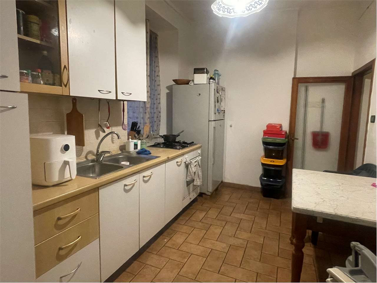 Perugia, zona stazione, in palazzina in pietra degli anni 50’, disponiamo di un appartamento di mq 110 ca., posto al primo piano, con un balcone e un ampio terrazzo abitabile di mq 28 ca., oltre un fondo di mq 9 ca.. \nL’appartamento è stato diviso in due appartamenti e poi messo a reddito; ed è così suddiviso:\n\nPiccolo disimpegno d’ingresso dal quale si accede a destra al “Sub A” ed a sinistra ad “Sub B”. \n\n• Sub A: Mq 62 ca. composto di cucina abitabile, 2 camere, due bagni e terrazzo.\n• Sub B: Mq 49 ca. composto di cucina, camera con balconcino, bagno e ampio terrazzo.\n\nRiscaldamento autonomo, spese condominiali minime € 20/mese per entrambi i subalterni.\n\nFiniture: portone in legno, porte in legno, infissi misti, alcuni in alluminio con vetro doppio taglio termico acustico, altri in legno con vetro singolo, i pavimenti in monocottura, laminato e marmo, un bagno è stato ristrutturato completamente.\n\nZona servitissima, adiacente alla Stazione ferroviaria ove sono presenti tutti i servizi. Ottimo per chi deve muoversi con i mezzi di linea.\n\nPer ulteriori informazioni, chiamare Michele Merli 335.5636.517\n\n\nTutti i dati indicati relativi all\'immobile sono stati forniti in buona fede dal proprietario e non costituiscono elemento contrattuale; pertanto, l’agente immobiliare non si assume nessuna responsabilità.