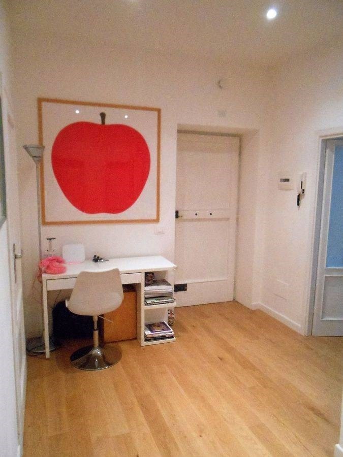 ingresso, ampio salone luminoso con aria condizionata e balcone, cucina semi abitabile, camera matrimoniale, seconda camera con terrazzino, zona lavanderia, bagno, ampio ripostiglio con allacci gia' pronti per realizzare un secondo servizio, tutti gli impianti nuovi, condominio irrisorio, completano la proprieta' il giardino condominiale con cancello elettrico e posto auto assegnato + grande cantina di c.a. 20 mq. da vedere!