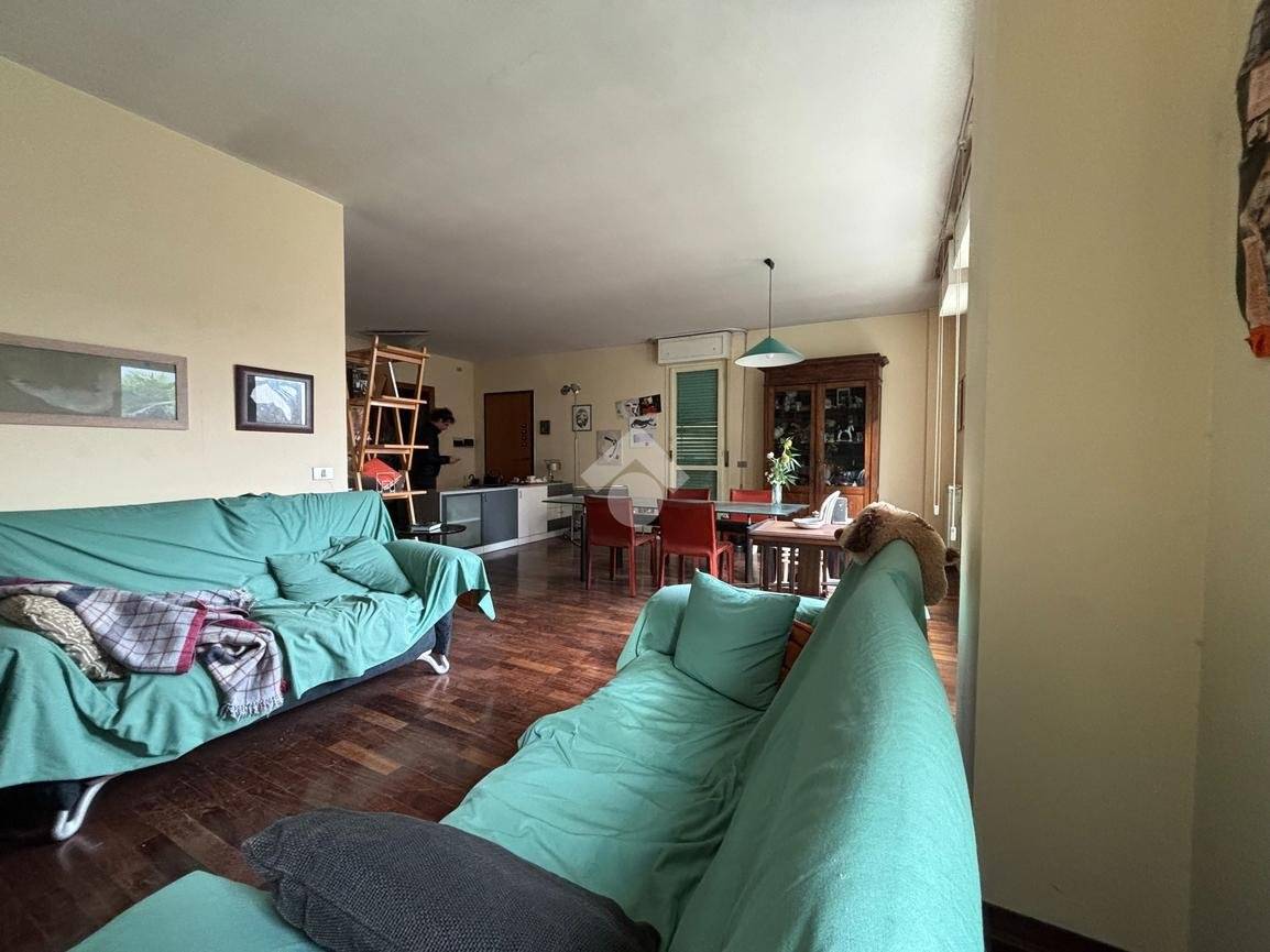 Il soggiorno, ampio e luminosissimo, è il fulcro della casa e si apre su un accogliente terrazzino, ideale per momenti di relax all'aperto.
