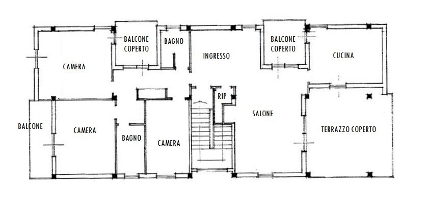 terrazzo coperto di 40 mq, tre camere, doppi servizi, ripostiglio, 2 terrazzini coperti, balcone, ampio garage di 27 mq.
