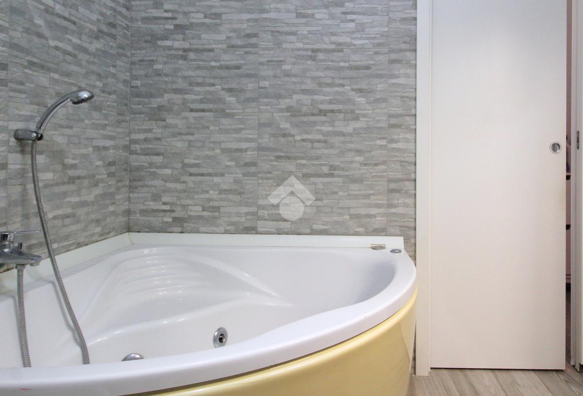 Il bagno principale è elegante e moderno, con vasca idromassaggio angolare, tonalità grigio chiaro e finiture di pregio.