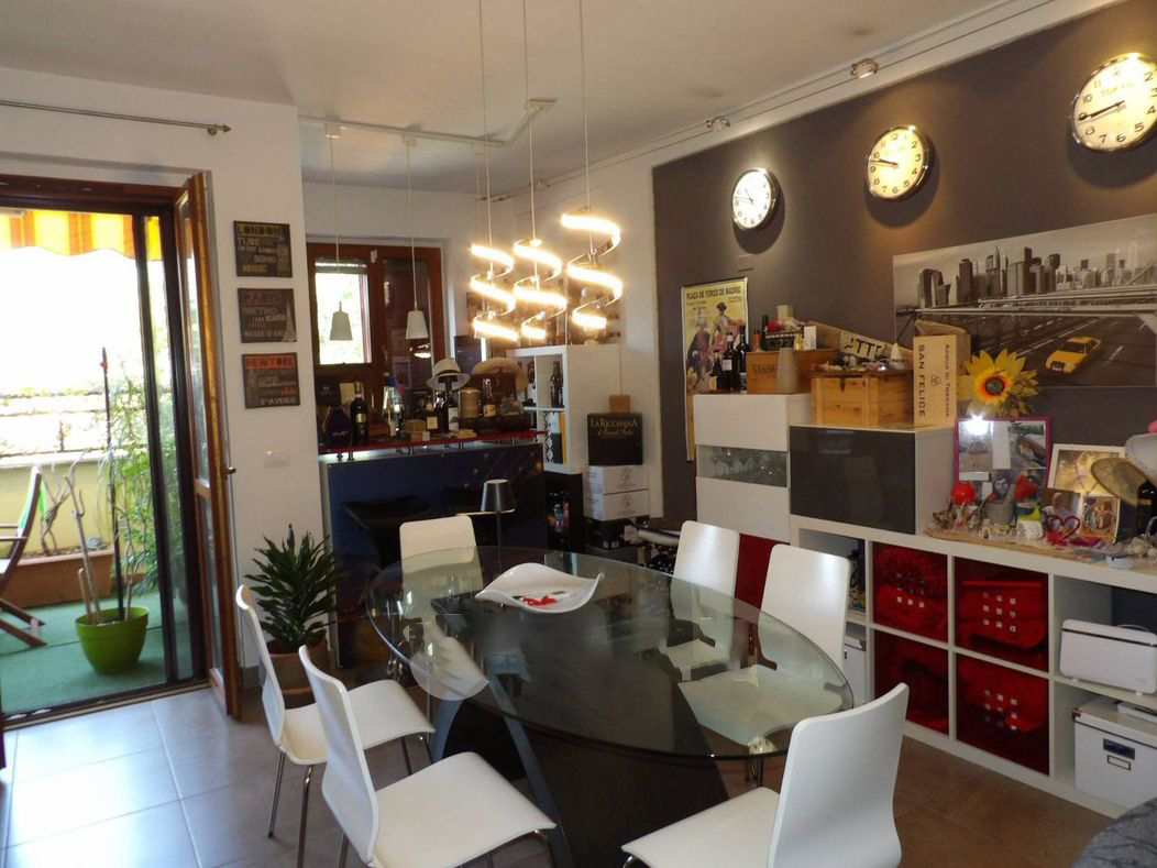Il primo livello accoglie con una luminosa zona giorno composta da salotto, area pranzo e un cucinotto moderno, entrambi con affaccio su un ampio terrazzo, perfetto per vivere momenti conviviali.