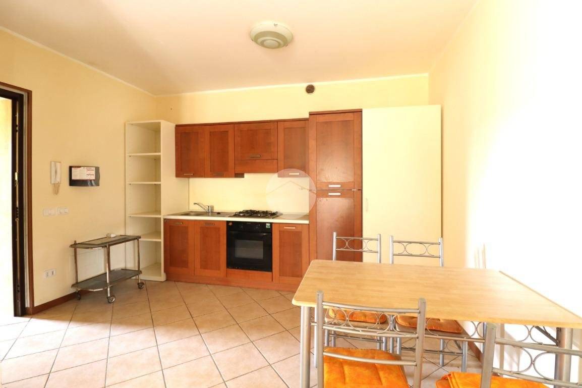 L’ingresso si apre su un soggiorno con angolo cottura, pratico e funzionale.