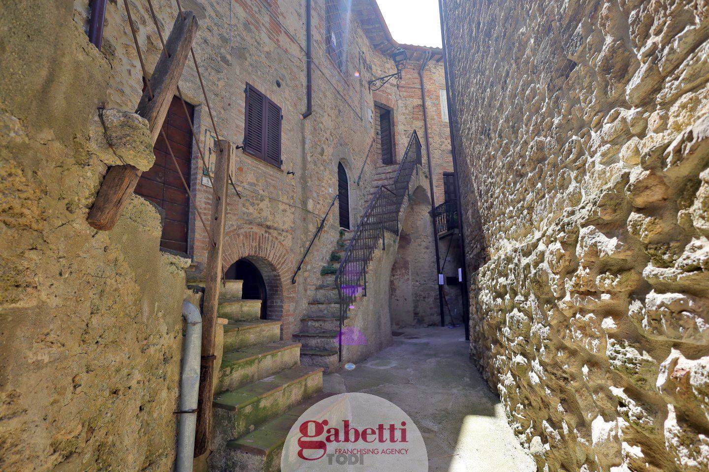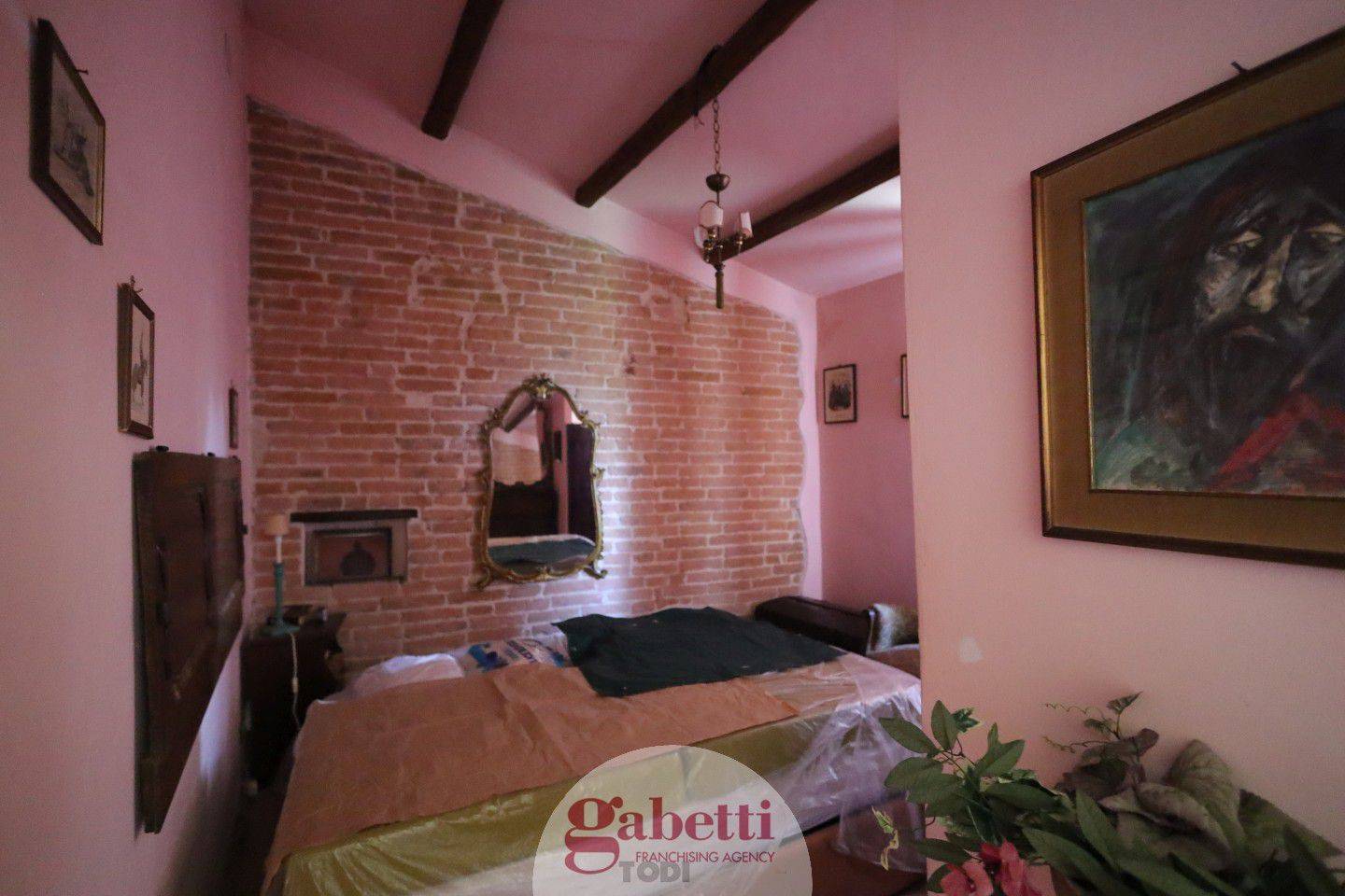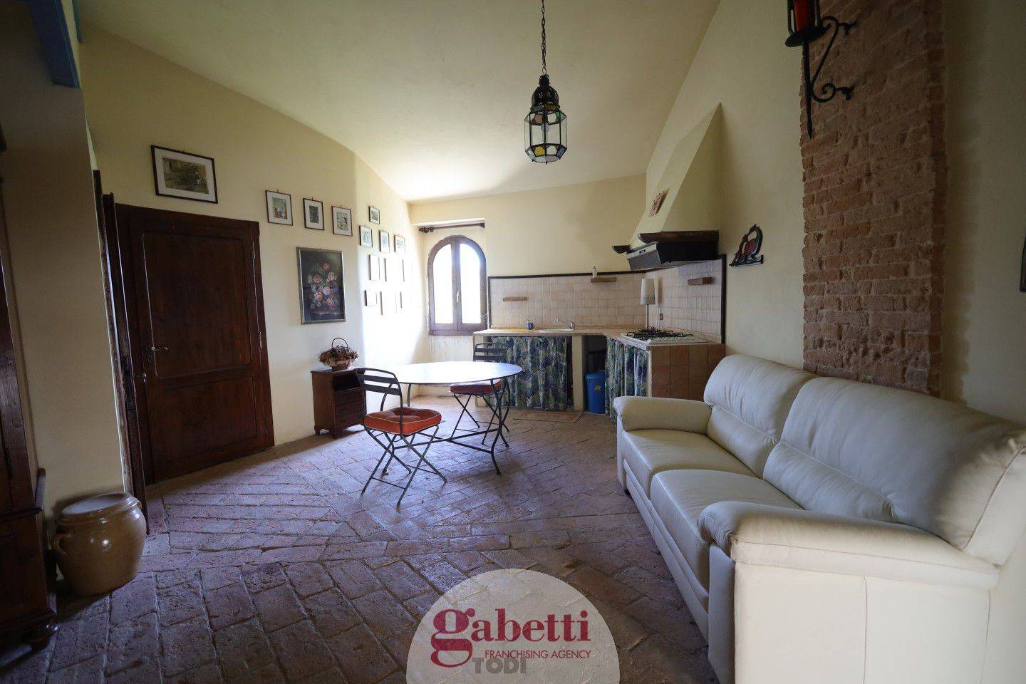 SCOPRILO SUBITODeliziosa proprietà immersa nella tranquillità del centro storico del grazioso borgo di Frontignano, a soli 10 minuti da Todi. L’appartamento, in cui ingresso si trova in un tipico vicoletto, è situato al secondo piano ed ha una superficie di 67 mq. L’ingresso si apre sull’ampio soggiorno, con pavimento in cotto, caratteristico della zona; l’ambiente, luminoso, è reso ancora più affascinante dall’alternanza tra pareti intonacate e con mattoncini a vista, che troviamo tra l’altro anche nelle rifiniture di alcuni dettagli (come ad esempio gli archi sulla scalinata). Tra i mattoncini delle pareti sono state ricavate anche delle nicchie, per rendere più leggero il colpo d’occhio della stanza e creare movimento. Cuore dell’ambiente è il caminetto, posto in un angolo del soggiorno, che crea un perfetto spazio living-relax. La piccola stufa a legna posta al suo fianco rende l'atmosfera ancora più accogliente. Particolare il contrasto tra l’ambiente, così tradizionale, e le travi in metallo a vista, dipinte in maniera diversa proprio per accentuare questa contrapposizione. In continuità col soggiorno, ma leggermente separato dalla conformazione stessa della stanza, troviamo l’angolo cottura, con una essenziale ma luminosa cucina in muratura. Lo spazio può ospitare un tavolo con più sedie, per consumare i pasti comodamente. Dalla cucina si accede sia al bagno che alla camera matrimoniale. Quest’ultima riprende, alle pareti, il leitmotiv della parete con mattoncini e nicchie, che consentono di decorare l’ambiente. Il bagno, adiacente alla camera, è dotato di un muro divisorio per il massimo della privacy, ed è dotato di una comoda vasca da bagno. La vista è di quelle che tolgono il fiato, nel verde delle colline Umbre. Completa la proprietà un fondo, a cui si accede dal piano strada, di circa 27 mq calpestabile Ottimo investimento, perfetto come pied-a-terre o casa vacanze per turisti. I principali centri della zona, dotati di tutti i servizi, sono raggiungibili in 10 minuti, così come la E45. Zona molto tranquilla, ideale per chi cerca un luogo centrale da cui esplorare la Regione, lontano dal caos.