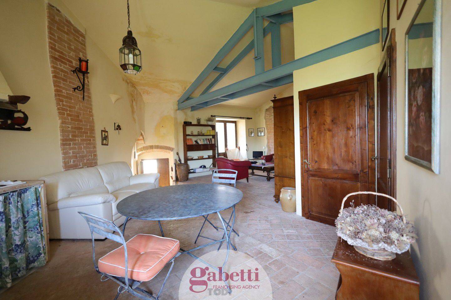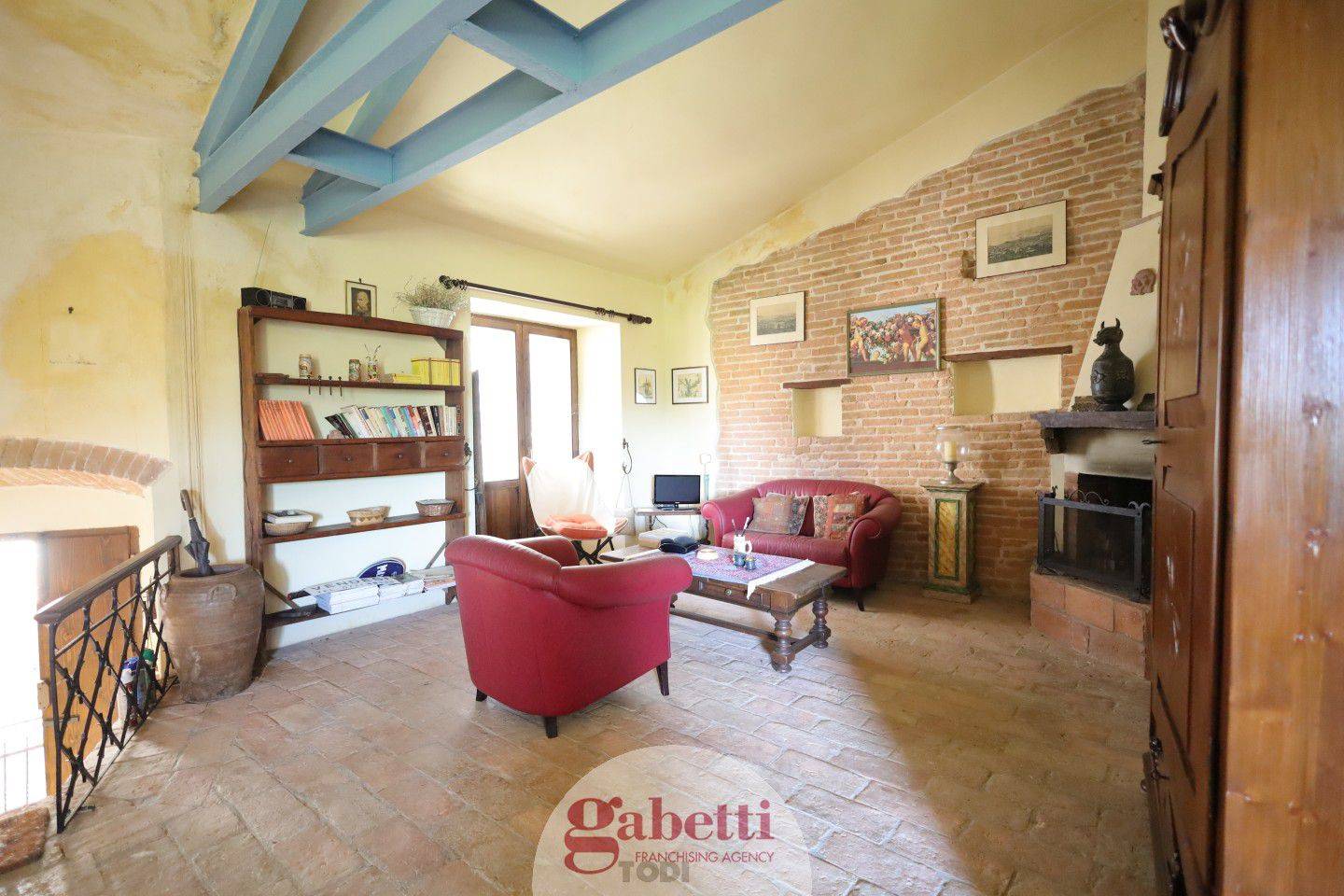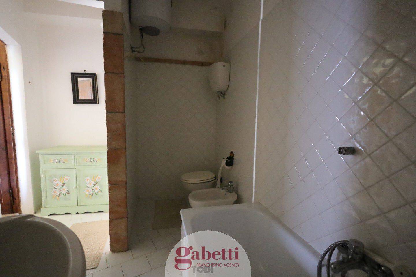 SCOPRILO SUBITODeliziosa proprietà immersa nella tranquillità del centro storico del grazioso borgo di Frontignano, a soli 10 minuti da Todi. L’appartamento, in cui ingresso si trova in un tipico vicoletto, è situato al secondo piano ed ha una superficie di 67 mq. L’ingresso si apre sull’ampio soggiorno, con pavimento in cotto, caratteristico della zona; l’ambiente, luminoso, è reso ancora più affascinante dall’alternanza tra pareti intonacate e con mattoncini a vista, che troviamo tra l’altro anche nelle rifiniture di alcuni dettagli (come ad esempio gli archi sulla scalinata). Tra i mattoncini delle pareti sono state ricavate anche delle nicchie, per rendere più leggero il colpo d’occhio della stanza e creare movimento. Cuore dell’ambiente è il caminetto, posto in un angolo del soggiorno, che crea un perfetto spazio living-relax. La piccola stufa a legna posta al suo fianco rende l'atmosfera ancora più accogliente. Particolare il contrasto tra l’ambiente, così tradizionale, e le travi in metallo a vista, dipinte in maniera diversa proprio per accentuare questa contrapposizione. In continuità col soggiorno, ma leggermente separato dalla conformazione stessa della stanza, troviamo l’angolo cottura, con una essenziale ma luminosa cucina in muratura. Lo spazio può ospitare un tavolo con più sedie, per consumare i pasti comodamente. Dalla cucina si accede sia al bagno che alla camera matrimoniale. Quest’ultima riprende, alle pareti, il leitmotiv della parete con mattoncini e nicchie, che consentono di decorare l’ambiente. Il bagno, adiacente alla camera, è dotato di un muro divisorio per il massimo della privacy, ed è dotato di una comoda vasca da bagno. La vista è di quelle che tolgono il fiato, nel verde delle colline Umbre. Completa la proprietà un fondo, a cui si accede dal piano strada, di circa 27 mq calpestabile Ottimo investimento, perfetto come pied-a-terre o casa vacanze per turisti. I principali centri della zona, dotati di tutti i servizi, sono raggiungibili in 10 minuti, così come la E45. Zona molto tranquilla, ideale per chi cerca un luogo centrale da cui esplorare la Regione, lontano dal caos.