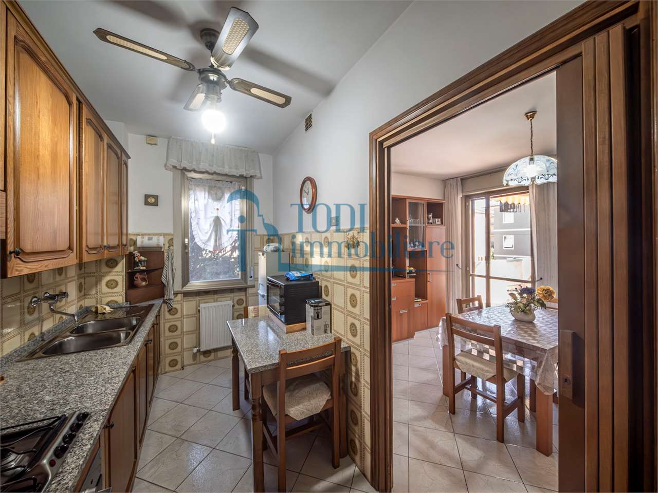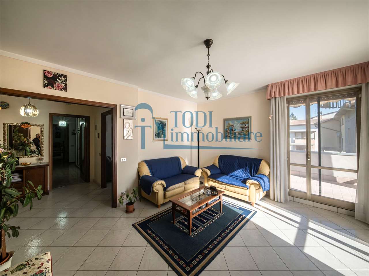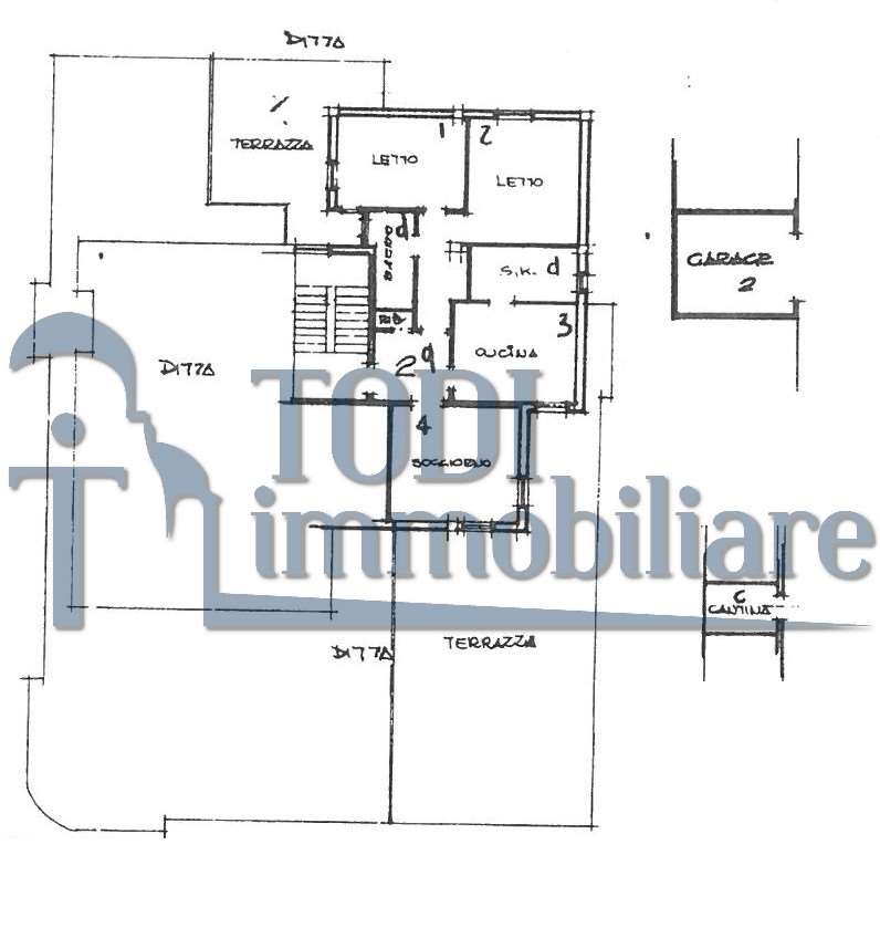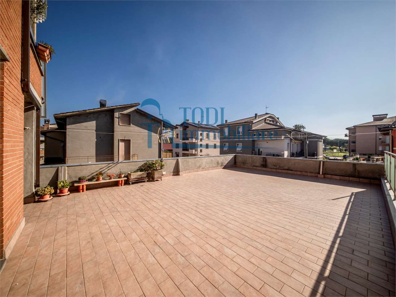 TODI – Pantalla, proponiamo in vendita un appartamento di circa 90 mq situato al piano Primo con due terrazze. \nL\'appartamento è composto da: Ingresso, cucinino, sala da pranzo, soggiorno e un bellissimo terrazzo di circa 40 mq, disimpegno, ripostiglio, due camere matrimoniali di cui con terrazza, bagno, cantina, garage. più spazzi condominiali interni ed esterni.\nLa casa ha ambienti luminosi, inoltre può contare anche su un’ottima esposizione, zona residenziale e vicinissima a tutti i servizi. \nNon perdere l\'occasione di visitare questo immobile. \nContattateci per ulteriori informazioni o per prendere un appuntamento.