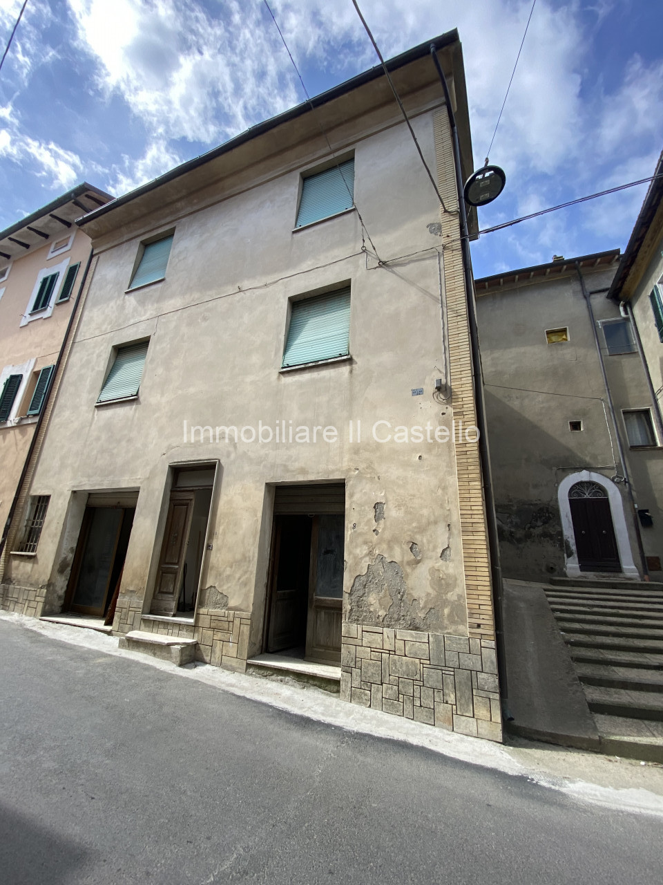 DESCRIZIONE: l'immobile, di circa 138 mq, su tre livelli è così composto: a piano terra troviamo il garage ed un locale commerciale. Tramite una scala esterna saliamo al primo piano composto da ingresso, soggiorno, cucina, camera e ripostiglio, attraverso la stessa scala saliamo al secondo piano dove troviamo due camere matrimoniali, cameretta, bagno e terrazzo, al terzo piano si trova la soffitta.