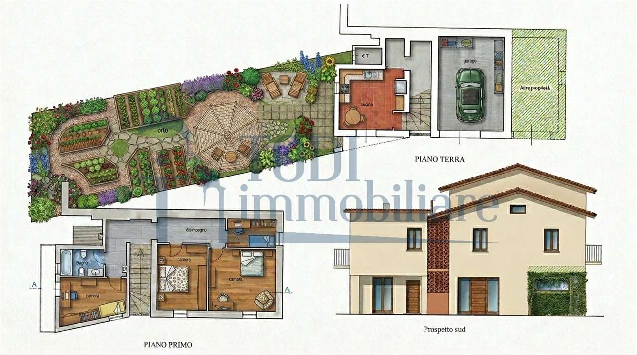 **In Vendita a Todi - Pian Di San Martino: Opportunità Unica!**\n\nScopri questa porzione di casa, situata in una tranquilla zona residenziale, perfetta per chi cerca un rifugio di pace e serenità. Con un piccolo terreno privato, questo immobile è ben servito e offre tutto ciò di cui hai bisogno per vivere comodamente. La casa si sviluppa su due livelli, con un ampio garage al piano terra.\n\nAl piano terra, troverai una cucina/sala e un piccolo ripostiglio, mentre una comoda scala ti porterà al secondo piano che è composto da: cucina con terrazzo perfetto per goderti il sole del mattino, disimpegno, bagno, due camere matrimoniali spaziose e una cameretta/ripostiglio offrono ampi spazi per la tua famiglia o per ospiti.\n\nCompletano la proprietà un piccolo terreno privato con pozzo. Gli ambienti sono luminosi grazie all\'ottima esposizione, rendendo ogni stanza piacevole e calda. Questa soluzione è perfetta per chi desidera vivere in un contesto sereno ma vicino a tutti i servizi. Non perdere l\'occasione di visitare questa proprietà unica. Contattaci per ulteriori informazioni o per fissare un appuntamento!