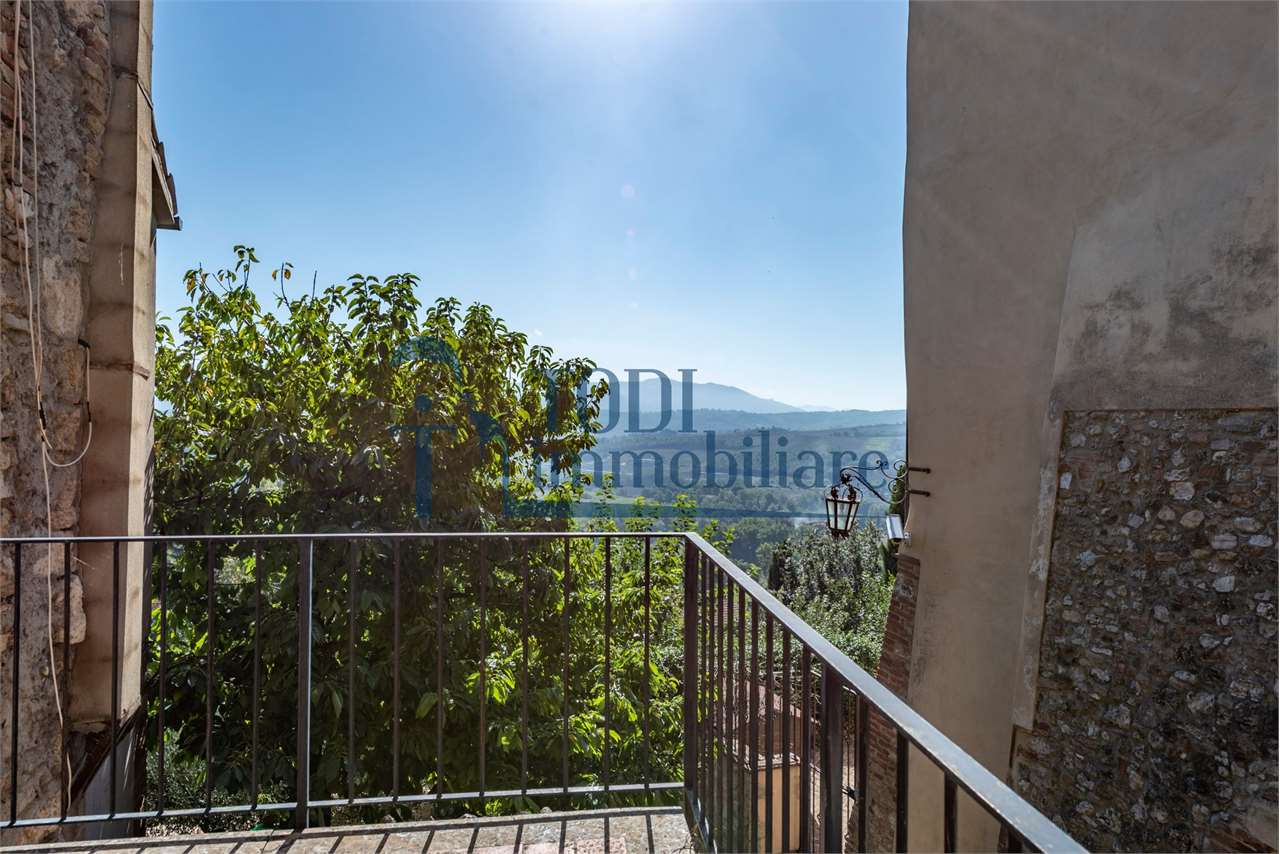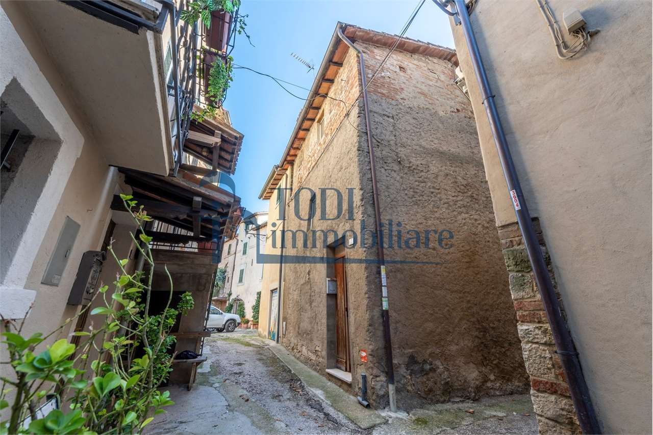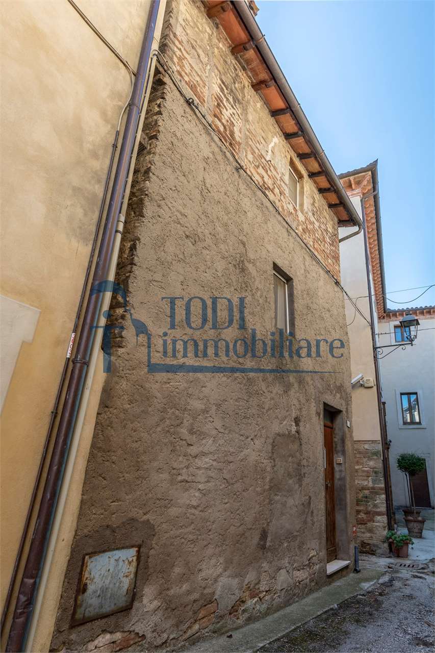Todi - Rosceto, all\'interno di un caratteristico borgo medievale a soli 6 km da Todi, fortificato intorno al 1200 d.c., proponiamo in vendita un immobile Cielo-Terra con ingresso indipendente di circa 100 mq. disposto su tre livelli con terrazzo privato. La proprietà è in condizioni abitabili, al piano terra troviamo una cucina abitabile con camino, bagno e tre magazzini; al piano primo troviamo una camera, bagno e terrazza con vista; al piano secondo troviamo una camera matrimoniale con bagno.\nLa seguente proprietà può essere adibita tranquillamente sia come prima che seconda residenza.
