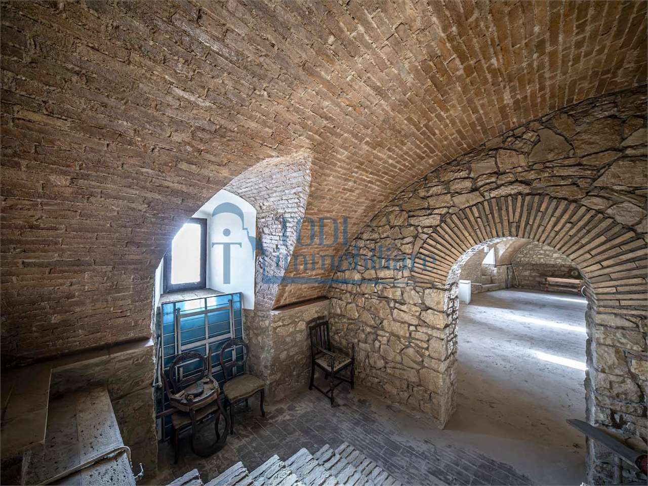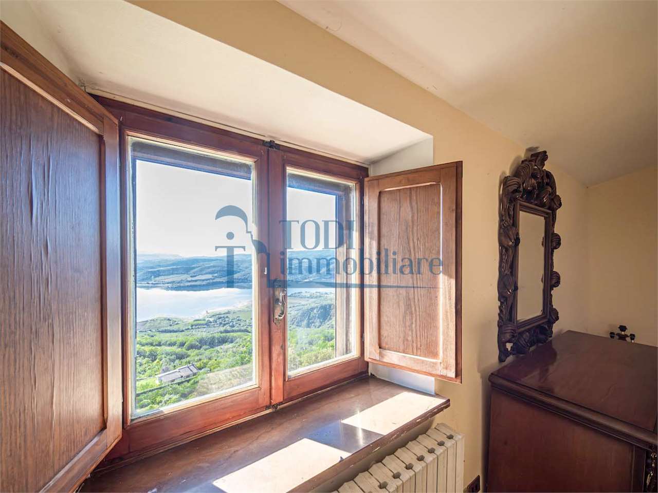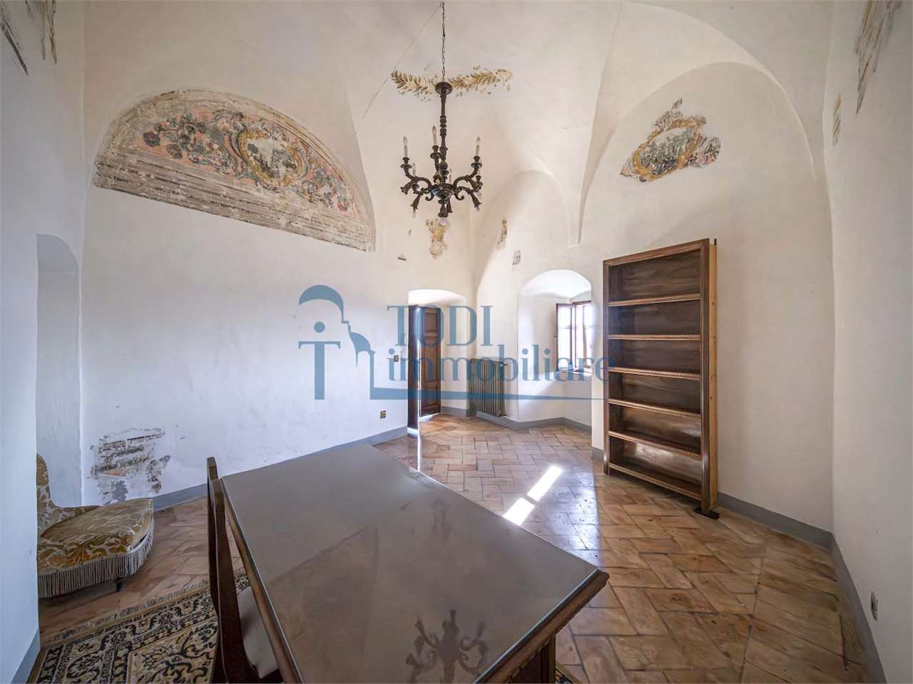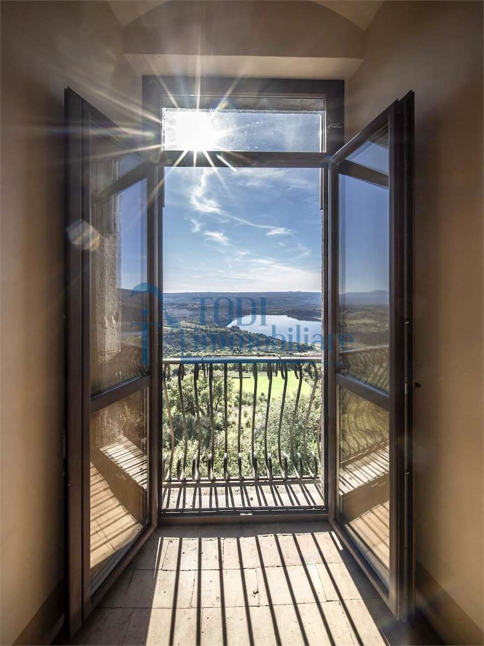 PRESTIGIOSA DIMORA STORICA CON TERRAZZA PANORAMICA SUL LAGO DI CORBARA\nCivitella del Lago – Umbria\n\nNel cuore dell’Umbria più autentica, tra Todi e Orvieto, all’interno dell’incantevole borgo medievale di Civitella del Lago, proponiamo in vendita una straordinaria residenza storica del XV secolo, rara opportunità immobiliare di assoluto pregio.\n\nImmersa in un contesto di quiete e bellezza senza tempo, la proprietà domina il paesaggio circostante offrendo panorami aperti e suggestivi sul Lago di Corbara e sulla Media Valle del Tevere, tra vigneti, oliveti e boschi secolari.\n\nLa dimora, appartenuta alla nobile famiglia tuderte degli Atti, si sviluppa su quattro livelli per una superficie complessiva di circa 550 mq, conservando intatti elementi architettonici originali di grande valore storico e artistico: facciate in pietra, inserti in marmo travertino, soffitti affrescati, camini monumentali, volte a vela e ambienti di rara eleganza.\n\nIl collegamento tra i piani avviene tramite una raffinata scala interna in marmo Rosso di Prodo, elemento distintivo che accompagna il percorso attraverso spazi ampi, luminosi e scenografici.\n\nDistribuzione degli ambienti:\n\nPiano Terra\nImportante ingresso di rappresentanza con doppio accesso, cucina abitabile, studio con soffitti affrescati, bagno e un maestoso salone panoramico con camino ottocentesco in marmo travertino, soffitti con volte a vela e grandi finestre che incorniciano il paesaggio umbro.\n\nPiano Primo\nZona notte con due camere matrimoniali e due bagni, ideale come piano padronale o area ospiti.\n\nPiano Secondo\nAmpia zona living con cucina abitabile, grande salone con camino e accesso diretto al terrazzo panoramico a pozzo, autentico gioiello della proprietà. Il piano ospita inoltre quattro camere matrimoniali e due bagni, rendendolo perfetto per accogliere famiglia e ospiti in totale comfort.\n\nPiano Seminterrato\nAffascinante salone in pietra con volta a botte in mattoncini, affacci panoramici sorprendenti, cantina e accesso diretto alla corte esterna esclusiva, ideale per momenti conviviali o degustazioni private.\n\nValore storico e unicità\n\nLa dimora è situata all’interno del prestigioso Cortile degli Atti, nel cuore del centro storico, con accesso dall’iconico Arco di Diomede, edificato da Diomede degli Atti, nobile tuderte e rettore della Chiesa di Santa Maria. Un contesto di assoluta riservatezza e fascino, riservato a poche proprietà di grande valore storico.\n\nCompleta la proprietà un terreno privato di circa 1.300 mq, con accesso diretto dalla residenza, elemento raro per un immobile all’interno di un borgo medievale.\n\nUna residenza esclusiva\n\nQuesta dimora rappresenta la soluzione ideale come:\n\nresidenza privata di prestigio\n\ndimora di rappresentanza\n\nresidenza per ospitalità di alto livello\n\ninvestimento immobiliare di valore storico e patrimoniale\n\nUn’opportunità unica per chi desidera vivere o investire in una residenza senza tempo, dove storia, panorama e lusso discreto si fondono in un’esperienza abitativa irripetibile.
