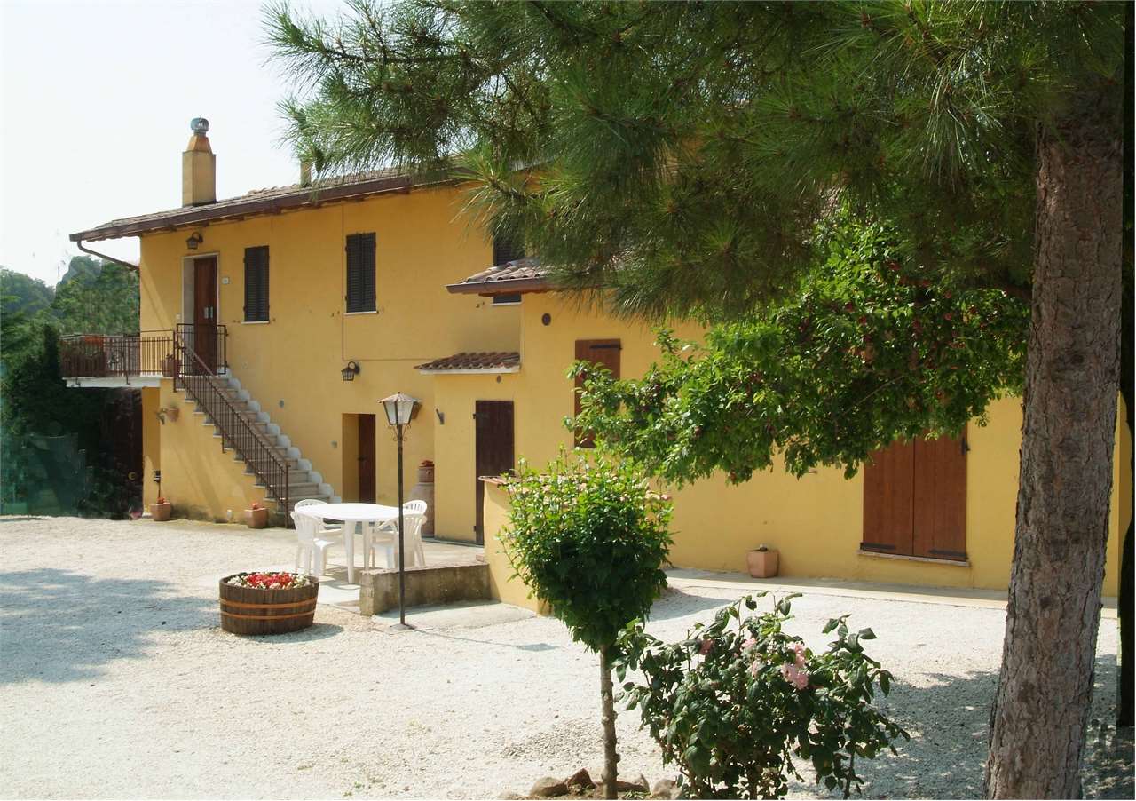 A 15 km minuti da Perugia, Todi e a soli 3 minuti dal paese di Deruta famoso per la sua arte della maiolica, in posizione dominiante, Casale di complessivi mq 275 circa oltre a parco con piscina.\nIl casale è composto da 2 soggiorni con rispettive cucine, 5 camere e 5 bagni completamente arredati, più locali tecnici e fondi.\nAll\'esterno ha una corte di 1500 mq completamente recintata, adibita quasi tutta a giardino, molto curato, con un pozzo barbecue murato e piscina con solarium. Completano la proprietà una fonte di acqua potabile collegata al casale in grado di soddisfare tutte le sue esigenze e 128 metri cubi di possibilità edificatoria per ampliamento.\nQuesto casale da 20 anni è adibito ad attività ricettiva, ben funzionante con clientela italiana ma soprattutto estera e quindi la sua potenzialità di utilizzo è sia come struttura ricettiva e abitazione oppure solo come residenza privata.\nAdiacente al casale possibilità di acquistare o affittare per chi lo desiderasse ulteriori 2,7 di terreno agricolo seminativo con 60 piante di ulivo e un piccolo vigneto.\nPer info telfonare al 335 7754960 Mirco