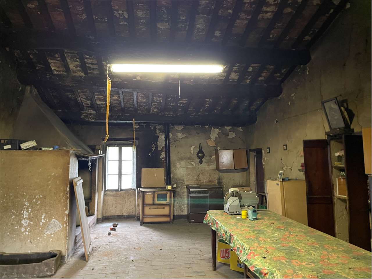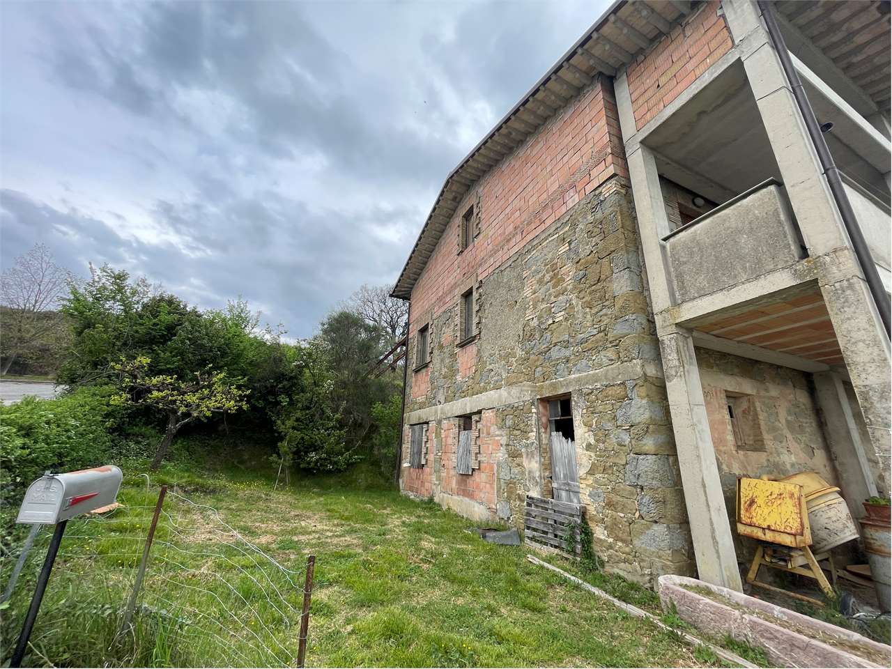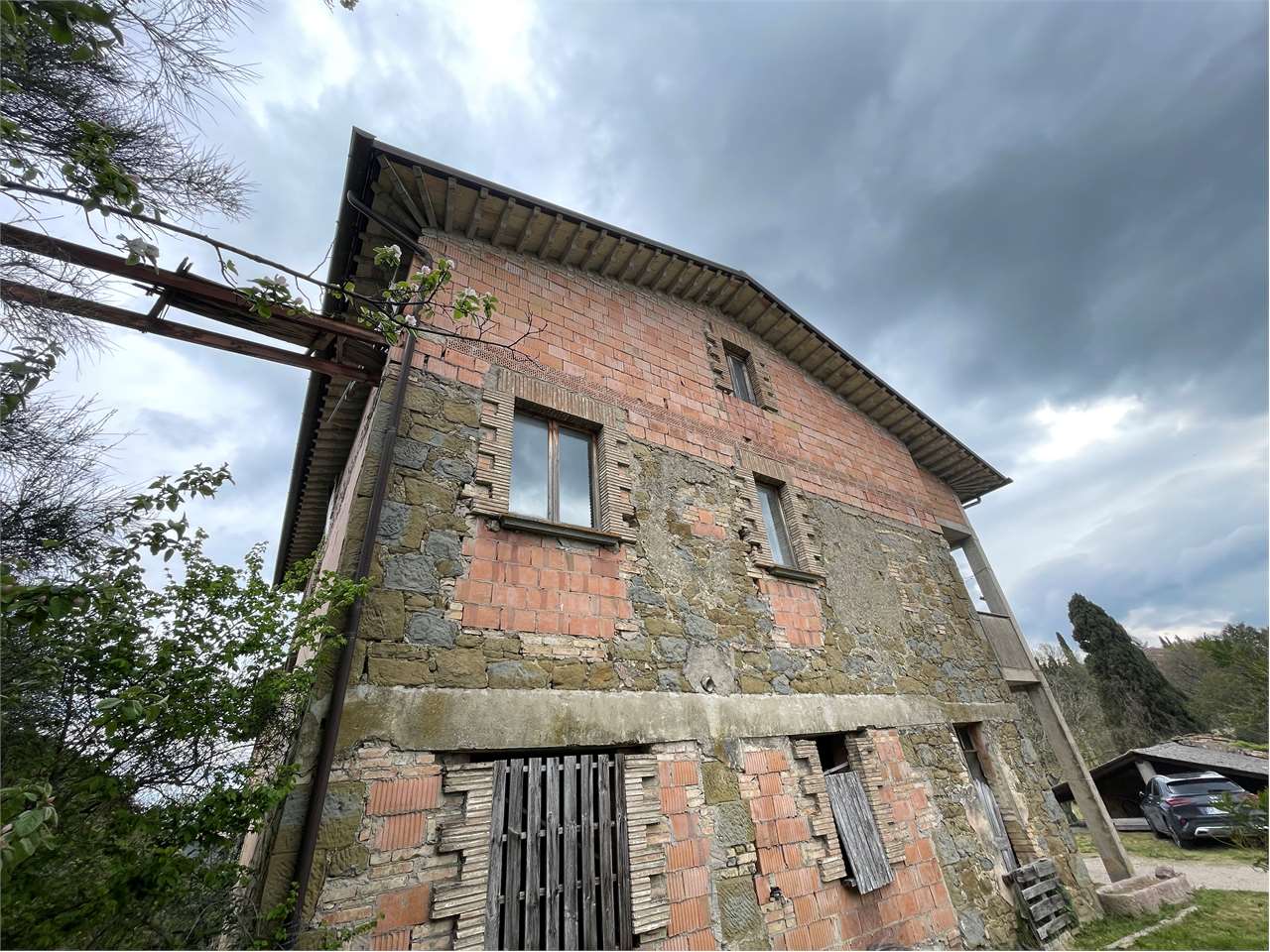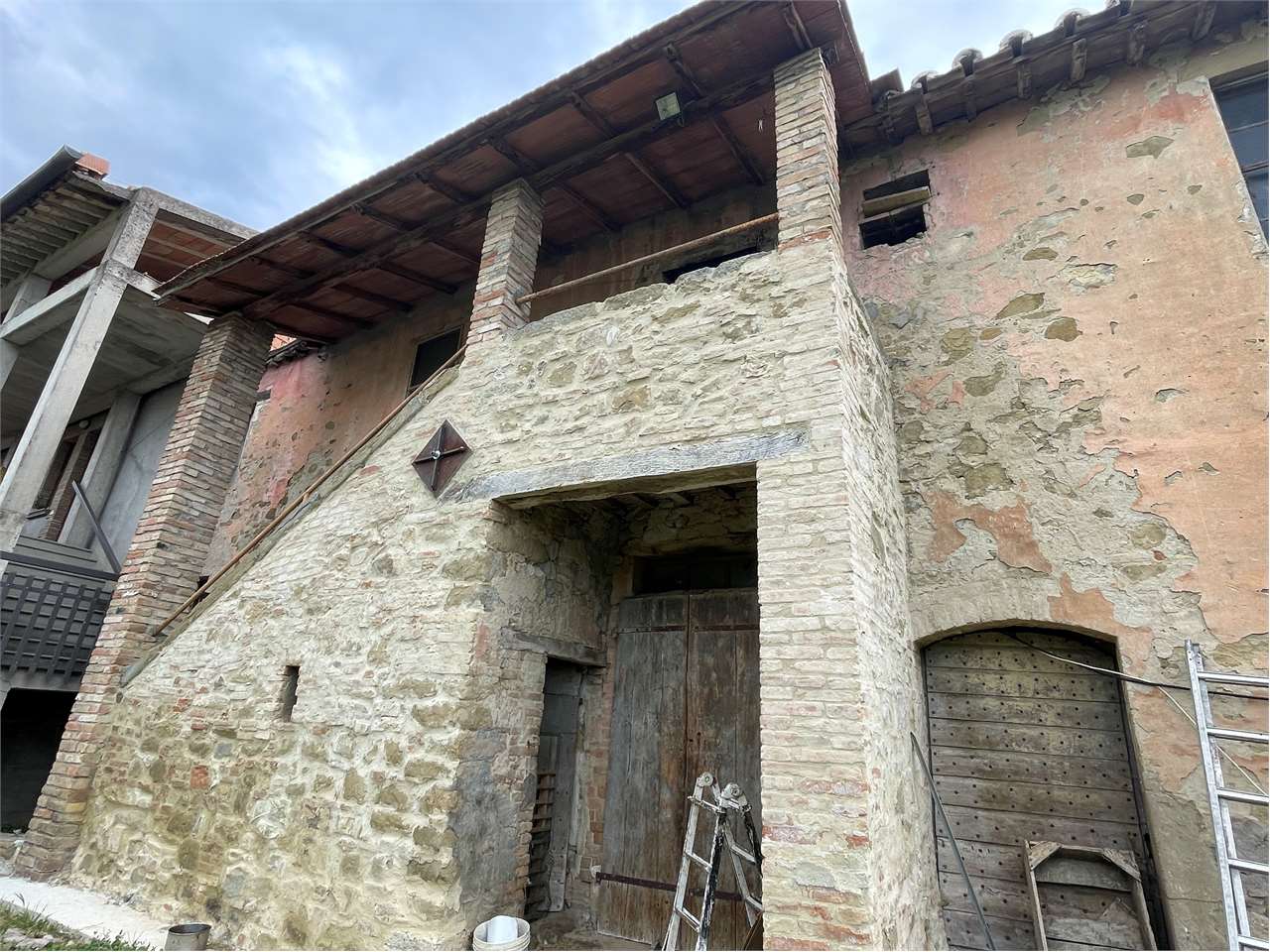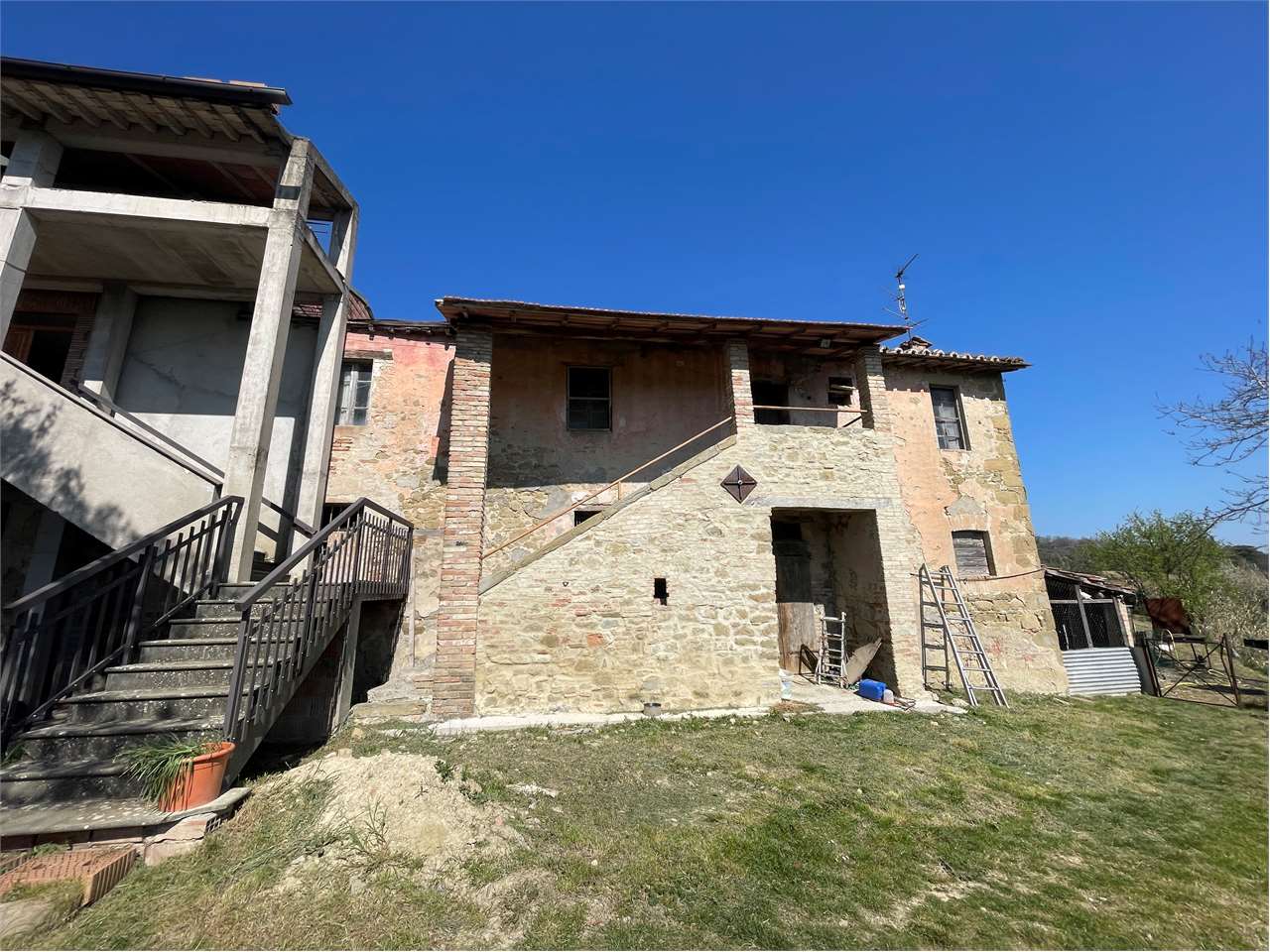 Perugia, località Poggio Pelliccione, collina sovrastante Ponte Rio, a 4 km dal centro storico del capoluogo, a 14 km da Assisi, a 12 km dall\'aeroporto San Francesco d\'Assisi e a 3 Km dall\'ingresso della quattro corsie, in posizione dominante, disponiamo di casale, disposto su due livelli, di mq 490 ca., circondato da circa 5.000 mq di terreno, con possibilità di acquistare a parte altri 14 ettari di terreno, (10 Ha seminativo e 4 Ha bosco), al prezzo da concordare in base alla metratura. \n\nIl casale è stato in parte ristrutturato nel 1990. Alzato di un piano di mq 125 ca. mansardato ad uso soffitta(attualmente senza accesso), costruita la scala in cemento armato, rifatto il tetto con guina. Nella parte vecchia sono state messe le chiavi anti sismiche. Rifatti gli impianti i pavimenti e i bagni dell\'appartamento al primo piano. \n\nIl casale è costituito da tre subalterni costituiti da:\n\n? Appartamento di mq 225 ca. composto di: Soggiorno con camino e angolo cottura facilmente divisibile, 6 camere e due bagni al piano primo, oltre fondi al piano terra.\n? Fienile posto al piano terra, di mq 100 ca. e con altezza di metri 2,70 \n? Porzione del casale da ristrutturare di mq 165 ca. composto di: salone con camino, due camere e bagno al piano primo, oltre fondo, magazzino e cantina al piano terra.\n\nFiniture: Nell\'appartamento ristrutturato le porte sono in legno, gli infissi in legno con vetro doppi senza persiane, i pavimenti sono in monocottura; il riscaldamento con idrocamino, mentre il piano cottura con bombola a gas. La rete del metano passa lungo la strada principale a circa 15 metri dal casale. Il casale è allacciato alla conduttura dell\'acqua pubblica, nella proprietà c\'è anche il pozzo. \n\nCompleta la proprietà un annesso agricolo, il cui costo è a parte, in quanto, trovandosi ad una distanza dal casale inferiore a 50 metri, è possibile ristrutturare chiedendo il cambio d\'uso in abitazione civile. \nLa proprietà dispone di 14 ettari di terreno e valuta proposte inerenti tale fabbricato con annesso terreno da frazionare a seconda delle esigenze.\nTutti i dati indicati relativi all\'immobile sono stati forniti in buona fede dal proprietario e non costituiscono elemento contrattuale, pertanto l’agente immobiliare non si assume nessuna responsabilità.\n\nPer maggiori informazioni contattare Michele Merli 335.56.36.517\n\nPrezzo € 260.000 \nClasse energetica : “G” I.P.E. 281,850 Kwh/mq annuo
