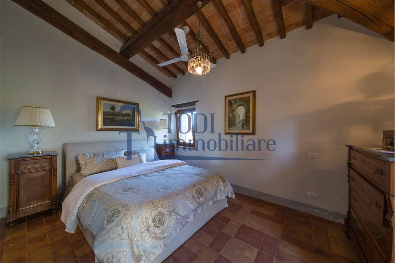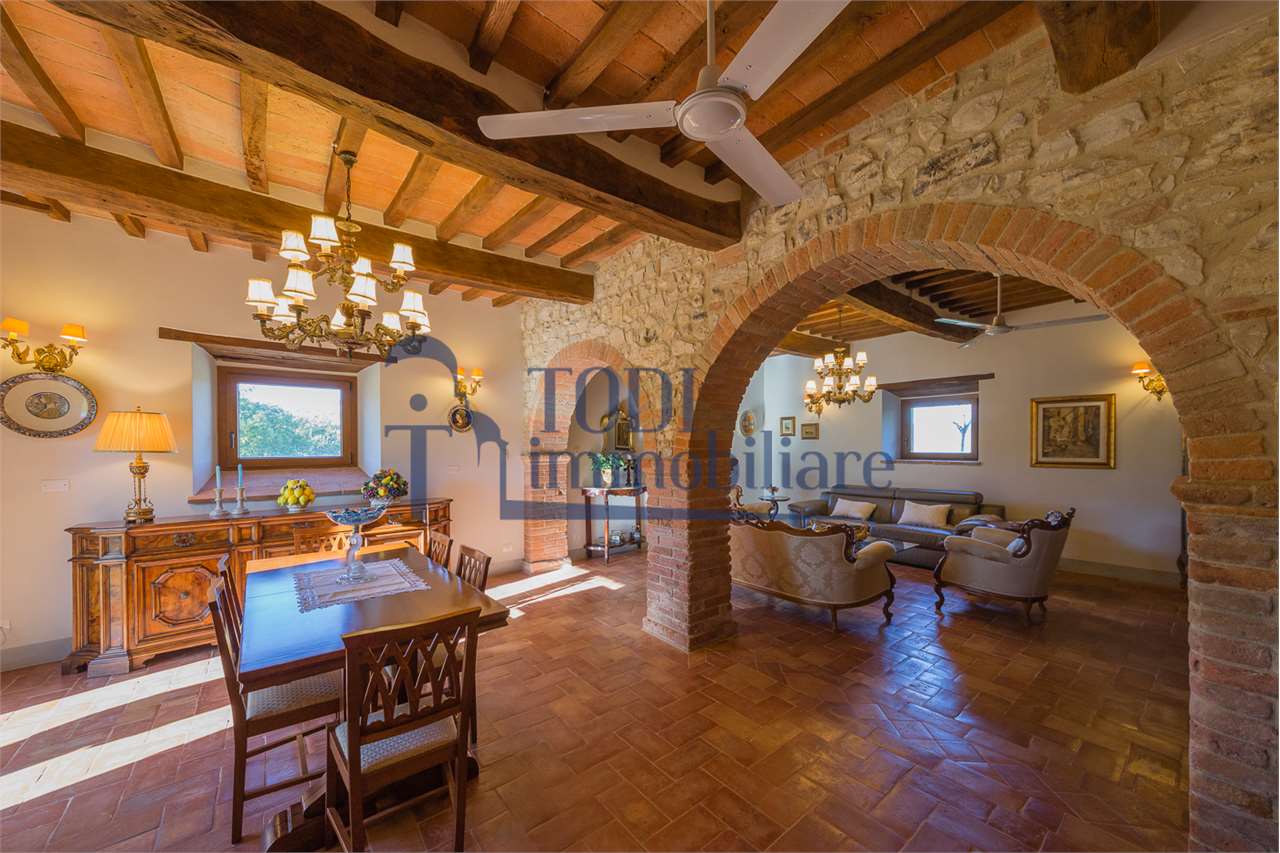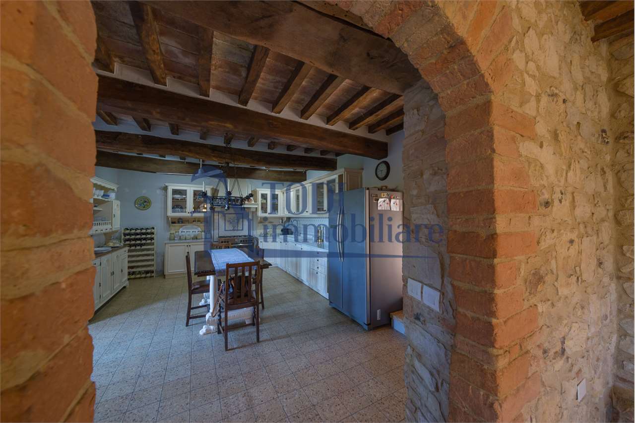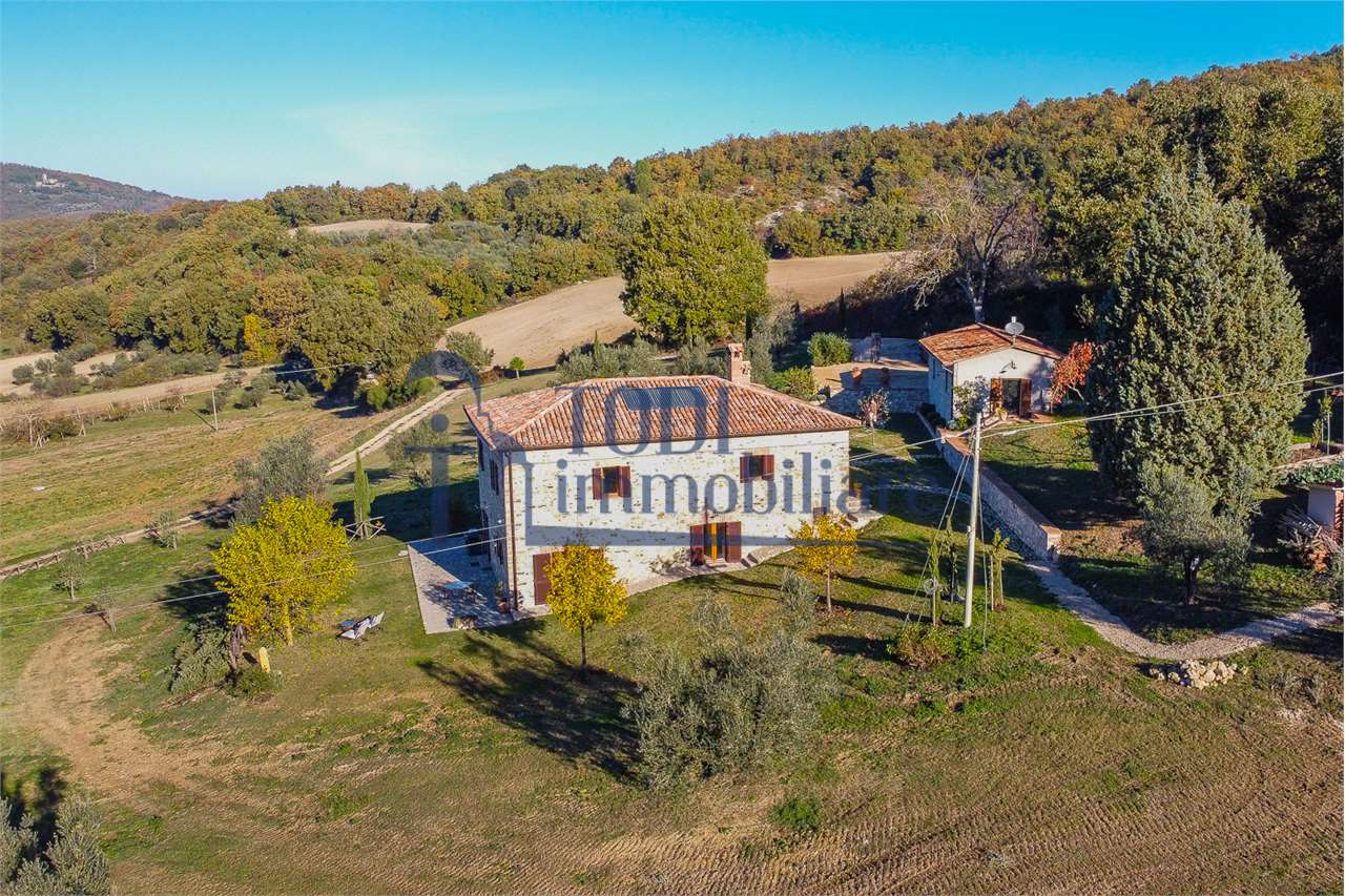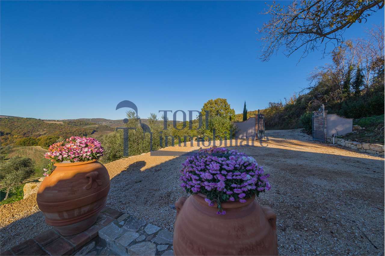 Meravigliosa residenza di campagna situata nel comune di Todi. La proprietà é completamente ristrutturata ed é subito abitabile. \nLa parte abitativa é costituita da un caratteristico e bellissimo casale del 1800 disposto su due piani. \nAl piano terra abbiamo una grande cucina abitabile, un doppio salone con i caratteristici archi delle vecchie stalle, lavanderia, bagno di servizio e locale tecnico.\nAl piano primo abbiamo un disimpegno, un soggiorno-studio con camino, 2 bagni e 4 camere matrimoniali.\nE\' presente un annesso adibito a garage e laboratorio attrezzi con ingresso carrabile e pedonale.\nInoltre é anche presente ulteriore piccolo annesso da recuperare e ristrutturare.\nConclude la proprietà il terreno esclusivo di 14.000 Mq adibito in parte a giardino, in parte ad orto, in parte con possibilità di essere coltivato e con circa 50 piante di olivo.\nL\'ampio spazio esterno permette la costruzione di una piscina con solarium e tutte le relative pertinenze.\nChiamaci per un appuntamento e ulteriori informazioni.