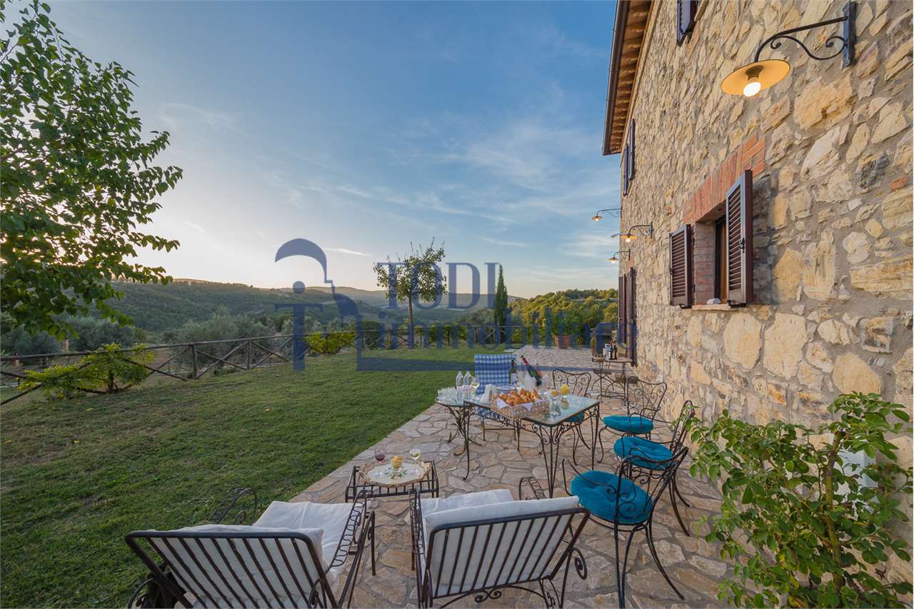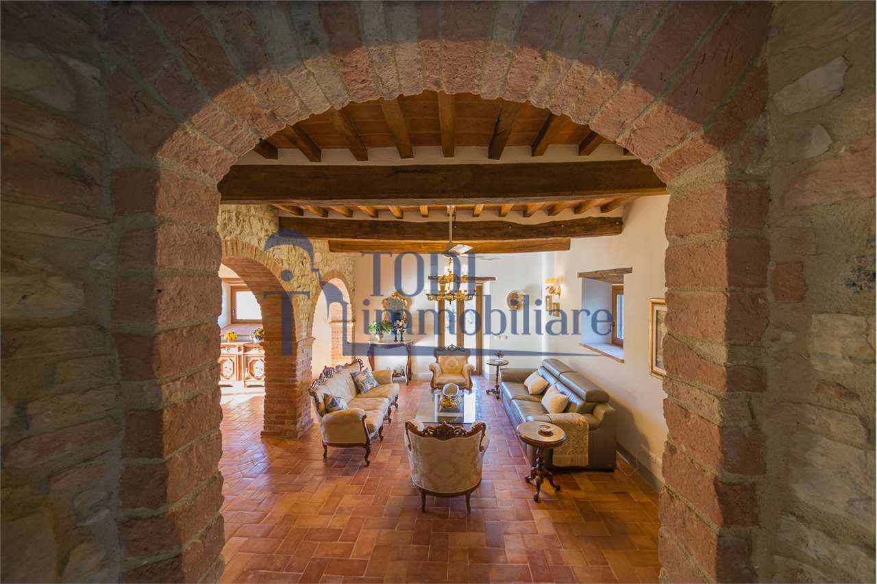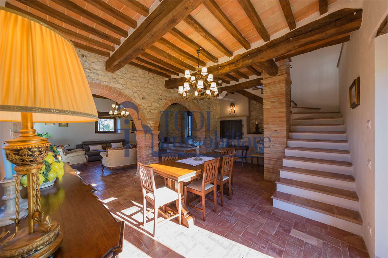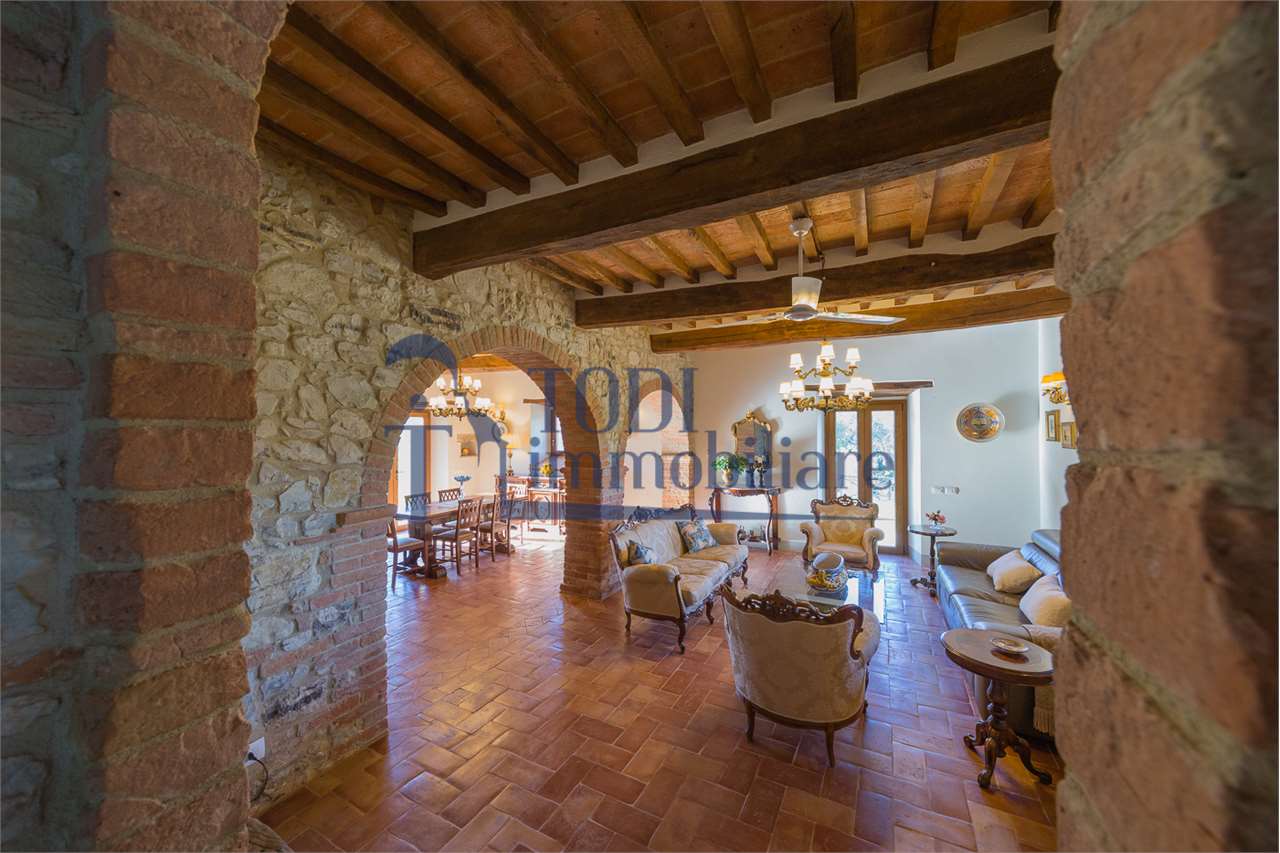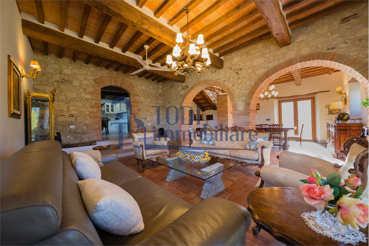 Meravigliosa residenza di campagna situata nel comune di Todi. La proprietà é completamente ristrutturata ed é subito abitabile. \nLa parte abitativa é costituita da un caratteristico e bellissimo casale del 1800 disposto su due piani. \nAl piano terra abbiamo una grande cucina abitabile, un doppio salone con i caratteristici archi delle vecchie stalle, lavanderia, bagno di servizio e locale tecnico.\nAl piano primo abbiamo un disimpegno, un soggiorno-studio con camino, 2 bagni e 4 camere matrimoniali.\nE\' presente un annesso adibito a garage e laboratorio attrezzi con ingresso carrabile e pedonale.\nInoltre é anche presente ulteriore piccolo annesso da recuperare e ristrutturare.\nConclude la proprietà il terreno esclusivo di 14.000 Mq adibito in parte a giardino, in parte ad orto, in parte con possibilità di essere coltivato e con circa 50 piante di olivo.\nL\'ampio spazio esterno permette la costruzione di una piscina con solarium e tutte le relative pertinenze.\nChiamaci per un appuntamento e ulteriori informazioni.