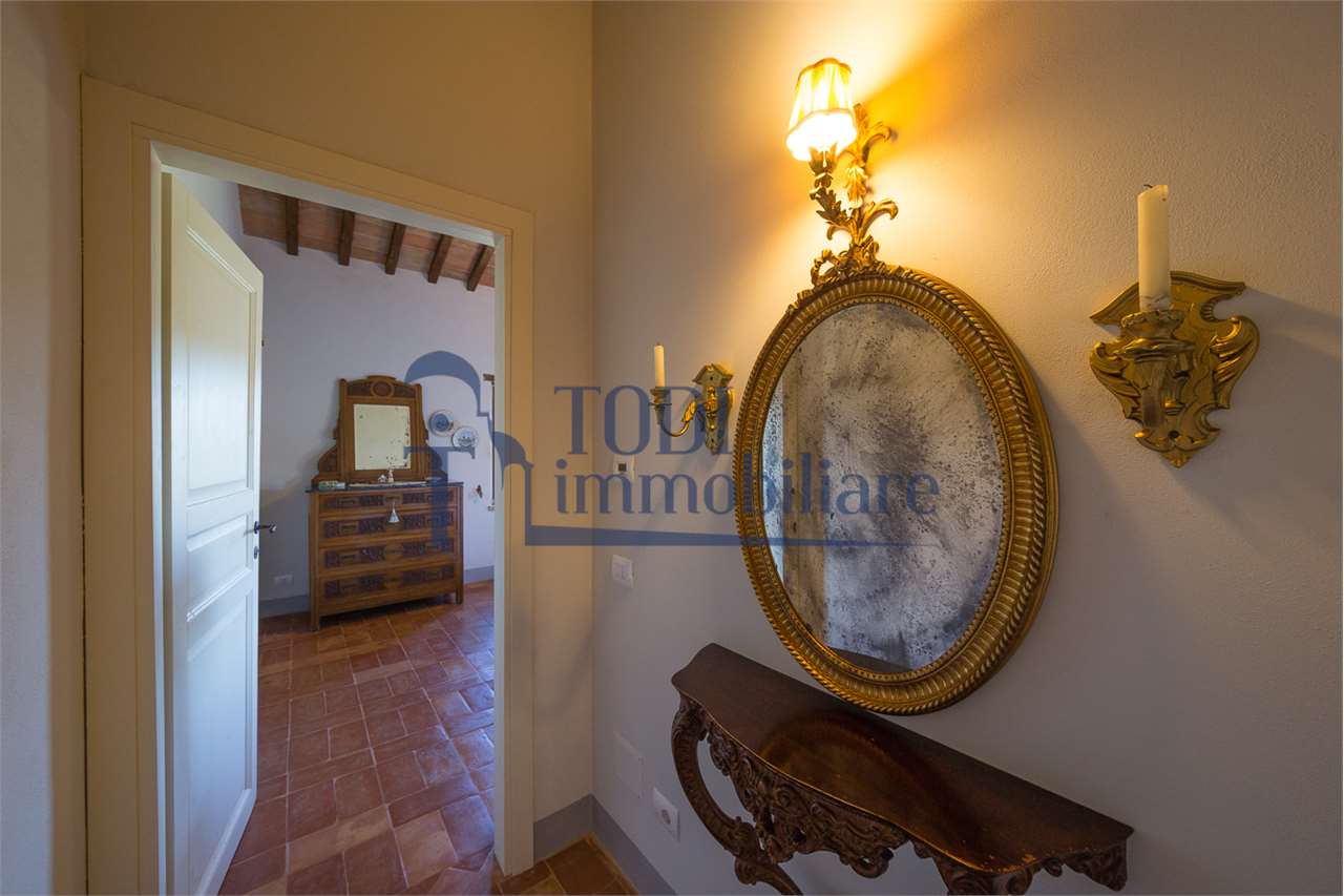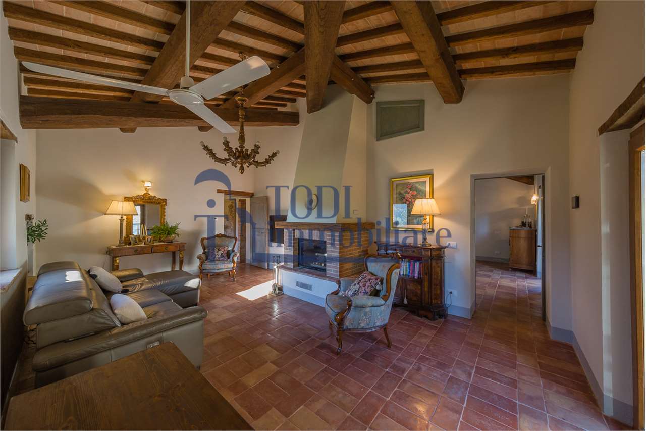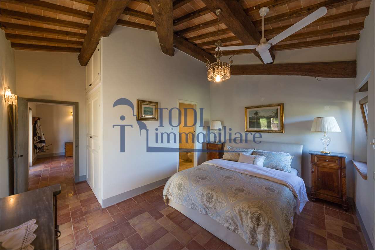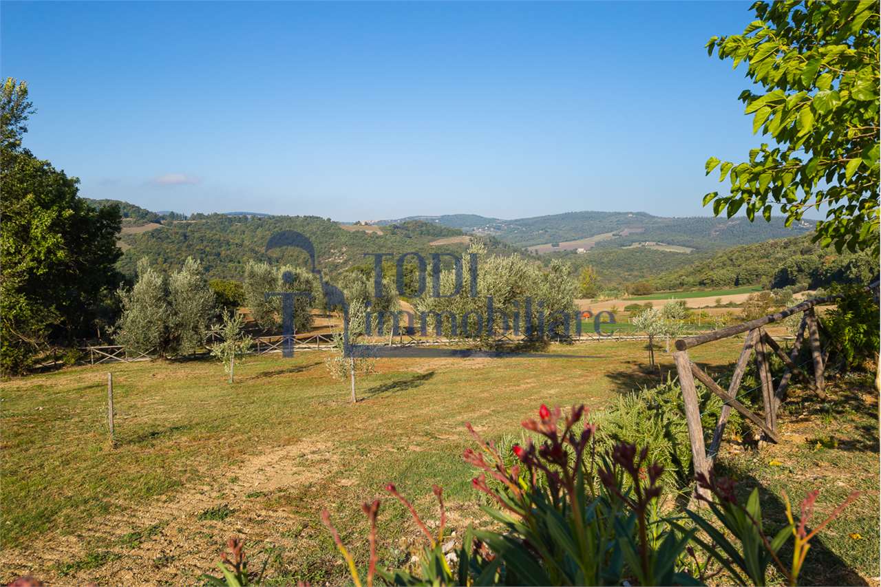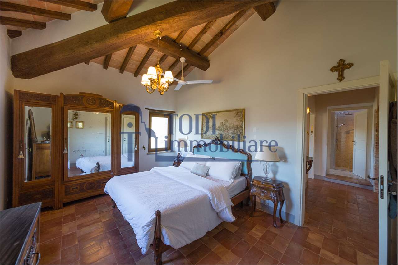 Meravigliosa residenza di campagna situata nel comune di Todi. La proprietà é completamente ristrutturata ed é subito abitabile. \nLa parte abitativa é costituita da un caratteristico e bellissimo casale del 1800 disposto su due piani. \nAl piano terra abbiamo una grande cucina abitabile, un doppio salone con i caratteristici archi delle vecchie stalle, lavanderia, bagno di servizio e locale tecnico.\nAl piano primo abbiamo un disimpegno, un soggiorno-studio con camino, 2 bagni e 4 camere matrimoniali.\nE\' presente un annesso adibito a garage e laboratorio attrezzi con ingresso carrabile e pedonale.\nInoltre é anche presente ulteriore piccolo annesso da recuperare e ristrutturare.\nConclude la proprietà il terreno esclusivo di 14.000 Mq adibito in parte a giardino, in parte ad orto, in parte con possibilità di essere coltivato e con circa 50 piante di olivo.\nL\'ampio spazio esterno permette la costruzione di una piscina con solarium e tutte le relative pertinenze.\nChiamaci per un appuntamento e ulteriori informazioni.