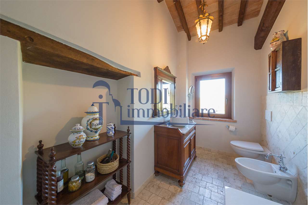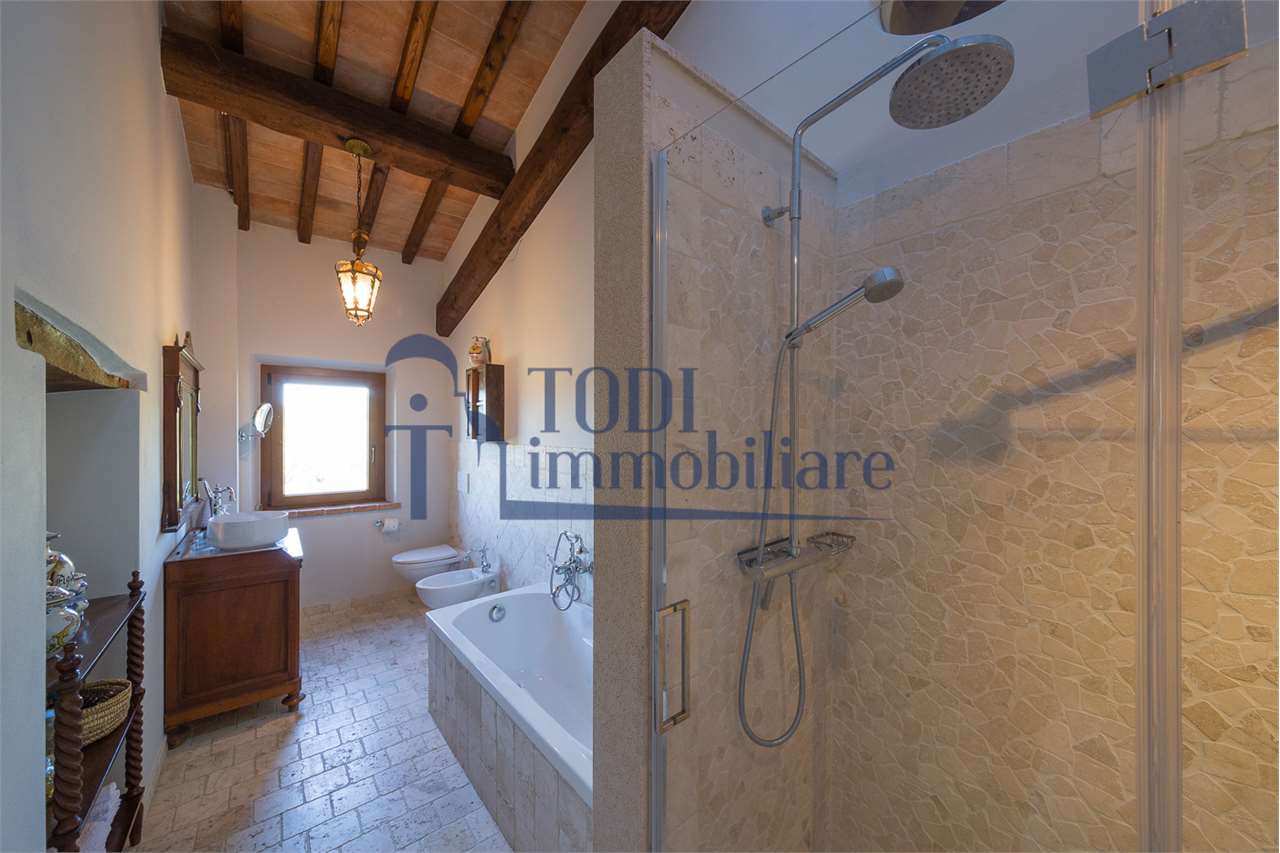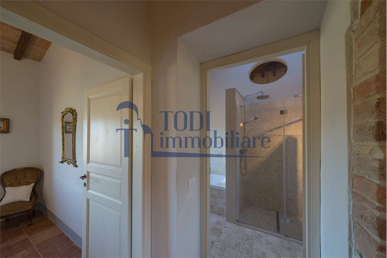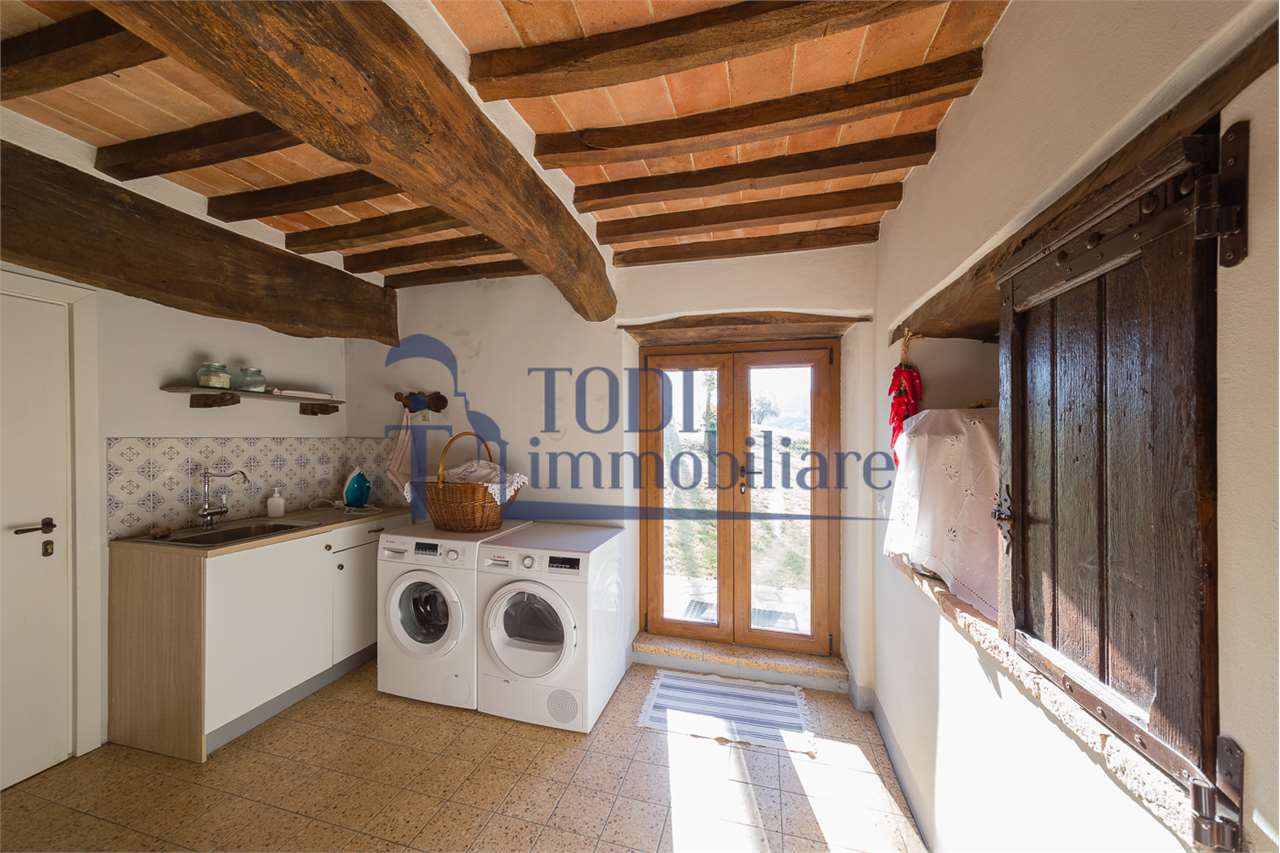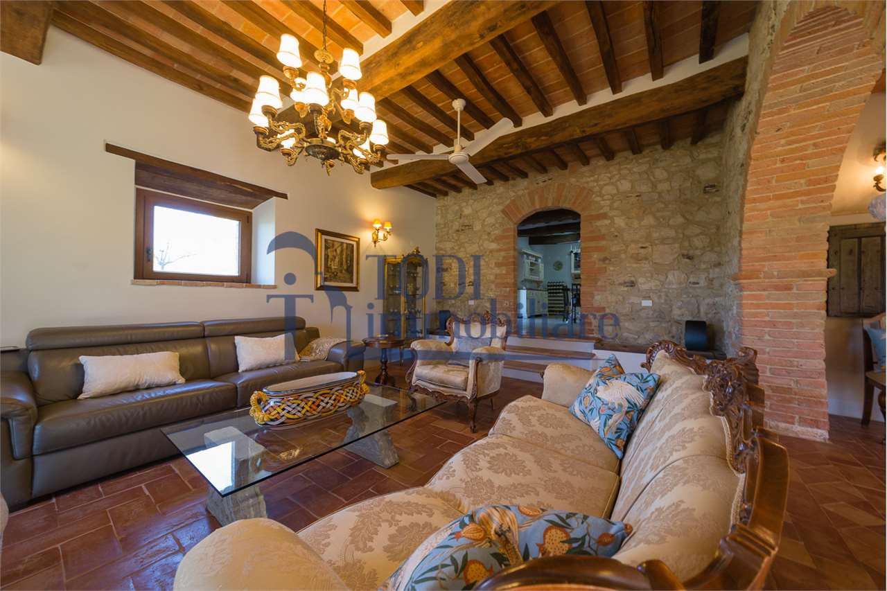 Meravigliosa residenza di campagna situata nel comune di Todi. La proprietà é completamente ristrutturata ed é subito abitabile. \nLa parte abitativa é costituita da un caratteristico e bellissimo casale del 1800 disposto su due piani. \nAl piano terra abbiamo una grande cucina abitabile, un doppio salone con i caratteristici archi delle vecchie stalle, lavanderia, bagno di servizio e locale tecnico.\nAl piano primo abbiamo un disimpegno, un soggiorno-studio con camino, 2 bagni e 4 camere matrimoniali.\nE\' presente un annesso adibito a garage e laboratorio attrezzi con ingresso carrabile e pedonale.\nInoltre é anche presente ulteriore piccolo annesso da recuperare e ristrutturare.\nConclude la proprietà il terreno esclusivo di 14.000 Mq adibito in parte a giardino, in parte ad orto, in parte con possibilità di essere coltivato e con circa 50 piante di olivo.\nL\'ampio spazio esterno permette la costruzione di una piscina con solarium e tutte le relative pertinenze.\nChiamaci per un appuntamento e ulteriori informazioni.