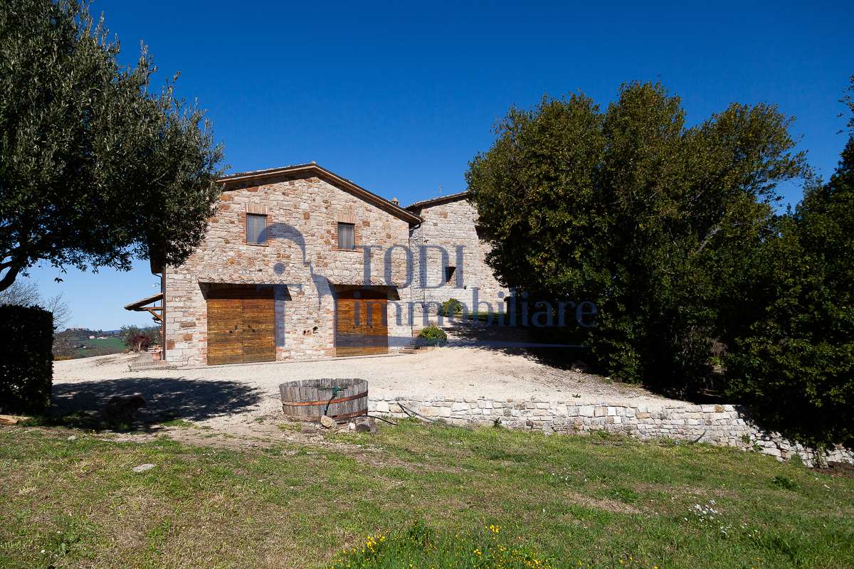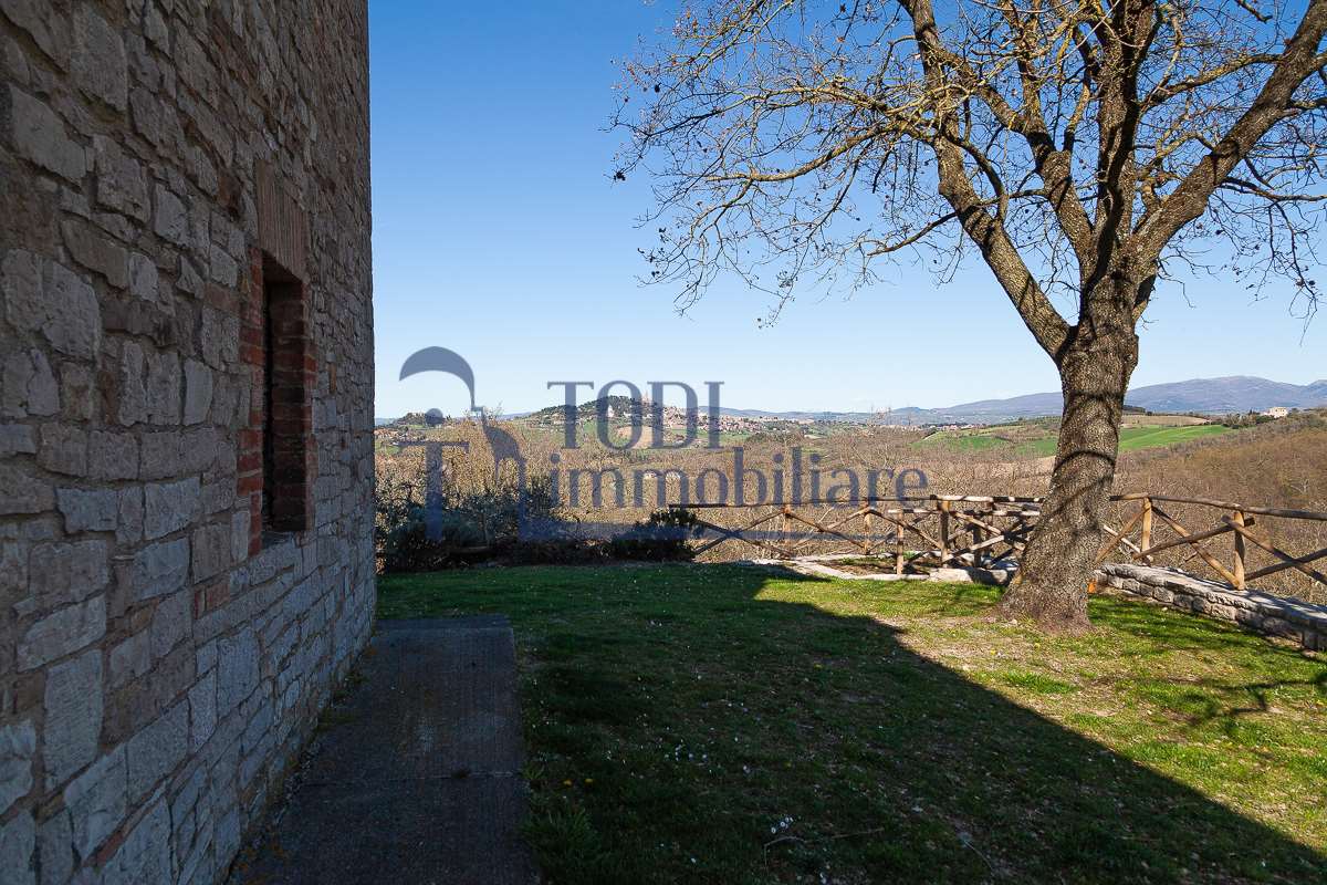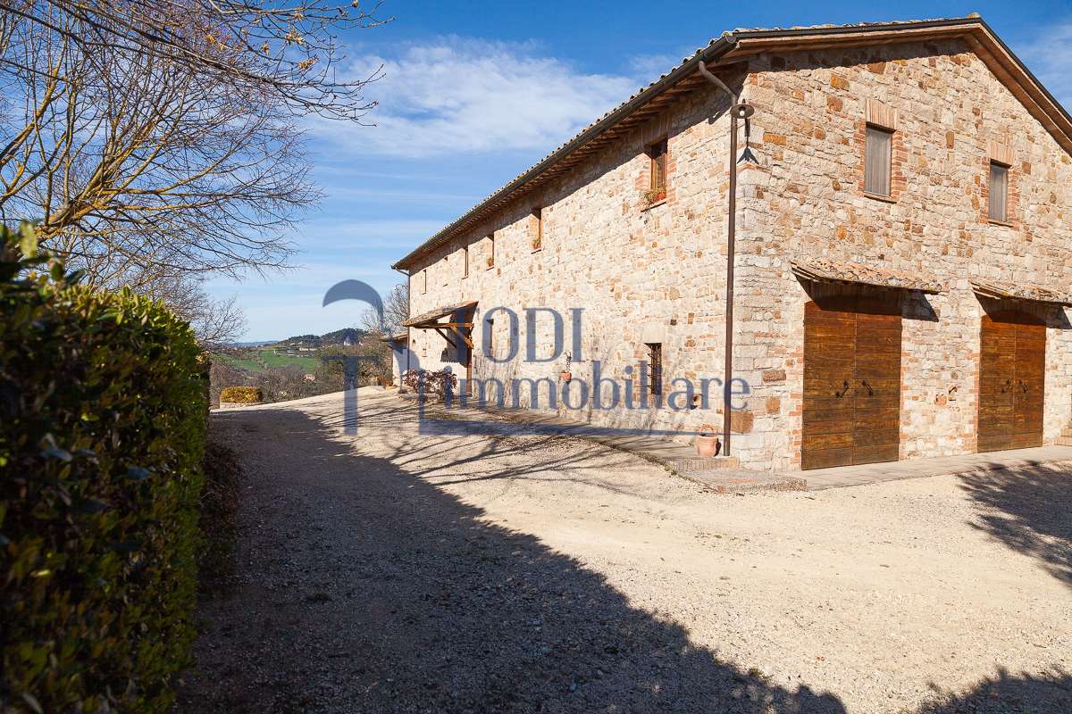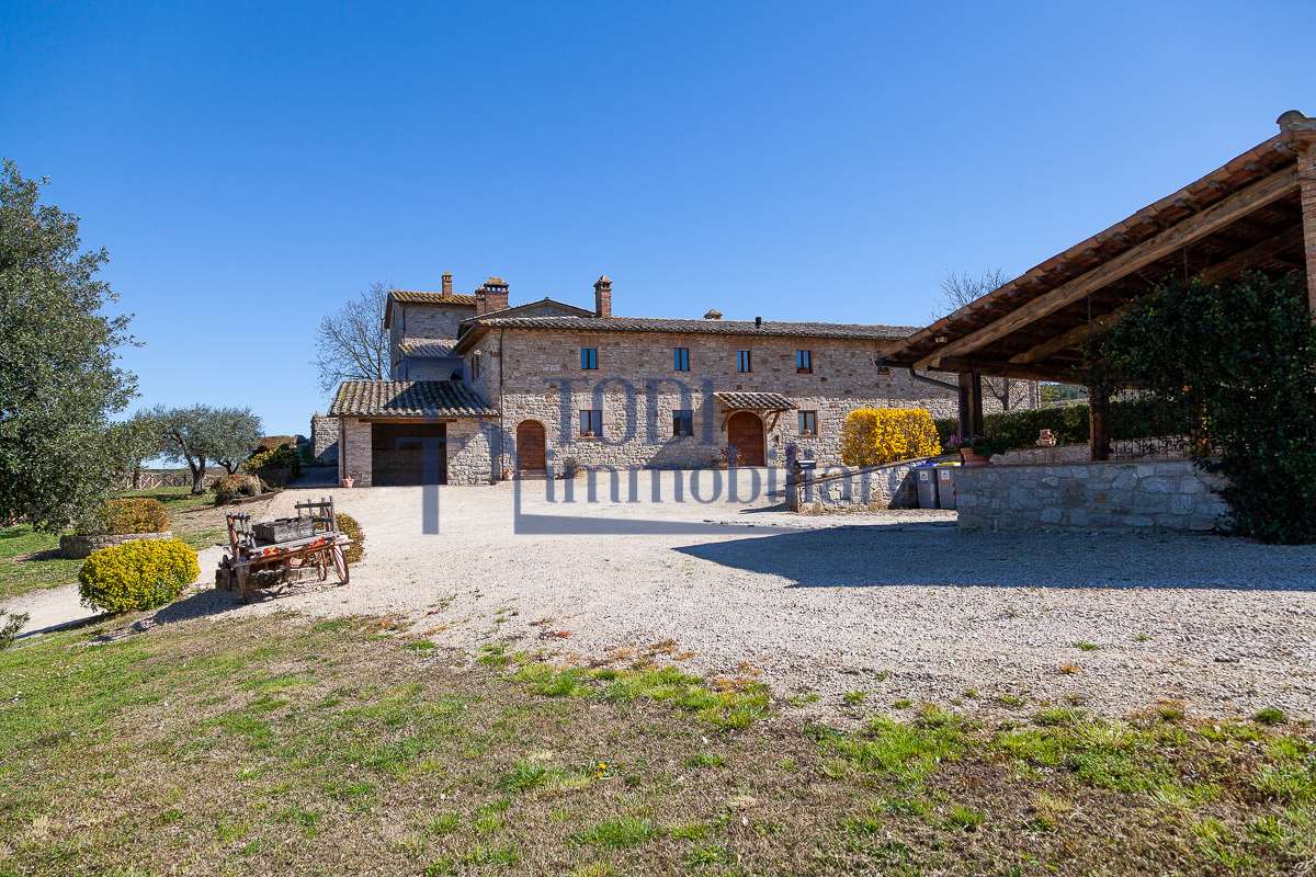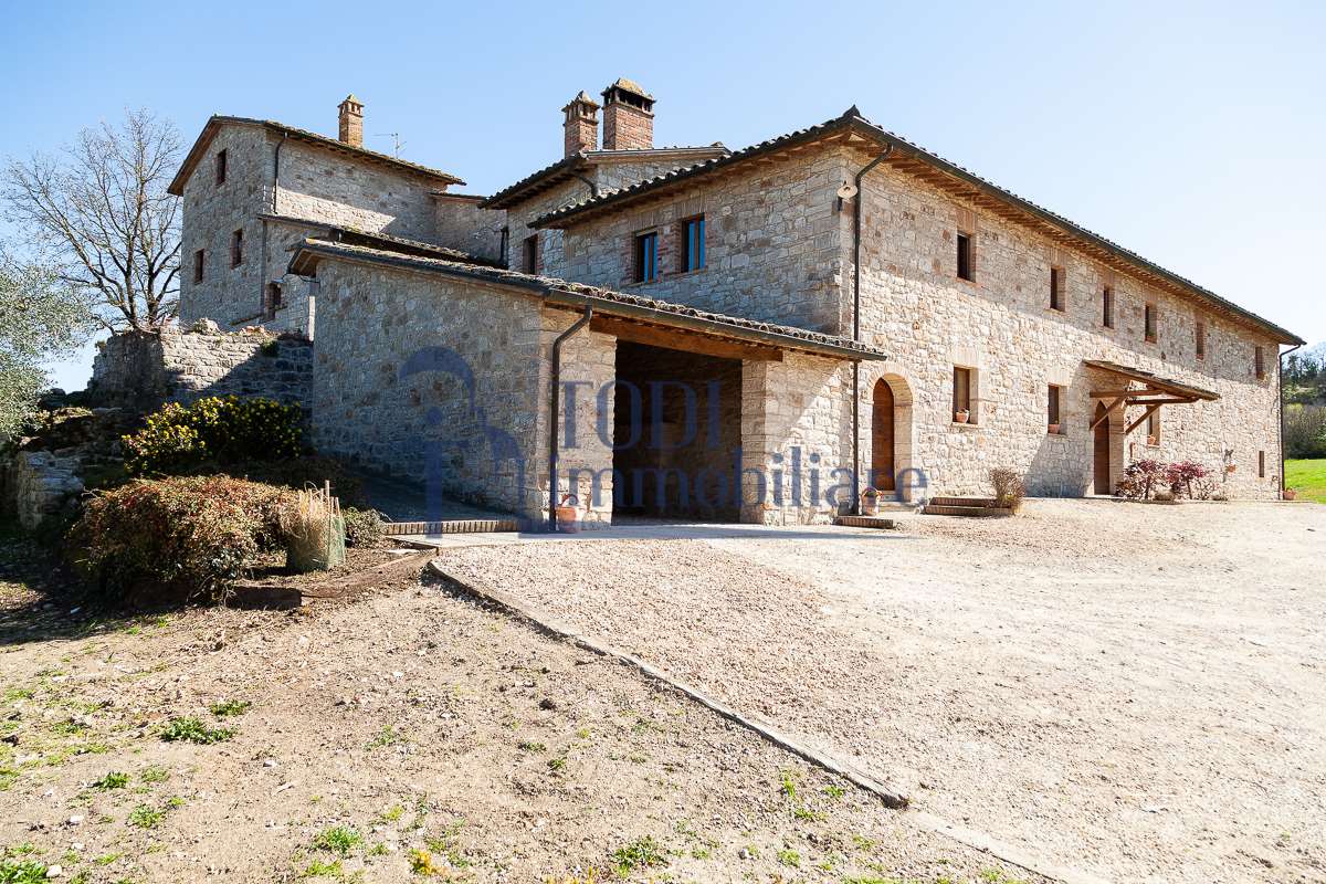 Nella meravigliosa campagna di Todi, sorge un antico casale di circa 560 mq dal fascino senza tempo. La proprietà che anticamente era un castello chiamato \"Lo Scacciatoro\", risale al 1200, la struttura, oltre ad avere un grande valore storico e culturale è stata finemente e sapientemente ristrutturata negli anni 2000, mantenendo intatte tutte le caratteristiche del vecchio casale. L\'esterno in pietra a faccia vista si fonde perfettamente con il verde della natura circostante, mentre all\'interno oltre a trovare sempre pareti realizzate in pietra troviamo solai realizzati con travi in legno, travetti e pianelle, mentre i pavimenti sono stati realizzati in cotto fatto a mano, il tutto crea un\'atmosfera calda e accogliente. Attualmente, la proprietà si compone di 340 mq di superficie abitativa disposta su due livelli; al piano terra troviamo un bellissimo ingresso, una camera con bagno, una lavanderia, una sala hobby e tre garage; una bellissima scala realizzata con gradini in travertino ci conduce al piano primo, dove troviamo un bellissimo doppio salone con camino, un’area relax, una cucina abitabile, due bagni uno a servizio della zona giorno e uno della zona notte, due camere matrimoniali ed un ripostiglio. L’ulteriore superficie abitativa di 220 mq è stata ristrutturata esternamente, mentre internamente è allo stato grezzo quindi con la possibilità di personalizzarli a proprio piacimento, dando sfogo al proprio gusto. Completa la proprietà un annesso si circa 40 mq, disposto su un unico livello dove troviamo un fondo e una tettoia. Il terreno che circonda la casa è vasto e offre la possibilità di godere della bellezza della natura, con boschi, tartufaia e campi coltivati che si estendono per ben 8 ettari, offrendo ampi spazi verdi e una vista mozzafiato sulla campagna umbra e sulla bellissima citta di Todi. La strada di accesso, privata e immersa nel bosco, garantisce la massima privacy e tranquillità. Possibilità di realizzare una piscina. La Proprietà dista circa 7 km dalla splendida città di Todi. Questo casale è l\'ideale per chi cerca un\'oasi di pace e tranquillità. Todi si trova in posizione centrale rispetto a: Perugia, Assisi, Lago Trasimeno, Spoleto, Orvieto, Terni, Narni, Amelia, Cascata delle Marmore, ecc; raggiungibili in meno di mezz\'ora d\'auto, tramite la Superstrada E45. Da Todi c\'è un servizio Pullman giornaliero da e per Roma e aeroporto di Fiumicino. L\'aeroporto internazionale Umbro di Perugia \"San Francesco\" dista solo 45 km Roma dista 130 Km - Firenze 190 Km.\nRestiamo a disposizione per ulteriori informazioni e/o per fissare un appuntamento.