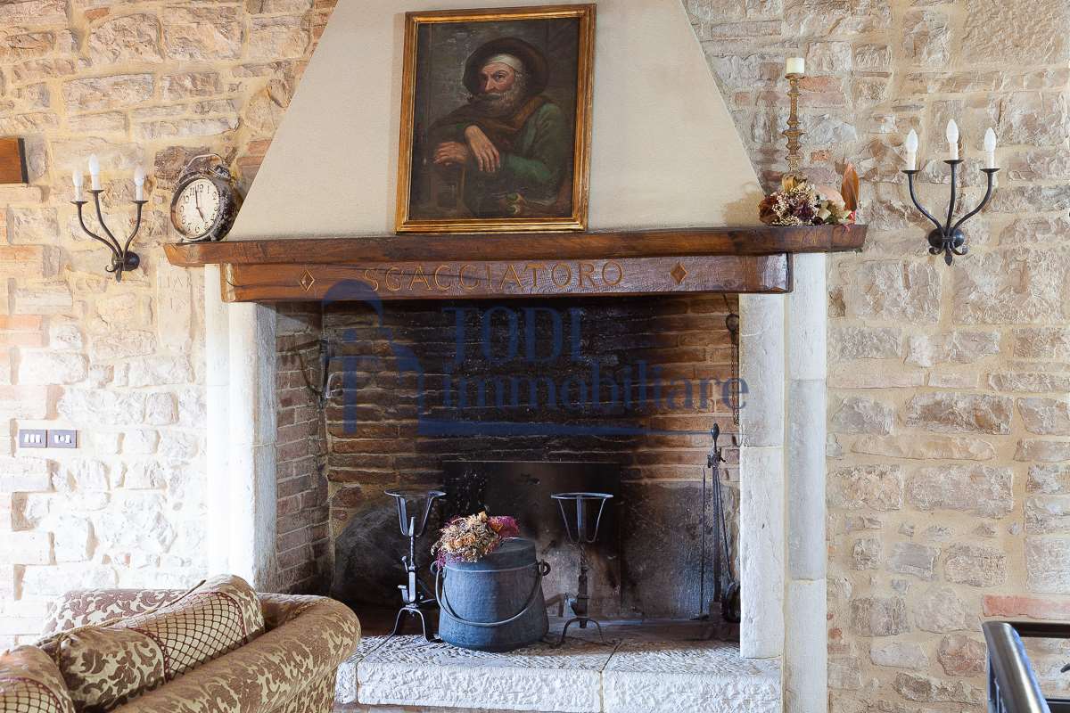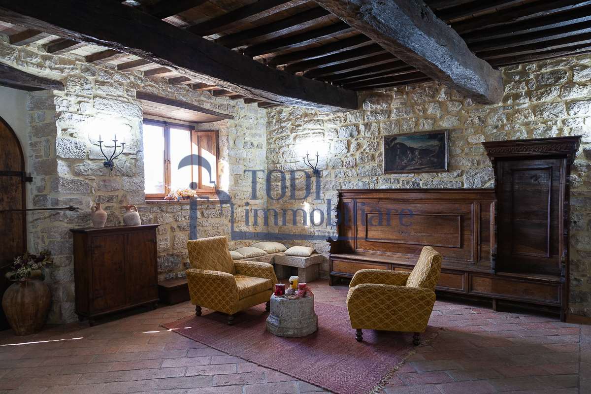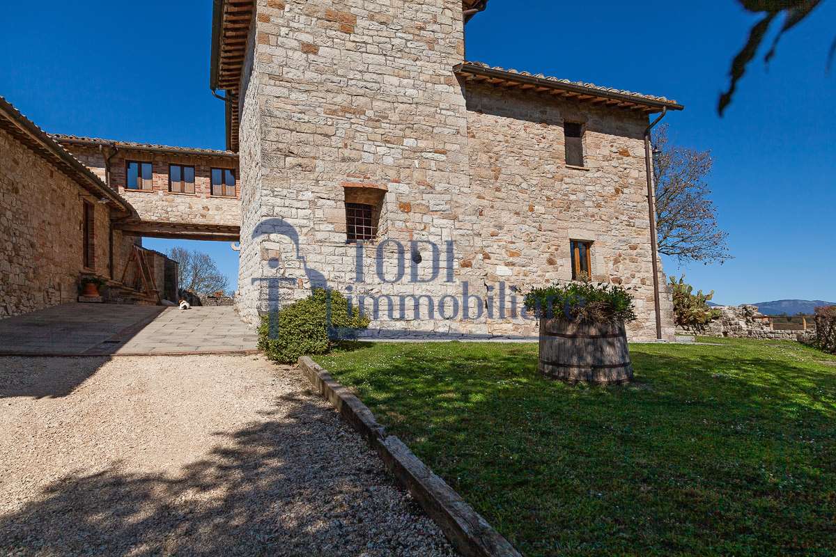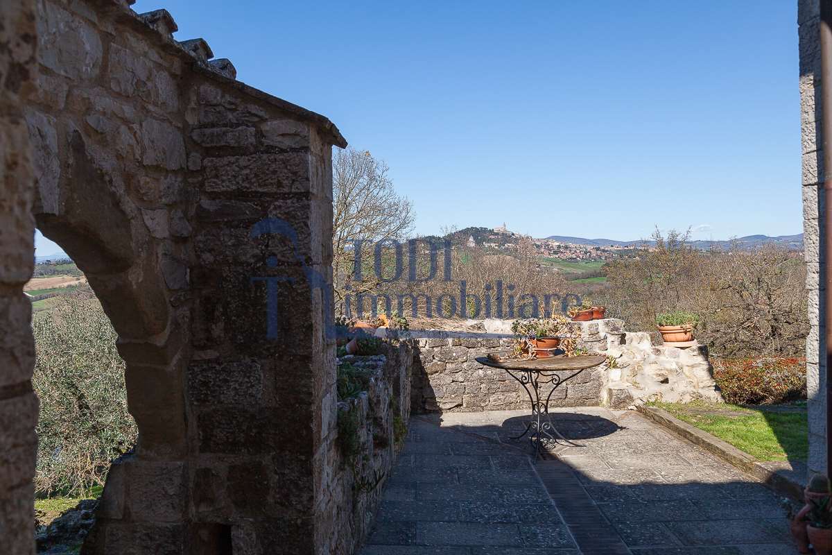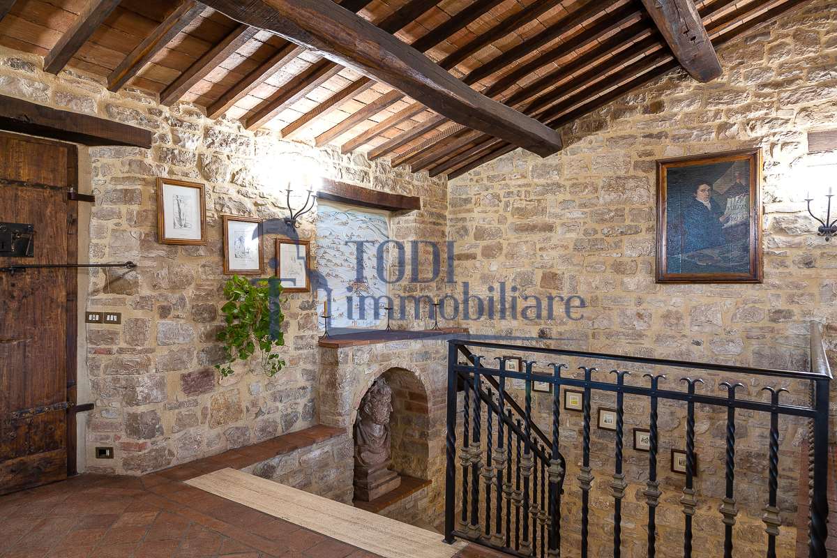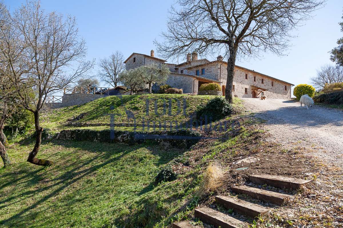 Nella meravigliosa campagna di Todi, sorge un antico casale di circa 560 mq dal fascino senza tempo. La proprietà che anticamente era un castello chiamato \"Lo Scacciatoro\", risale al 1200, la struttura, oltre ad avere un grande valore storico e culturale è stata finemente e sapientemente ristrutturata negli anni 2000, mantenendo intatte tutte le caratteristiche del vecchio casale. L\'esterno in pietra a faccia vista si fonde perfettamente con il verde della natura circostante, mentre all\'interno oltre a trovare sempre pareti realizzate in pietra troviamo solai realizzati con travi in legno, travetti e pianelle, mentre i pavimenti sono stati realizzati in cotto fatto a mano, il tutto crea un\'atmosfera calda e accogliente. Attualmente, la proprietà si compone di 340 mq di superficie abitativa disposta su due livelli; al piano terra troviamo un bellissimo ingresso, una camera con bagno, una lavanderia, una sala hobby e tre garage; una bellissima scala realizzata con gradini in travertino ci conduce al piano primo, dove troviamo un bellissimo doppio salone con camino, un’area relax, una cucina abitabile, due bagni uno a servizio della zona giorno e uno della zona notte, due camere matrimoniali ed un ripostiglio. L’ulteriore superficie abitativa di 220 mq è stata ristrutturata esternamente, mentre internamente è allo stato grezzo quindi con la possibilità di personalizzarli a proprio piacimento, dando sfogo al proprio gusto. Completa la proprietà un annesso si circa 40 mq, disposto su un unico livello dove troviamo un fondo e una tettoia. Il terreno che circonda la casa è vasto e offre la possibilità di godere della bellezza della natura, con boschi, tartufaia e campi coltivati che si estendono per ben 8 ettari, offrendo ampi spazi verdi e una vista mozzafiato sulla campagna umbra e sulla bellissima citta di Todi. La strada di accesso, privata e immersa nel bosco, garantisce la massima privacy e tranquillità. Possibilità di realizzare una piscina. La Proprietà dista circa 7 km dalla splendida città di Todi. Questo casale è l\'ideale per chi cerca un\'oasi di pace e tranquillità. Todi si trova in posizione centrale rispetto a: Perugia, Assisi, Lago Trasimeno, Spoleto, Orvieto, Terni, Narni, Amelia, Cascata delle Marmore, ecc; raggiungibili in meno di mezz\'ora d\'auto, tramite la Superstrada E45. Da Todi c\'è un servizio Pullman giornaliero da e per Roma e aeroporto di Fiumicino. L\'aeroporto internazionale Umbro di Perugia \"San Francesco\" dista solo 45 km Roma dista 130 Km - Firenze 190 Km.\nRestiamo a disposizione per ulteriori informazioni e/o per fissare un appuntamento.