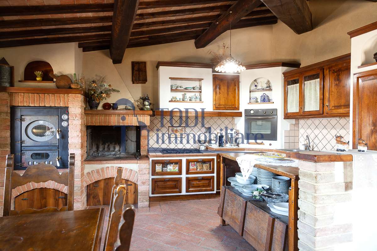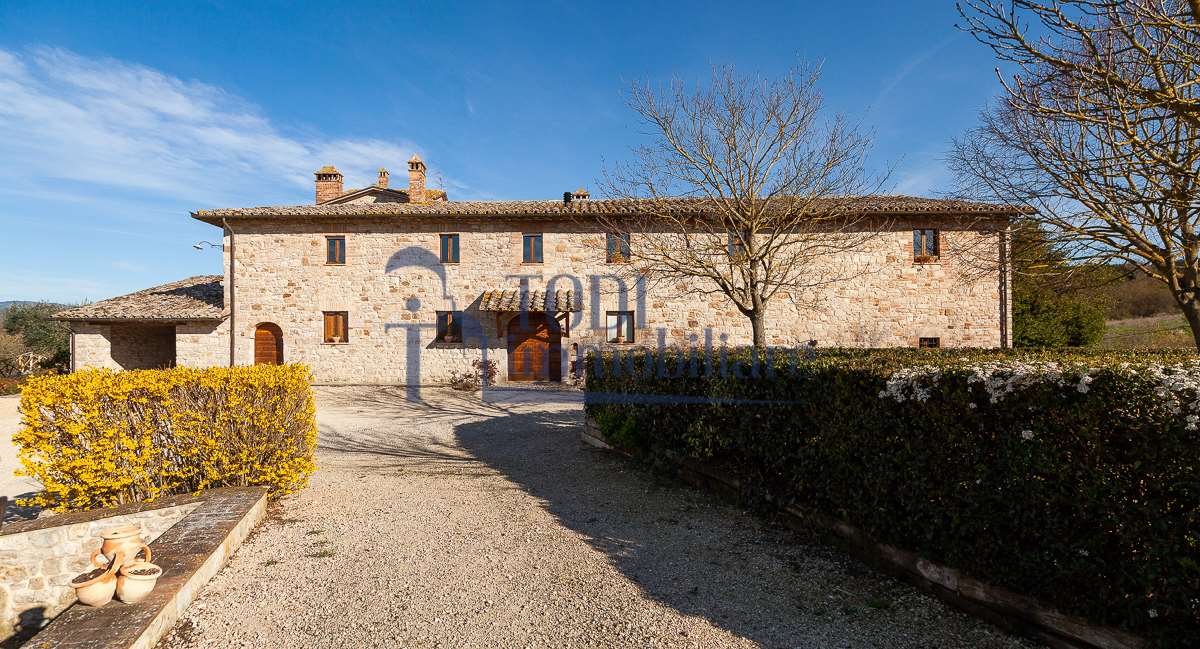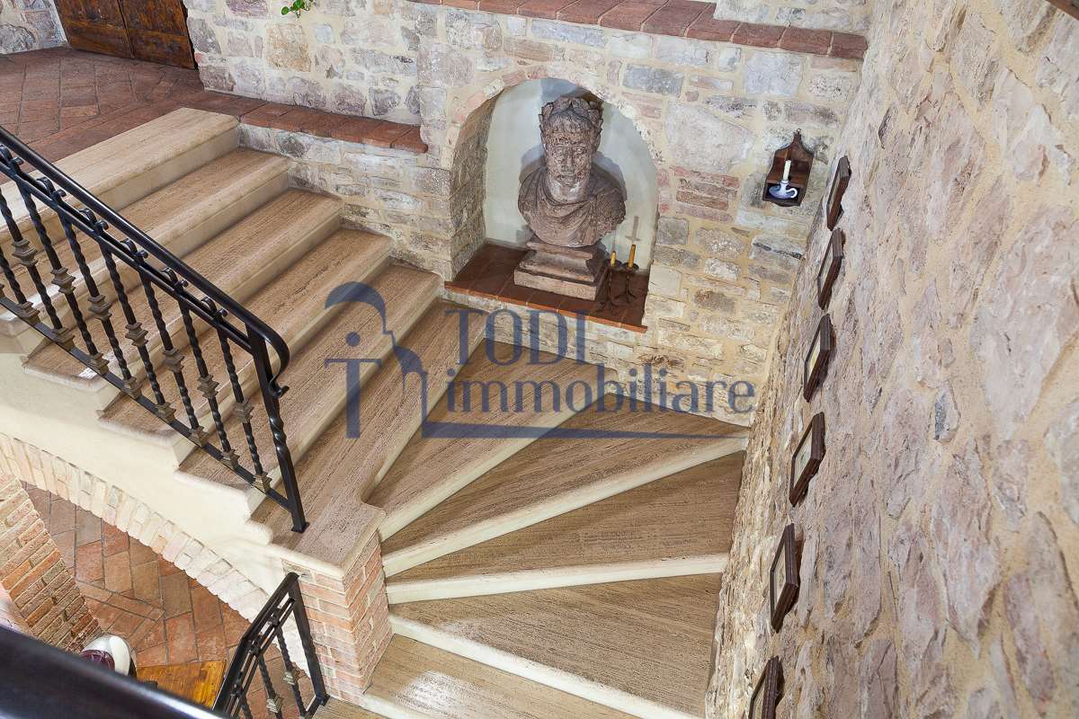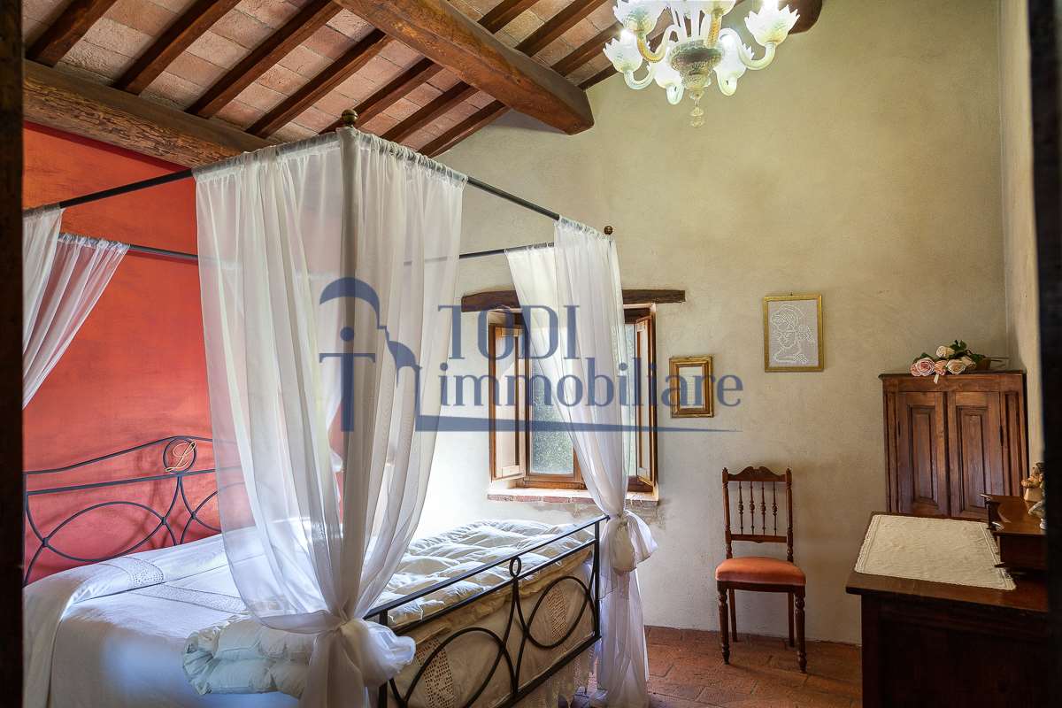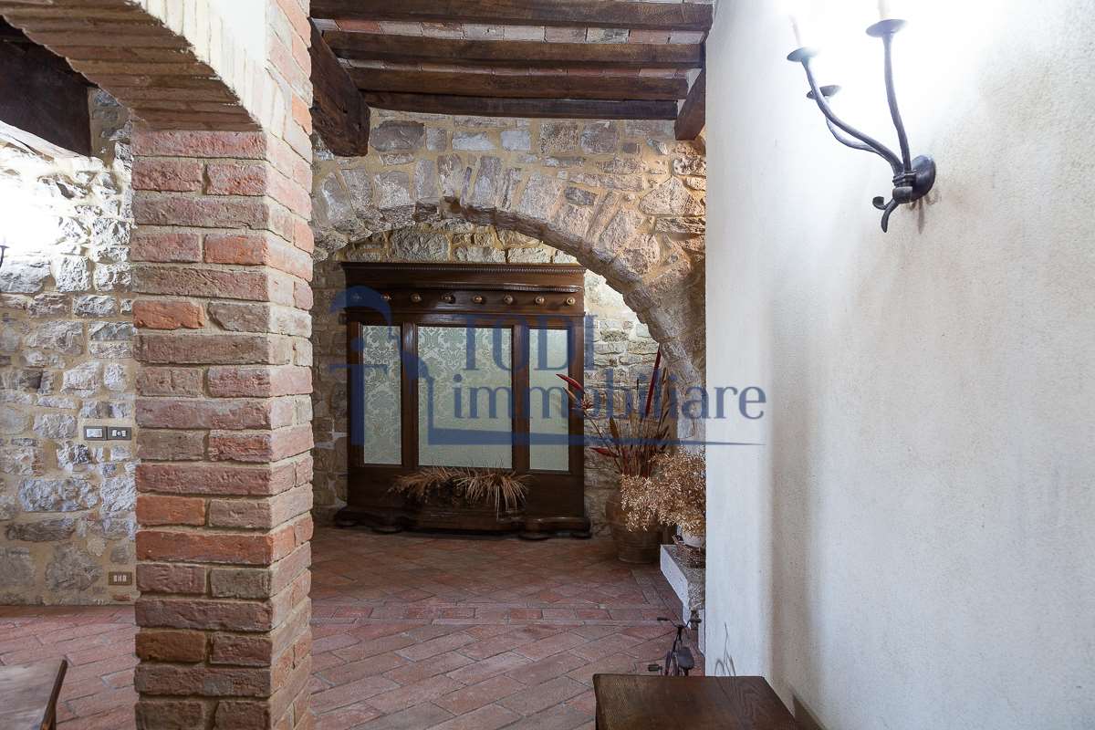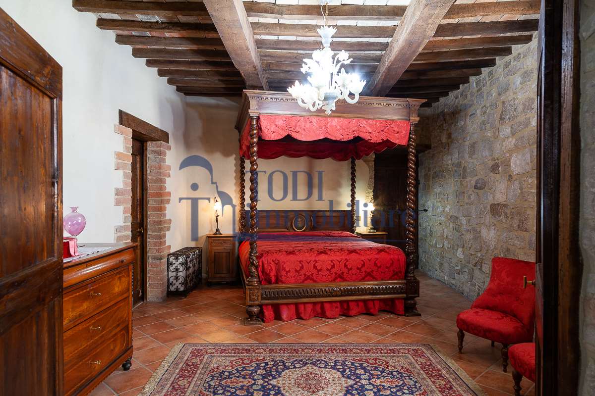 Nella meravigliosa campagna di Todi, sorge un antico casale di circa 560 mq dal fascino senza tempo. La proprietà che anticamente era un castello chiamato \"Lo Scacciatoro\", risale al 1200, la struttura, oltre ad avere un grande valore storico e culturale è stata finemente e sapientemente ristrutturata negli anni 2000, mantenendo intatte tutte le caratteristiche del vecchio casale. L\'esterno in pietra a faccia vista si fonde perfettamente con il verde della natura circostante, mentre all\'interno oltre a trovare sempre pareti realizzate in pietra troviamo solai realizzati con travi in legno, travetti e pianelle, mentre i pavimenti sono stati realizzati in cotto fatto a mano, il tutto crea un\'atmosfera calda e accogliente. Attualmente, la proprietà si compone di 340 mq di superficie abitativa disposta su due livelli; al piano terra troviamo un bellissimo ingresso, una camera con bagno, una lavanderia, una sala hobby e tre garage; una bellissima scala realizzata con gradini in travertino ci conduce al piano primo, dove troviamo un bellissimo doppio salone con camino, un’area relax, una cucina abitabile, due bagni uno a servizio della zona giorno e uno della zona notte, due camere matrimoniali ed un ripostiglio. L’ulteriore superficie abitativa di 220 mq è stata ristrutturata esternamente, mentre internamente è allo stato grezzo quindi con la possibilità di personalizzarli a proprio piacimento, dando sfogo al proprio gusto. Completa la proprietà un annesso si circa 40 mq, disposto su un unico livello dove troviamo un fondo e una tettoia. Il terreno che circonda la casa è vasto e offre la possibilità di godere della bellezza della natura, con boschi, tartufaia e campi coltivati che si estendono per ben 8 ettari, offrendo ampi spazi verdi e una vista mozzafiato sulla campagna umbra e sulla bellissima citta di Todi. La strada di accesso, privata e immersa nel bosco, garantisce la massima privacy e tranquillità. Possibilità di realizzare una piscina. La Proprietà dista circa 7 km dalla splendida città di Todi. Questo casale è l\'ideale per chi cerca un\'oasi di pace e tranquillità. Todi si trova in posizione centrale rispetto a: Perugia, Assisi, Lago Trasimeno, Spoleto, Orvieto, Terni, Narni, Amelia, Cascata delle Marmore, ecc; raggiungibili in meno di mezz\'ora d\'auto, tramite la Superstrada E45. Da Todi c\'è un servizio Pullman giornaliero da e per Roma e aeroporto di Fiumicino. L\'aeroporto internazionale Umbro di Perugia \"San Francesco\" dista solo 45 km Roma dista 130 Km - Firenze 190 Km.\nRestiamo a disposizione per ulteriori informazioni e/o per fissare un appuntamento.