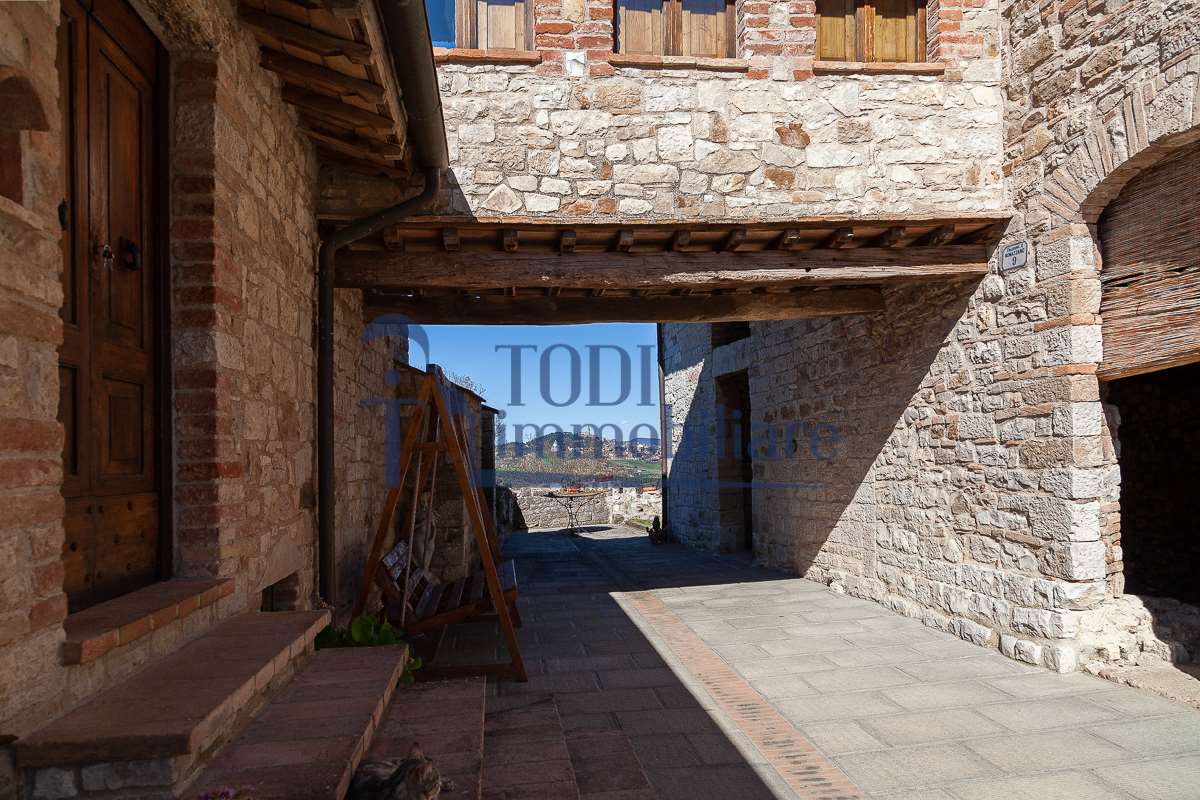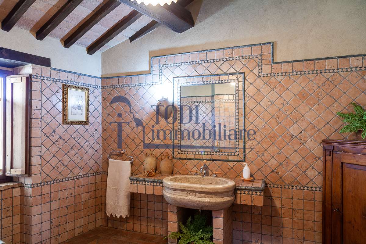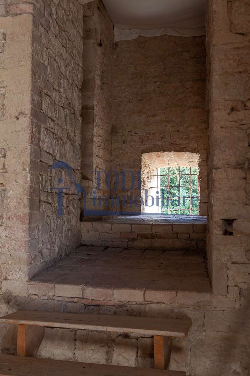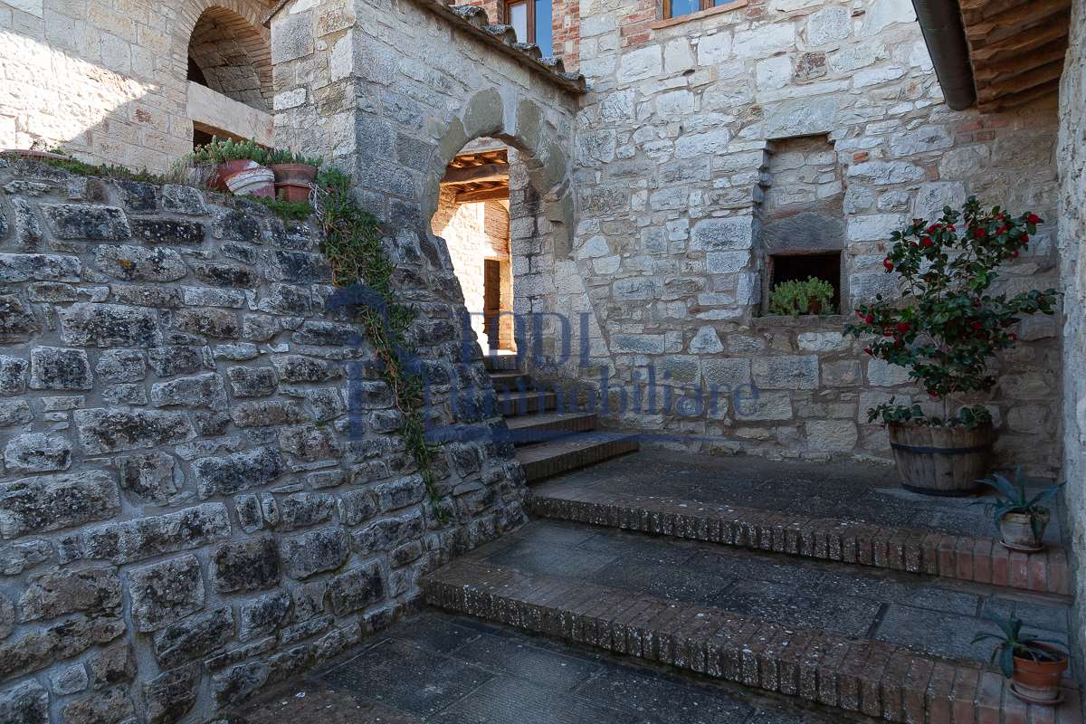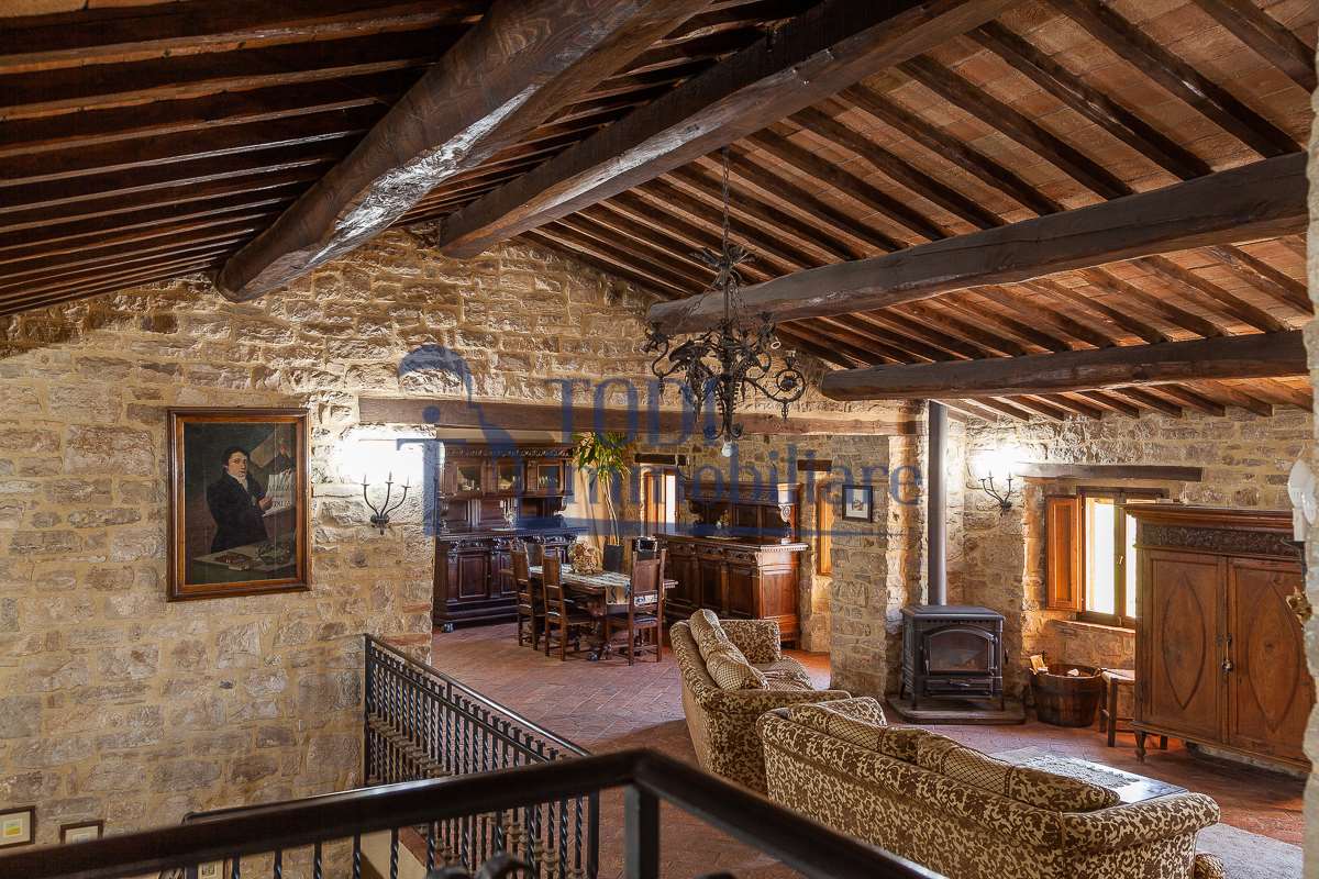 Nella meravigliosa campagna di Todi, sorge un antico casale di circa 560 mq dal fascino senza tempo. La proprietà che anticamente era un castello chiamato \"Lo Scacciatoro\", risale al 1200, la struttura, oltre ad avere un grande valore storico e culturale è stata finemente e sapientemente ristrutturata negli anni 2000, mantenendo intatte tutte le caratteristiche del vecchio casale. L\'esterno in pietra a faccia vista si fonde perfettamente con il verde della natura circostante, mentre all\'interno oltre a trovare sempre pareti realizzate in pietra troviamo solai realizzati con travi in legno, travetti e pianelle, mentre i pavimenti sono stati realizzati in cotto fatto a mano, il tutto crea un\'atmosfera calda e accogliente. Attualmente, la proprietà si compone di 340 mq di superficie abitativa disposta su due livelli; al piano terra troviamo un bellissimo ingresso, una camera con bagno, una lavanderia, una sala hobby e tre garage; una bellissima scala realizzata con gradini in travertino ci conduce al piano primo, dove troviamo un bellissimo doppio salone con camino, un’area relax, una cucina abitabile, due bagni uno a servizio della zona giorno e uno della zona notte, due camere matrimoniali ed un ripostiglio. L’ulteriore superficie abitativa di 220 mq è stata ristrutturata esternamente, mentre internamente è allo stato grezzo quindi con la possibilità di personalizzarli a proprio piacimento, dando sfogo al proprio gusto. Completa la proprietà un annesso si circa 40 mq, disposto su un unico livello dove troviamo un fondo e una tettoia. Il terreno che circonda la casa è vasto e offre la possibilità di godere della bellezza della natura, con boschi, tartufaia e campi coltivati che si estendono per ben 8 ettari, offrendo ampi spazi verdi e una vista mozzafiato sulla campagna umbra e sulla bellissima citta di Todi. La strada di accesso, privata e immersa nel bosco, garantisce la massima privacy e tranquillità. Possibilità di realizzare una piscina. La Proprietà dista circa 7 km dalla splendida città di Todi. Questo casale è l\'ideale per chi cerca un\'oasi di pace e tranquillità. Todi si trova in posizione centrale rispetto a: Perugia, Assisi, Lago Trasimeno, Spoleto, Orvieto, Terni, Narni, Amelia, Cascata delle Marmore, ecc; raggiungibili in meno di mezz\'ora d\'auto, tramite la Superstrada E45. Da Todi c\'è un servizio Pullman giornaliero da e per Roma e aeroporto di Fiumicino. L\'aeroporto internazionale Umbro di Perugia \"San Francesco\" dista solo 45 km Roma dista 130 Km - Firenze 190 Km.\nRestiamo a disposizione per ulteriori informazioni e/o per fissare un appuntamento.