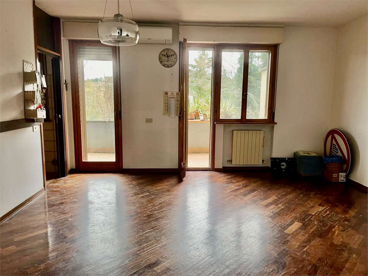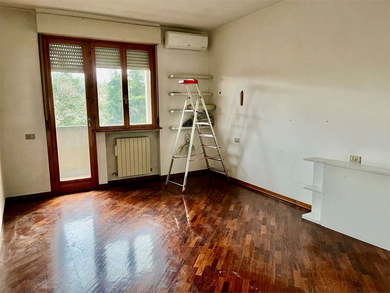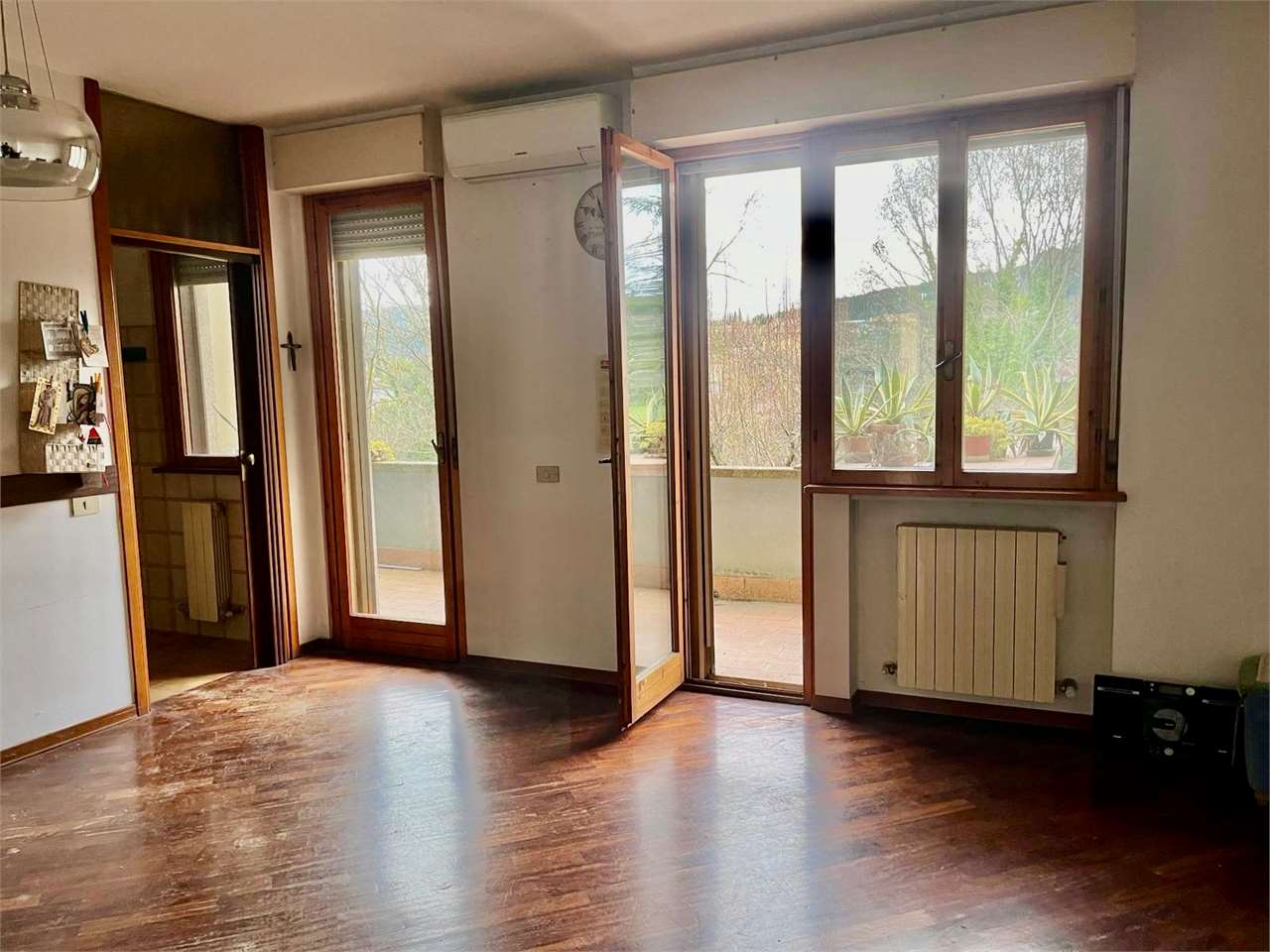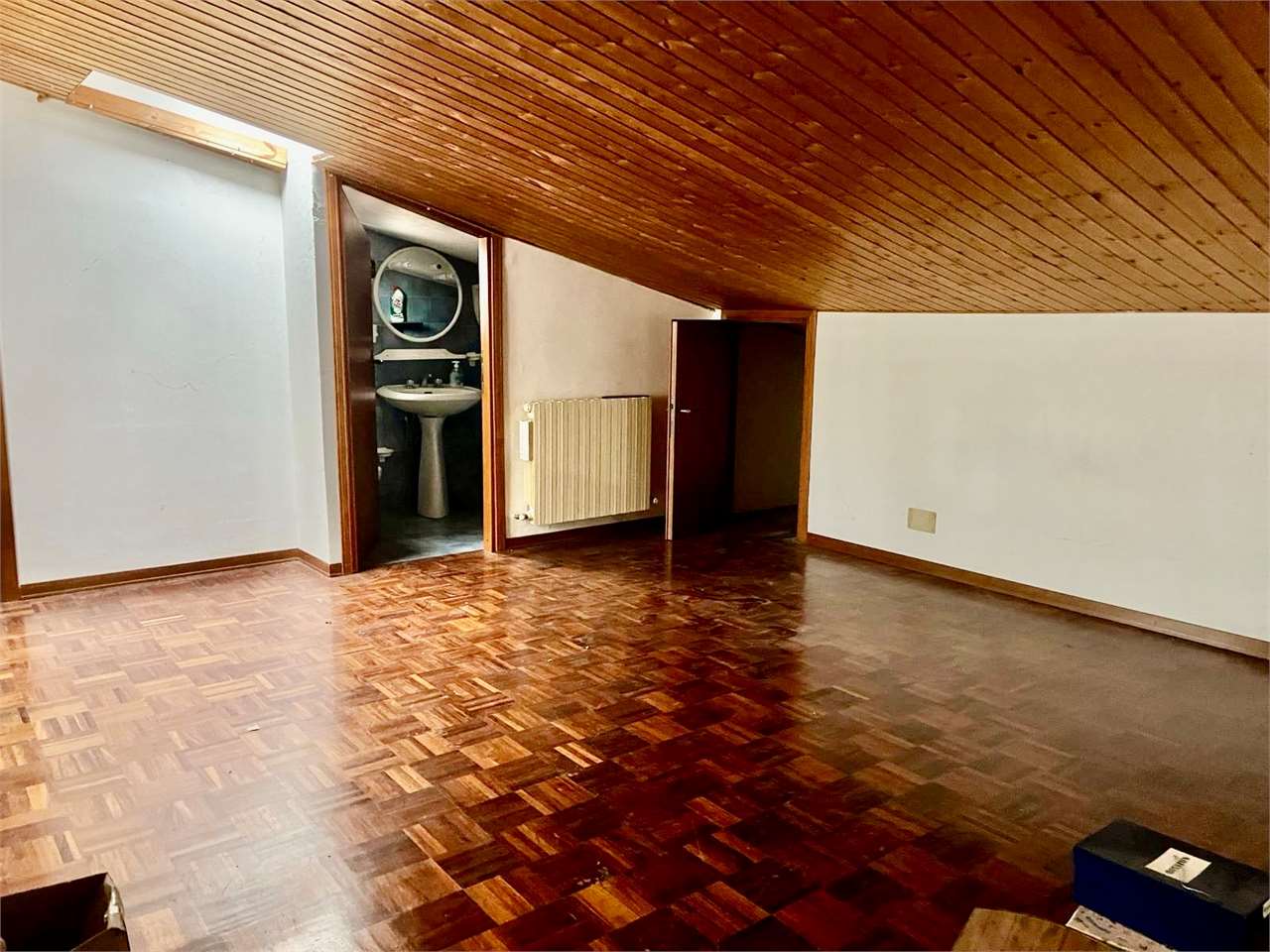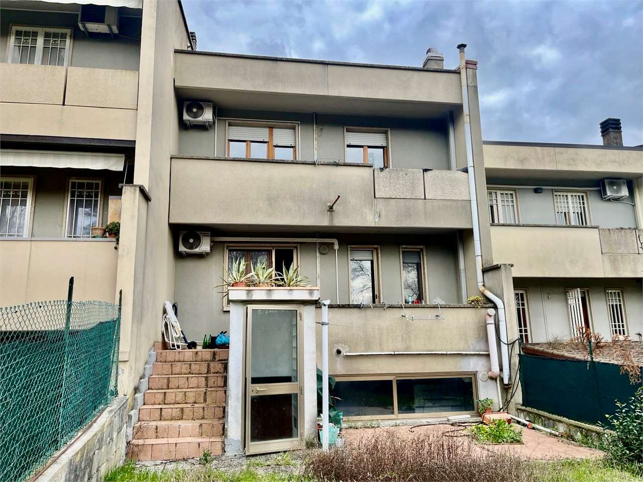 OLIVETO: Proponiamo in vendita porzione di villetta a schiera anni \'80 (1985), in un quartiere tranquillo e molto bene abitato, in posizione panoramica verso Ovest.\nL\'immobile è in buono stato d\'uso ed è attualmente libero, si sviluppa su 4 livelli e dispone di un cortile fronte strada e di un giardino nel retro.\nAl piano terra ingresso indipendente dal cortile esclusivo con comodo disimpegno verandato, ampia zona giorno con camino e terrazzo dal quale si accede al giardino nel retro, cucinotto, bagno e studio o camera matrimoniale;\nal primo piano 3 camere matrimoniali, 2 bagni ed un terrazzo;\nal secondo mansardato ampia stanza open space con bagno;\nnel semiinterrato salone rustico con camino ed angolo cottura ed ulteriore accesso al giardino, cantina e garage.\nBuone finiture generali, pavimenti in parquet, doppi vetri, riscaldamento autonomo e condizionamento in vari ambienti. Per info 07530040.