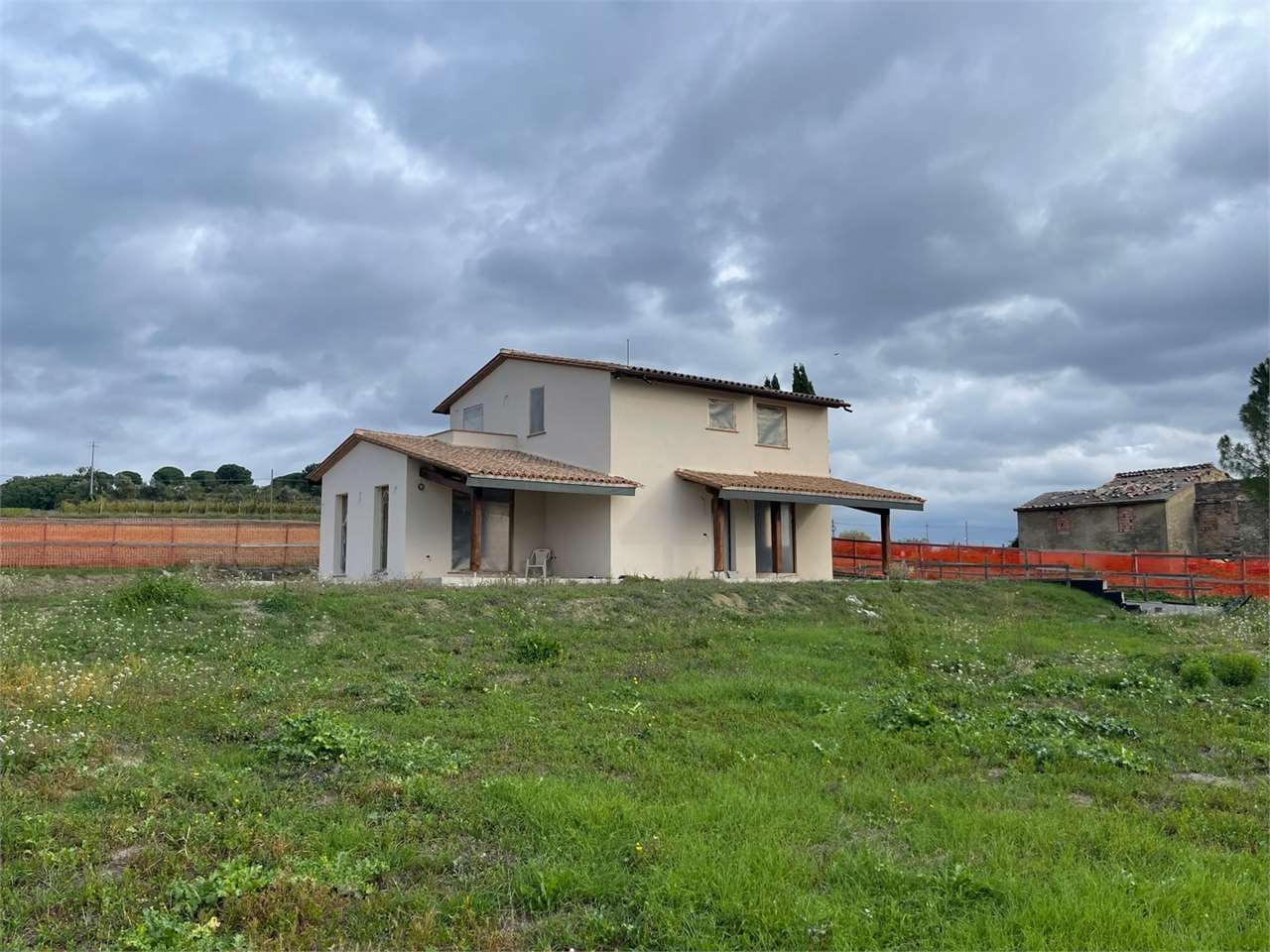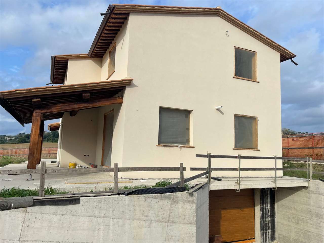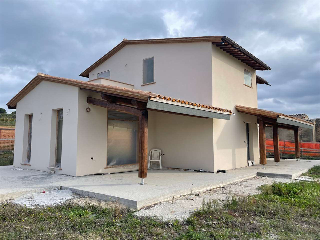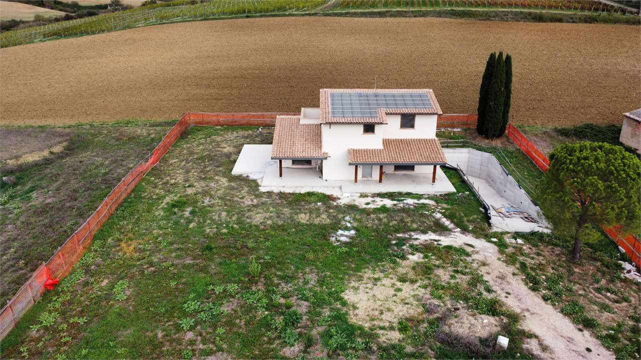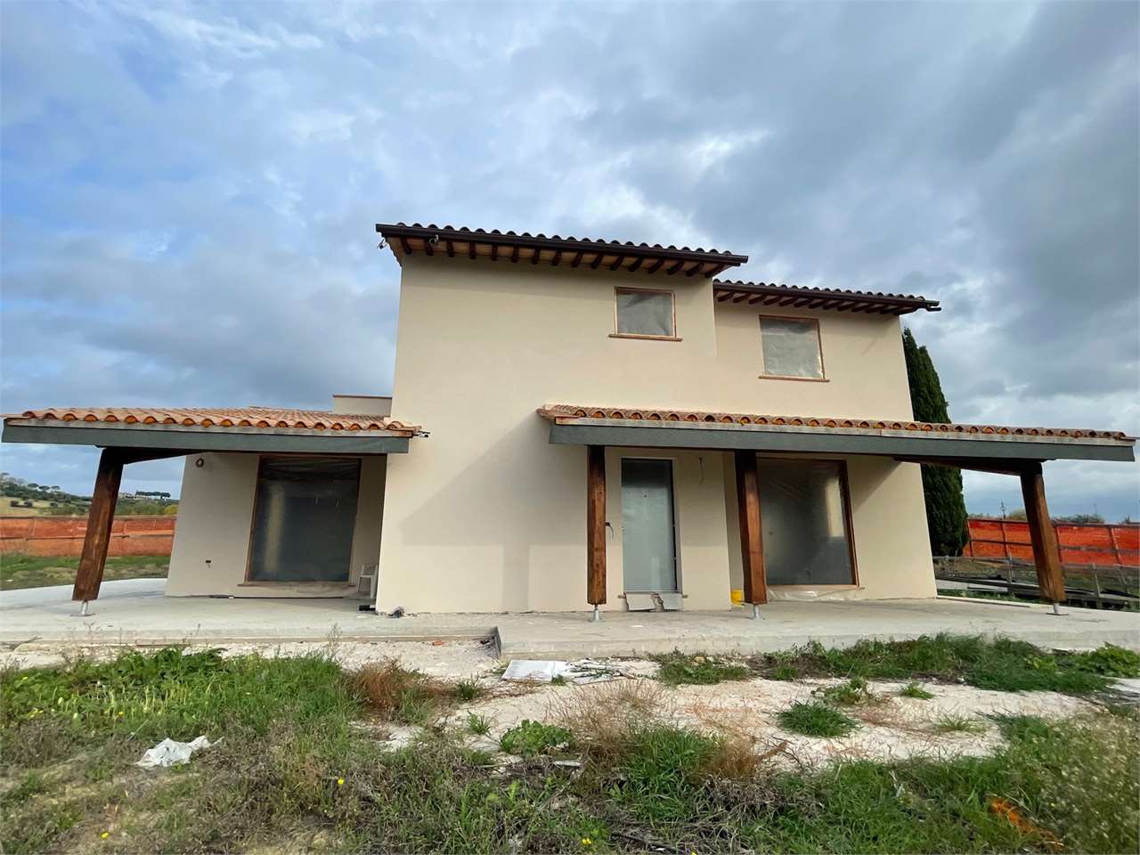 PERUGIA - LOC. BETTONA: vendiamo villetta di recente costruzione immersa nel verde, ideale per chi desidera un posto tranquillo con vista aperta. \nL\'immobile, costruito con materiali di qualità ed attenzione ai dettagli, risulta così composto: al piano terra ingresso, ampio soggiorno con zona pranzo, cucina abitabile, studio, bagno e due portici ideali per godere degli spazi esterni; al piano primo camera padronale con bagno privato e cabina armadio, altra camera matrimoniale, camera singola/studio e un bagno ed un terrazzo panoramico; al piano interrato ampia zona garage con possibilità di ricavare al suo interno locali tecnici o di servizio.\nCompletano la proprietà corte e terreno per circa 7.000 mq complessivi.\nLa villetta è stato costruita prestando particolare attenzione all\'efficientamento energetico, prevedendo predisposizione per pannelli fotovoltaici, riscaldamento a pavimento, vetri termici di ultima generazione, cappotto esterno. \nL\'immobile, pur essendo in stato avanzato, deve essere ultimato.\nRichiesta € 440.000,00 \nCod. annuncio V/321