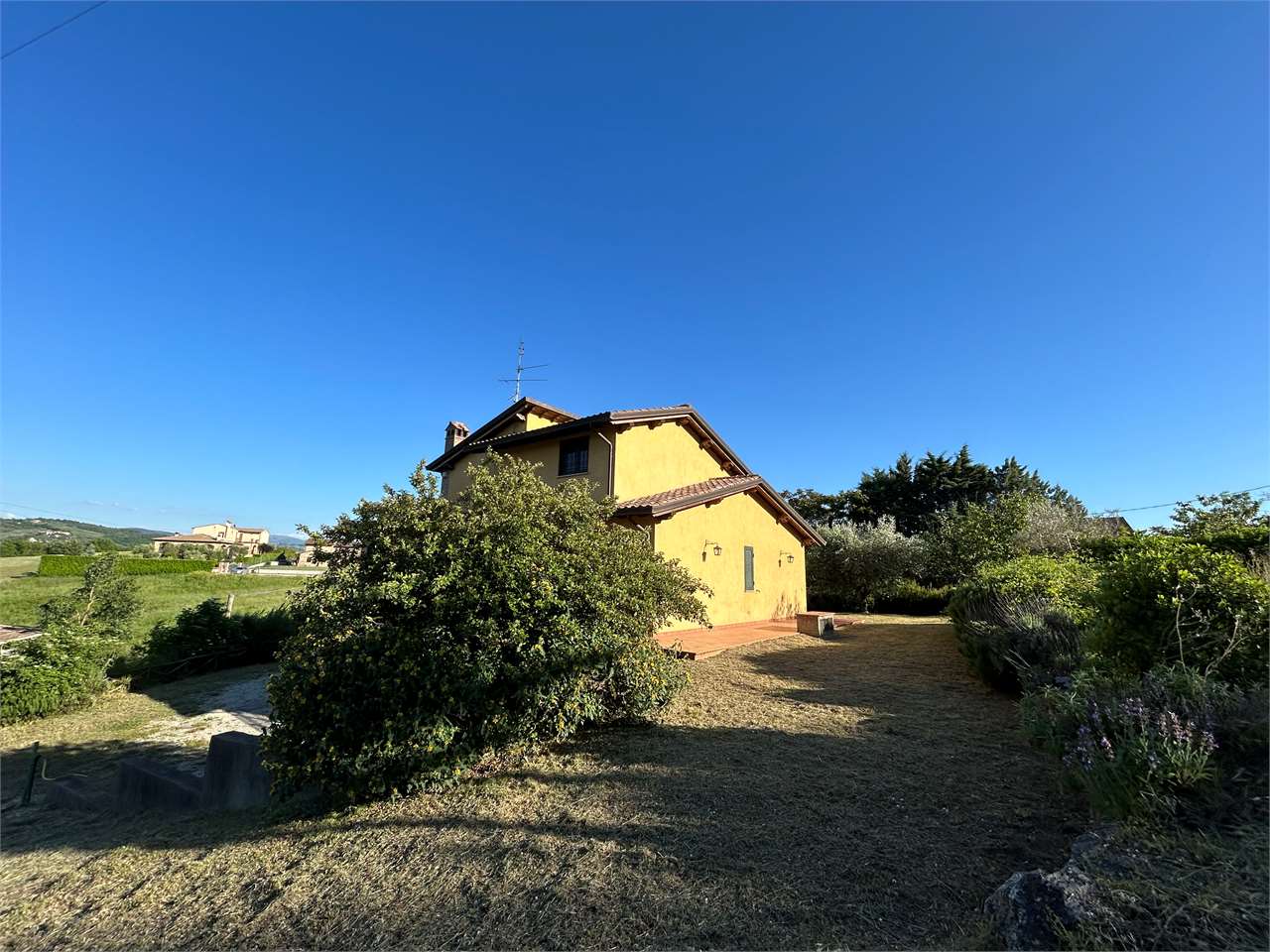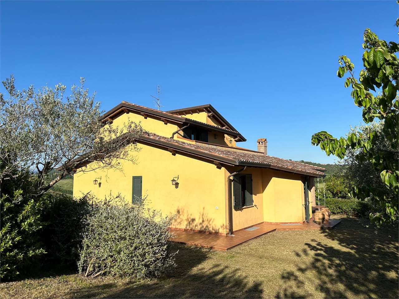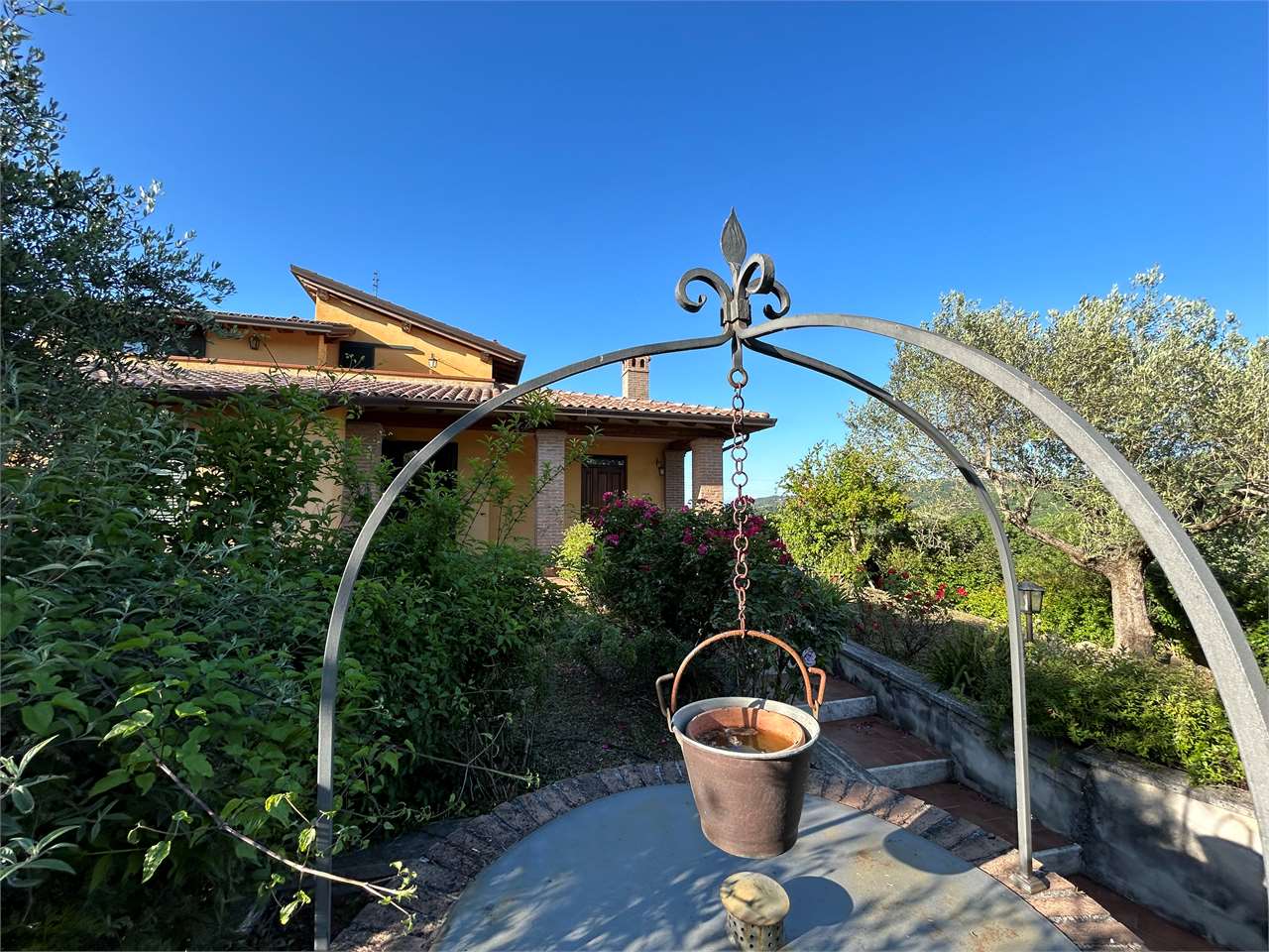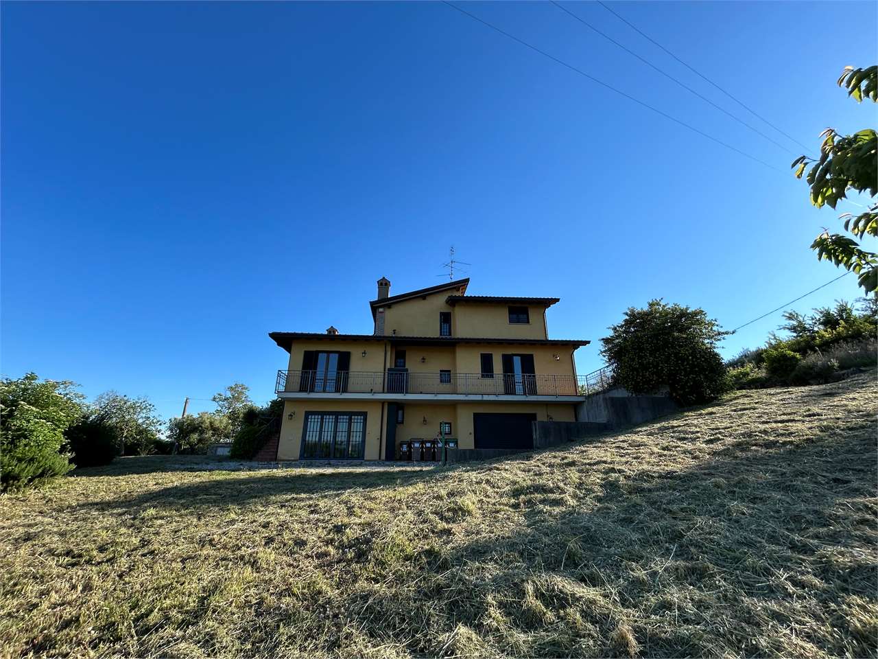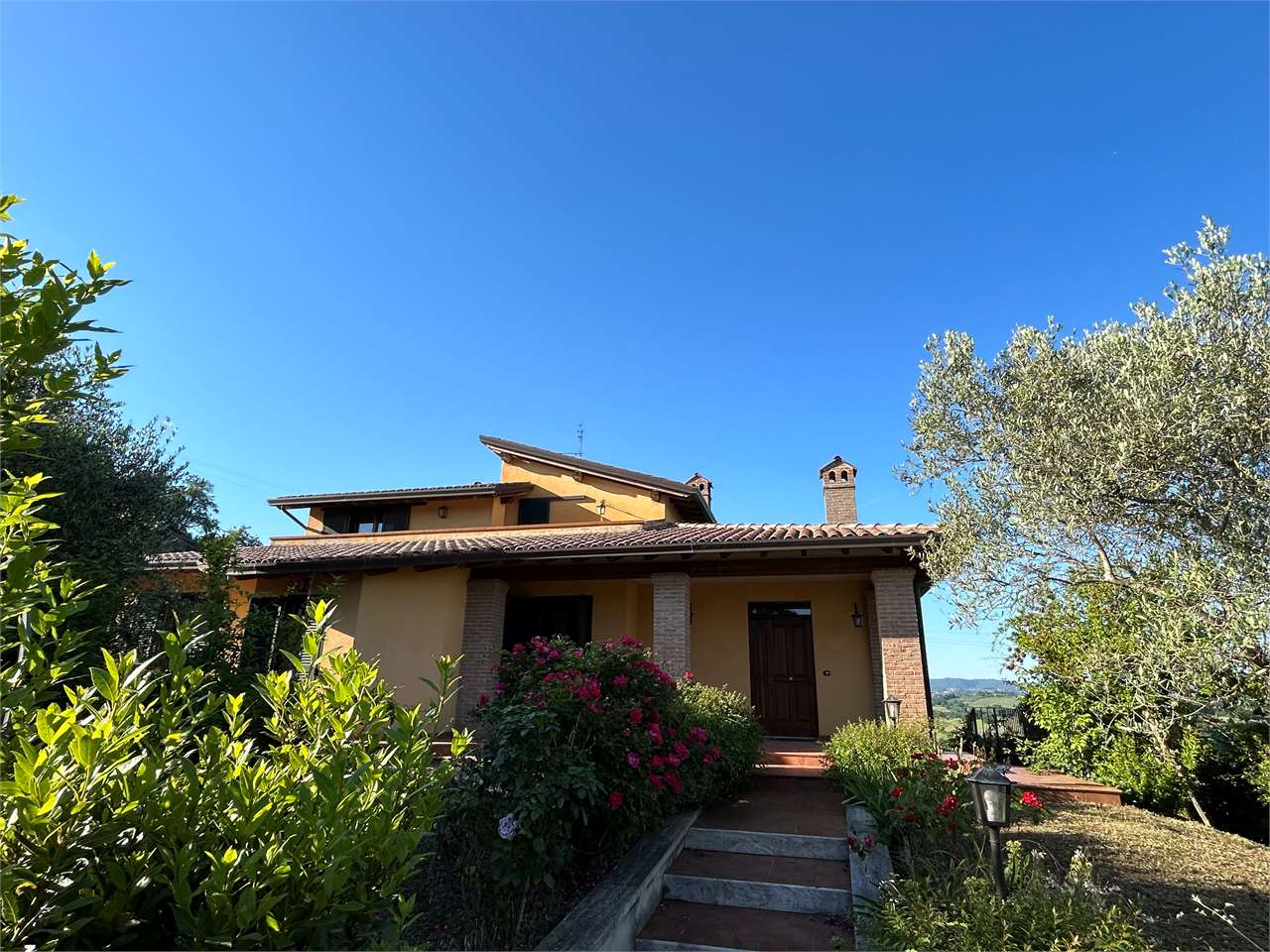 Piedicolle: in posizione collinare, immersa nel verde delle campagne Umbre vendiamo villa panoramica di 250 mq su due livelli oltre taverna ed ampio garage. \nPianoterra: ampio soggiorno con camino che accede su grazioso porticato esterno, cucina abitabile, 3 spaziose camere e 2 bagni.\nPiano primo, accessibile attraverso una comoda e funzionale scala interna: camera matrimoniale con bagno en suite con accesso ad ampio terrazzo e studio.\nPiano seminterrato, caratterizzato da un doppio accesso: ampia taverna, spazioso bagno e doppio garage.\nLa proprietà, circondata da un grazioso giardino e uliveto, dispone di pozzo ed impianto di irrigazione.\nAdiacente alla E 45, a soli 15 minuti da Perugia e limitrofo ai borghi più suggestivi dell\'Umbria quali Todi ed Assisi. Per ulteriori informazioni contattaci allo 075/30040.