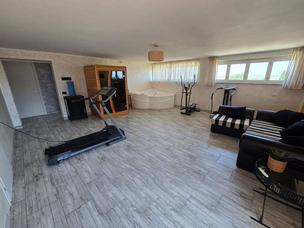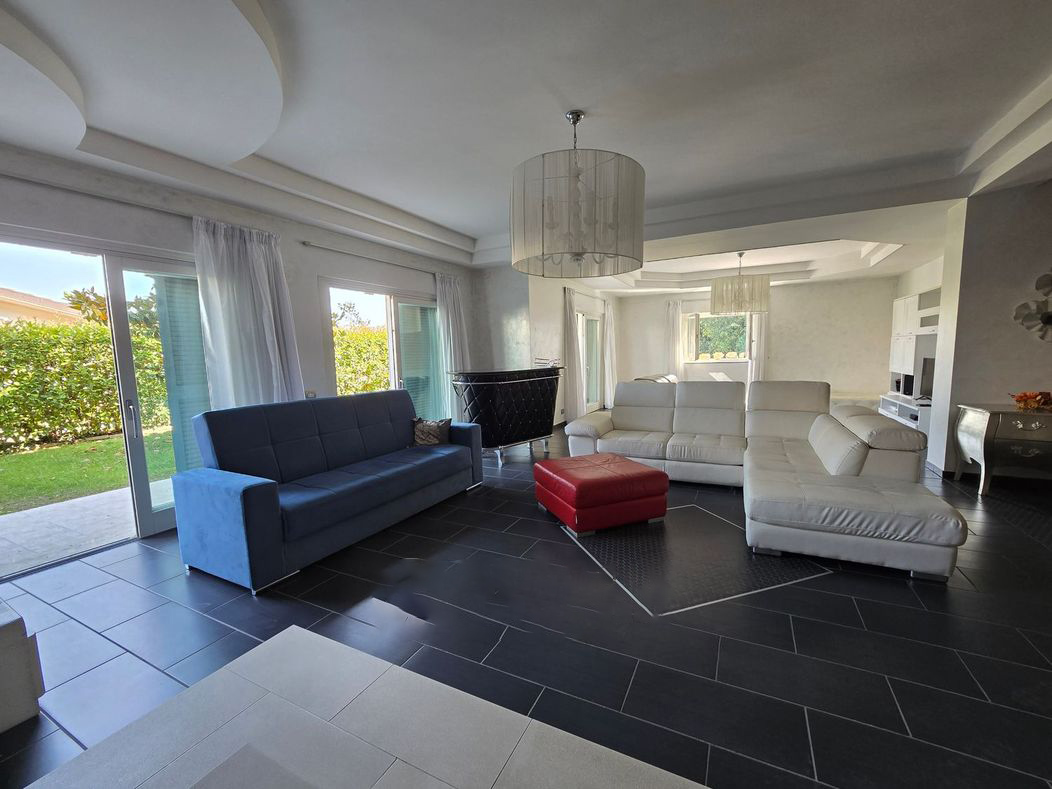 Ampio soggiorno doppio, Cucina abitabile, Cinque camere da letto, Otto bagni, Area wellness con palestra, sauna e vasca idromassaggio, Terrazza panoramica con solarium, Garage triplo.
