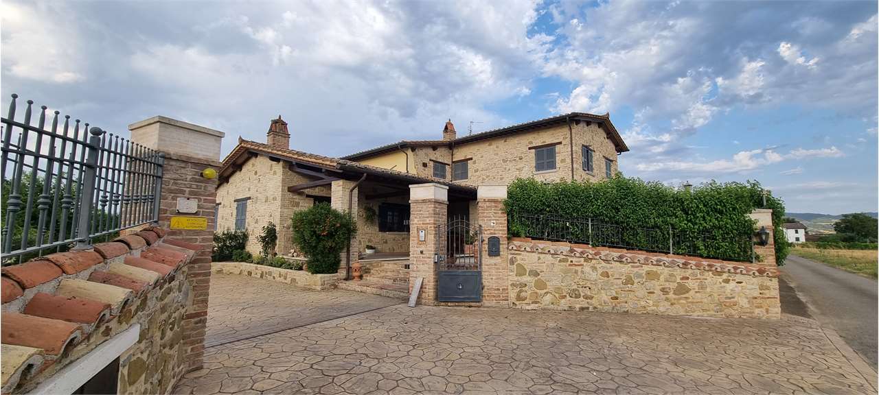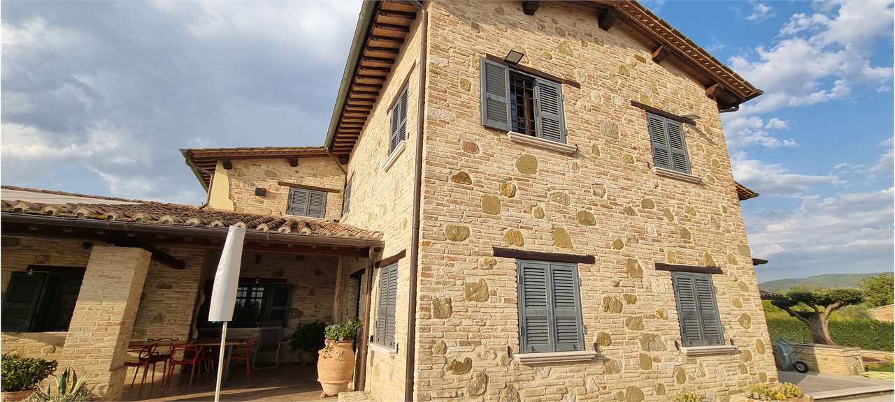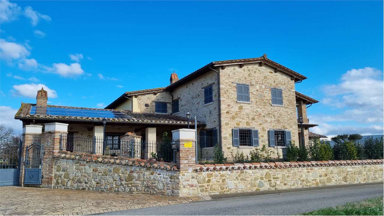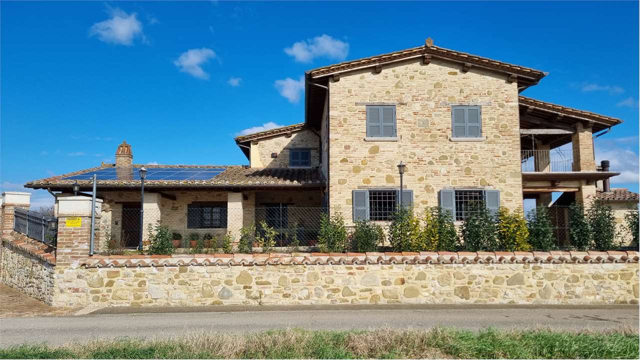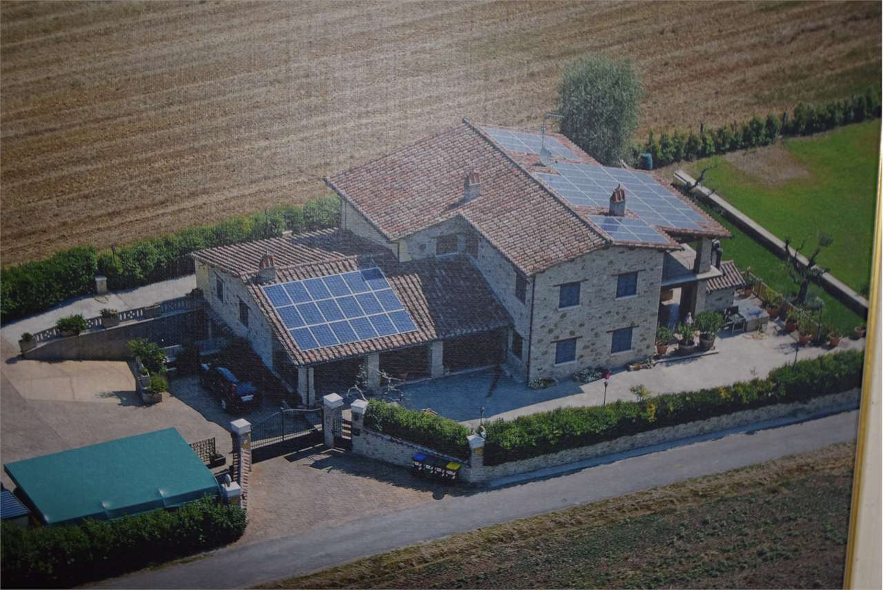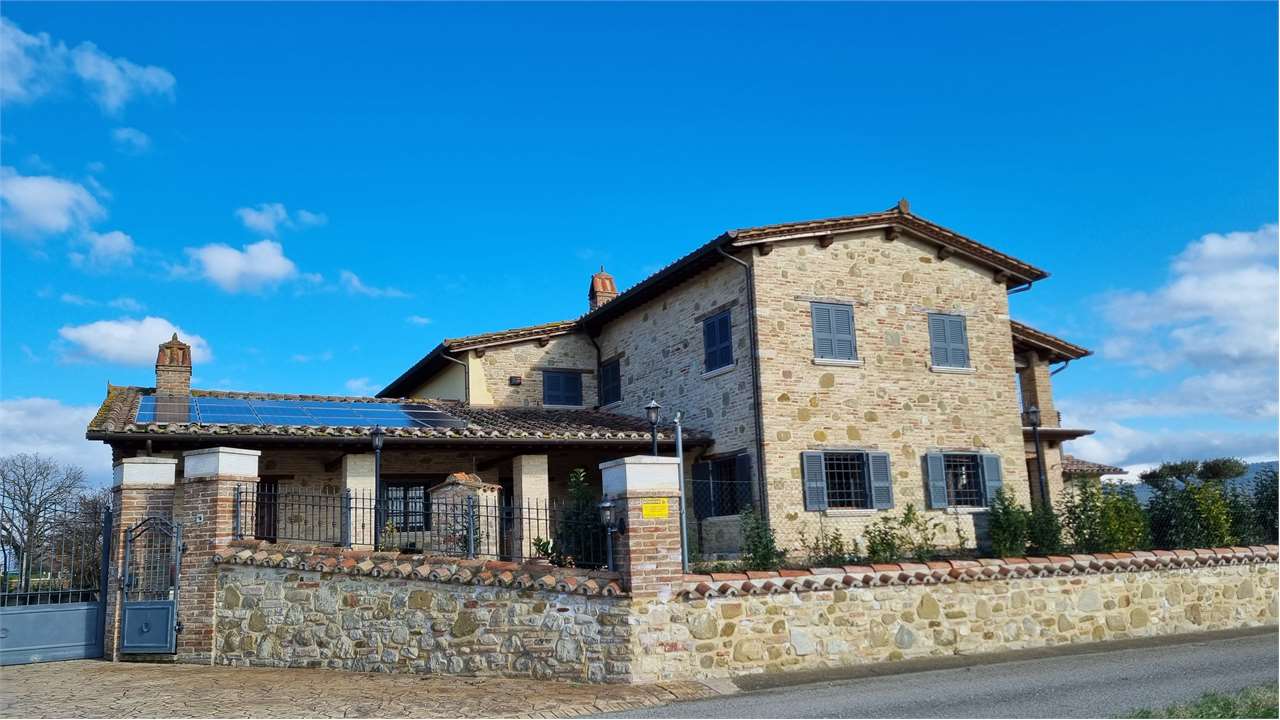 Villa Deruta con 3000mq di Terreno e Impianto Fotovoltaico\nSe stai cercando una residenza di prestigio che unisca l\'eleganza delle finiture moderne alla sostenibilità ambientale, la nostra Villa Deruta è la scelta perfetta per te. Situata in una posizione privilegiata, questa villa di recente costruzione offre non solo un lussuoso ambiente abitativo, ma anche un\'ampia area esterna e un impianto fotovoltaico per un\'esperienza di vita ecologica e confortevole. Per informazioni tel : +39 393 9067105 \nCaratteristiche Principali:\nSuperficie: La villa si estende su una superficie complessiva di circa 390 metri quadrati, suddivisa su tre livelli.\nPiano Terra: Ampio soggiorno con angolo cottura e camino che si affaccia su due portici, di cui uno con area barbecue. Dispone inoltre di 4 bagni e 4 camere da letto, una delle quali con camino e ingresso indipendente, ideale per la realizzazione di un terzo appartamento. \nPiano Primo: Soggiorno spazioso con accesso diretto al portico, cucina grande e due camere da letto con bagno privato, oltre a un bagno per gli ospiti. \nPiano Interrato: Autorimessa di circa 98mq con spazi aggiuntivi per un totale di circa 200mq.\nImpianto Fotovoltaico: Montato sul tetto, un impianto fotovoltaico da 16KW garantisce un\'efficienza energetica ottimale, riducendo i costi e l\'impatto ambientale.\nTerreno: La proprietà include una corte esclusiva di circa 3000mq, caratterizzata da un pittoresco pozzo. Le utenze sono attive e il riscaldamento è a pavimento, assicurando un comfort abitativo superiore.\nAPE in fase di rilascio: Il certificato di prestazione energetica è attualmente in fase di elaborazione.\nQuesta villa rappresenta l\'opportunità ideale per chi desidera vivere immerso nella tranquillità della campagna, senza rinunciare al comfort e alla modernità. Contattaci oggi stesso per prenotare una visita e scoprire tutte le incredibili caratteristiche di questa proprietà unica nel suo genere. Per informazioni tel : +39 393 9067105