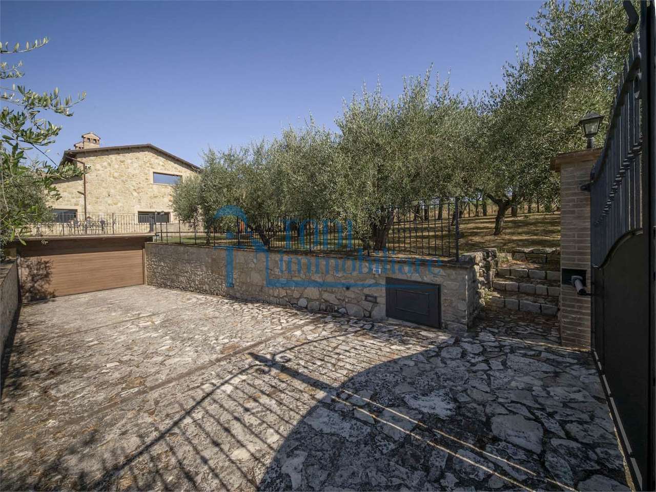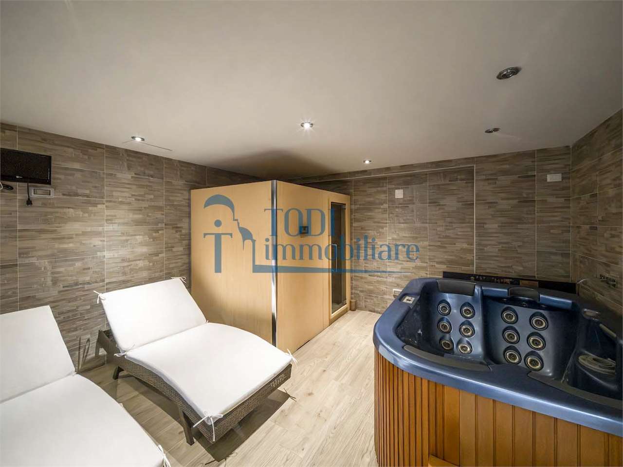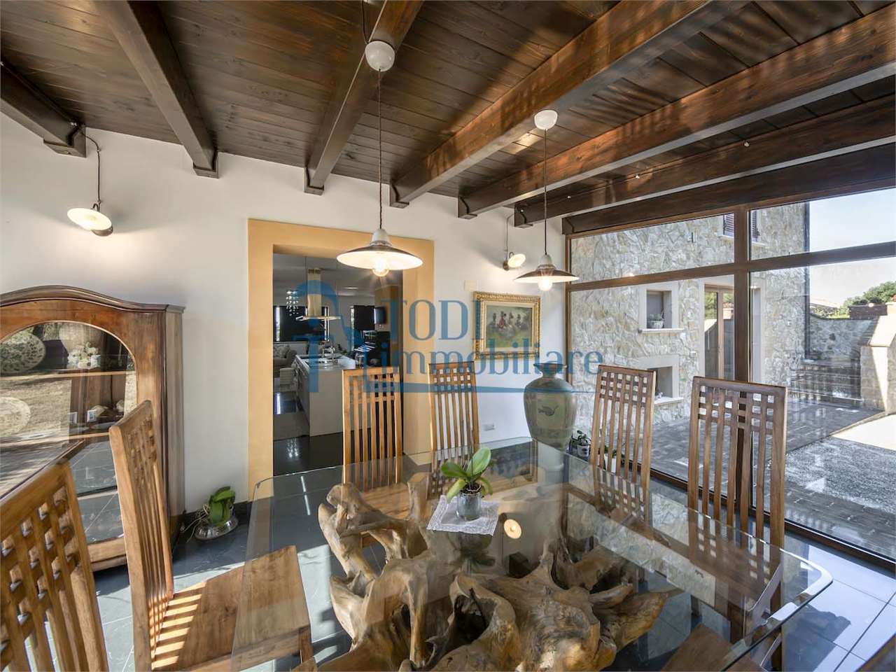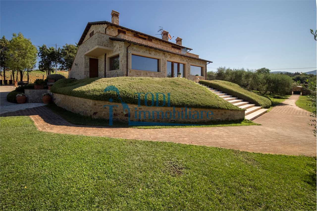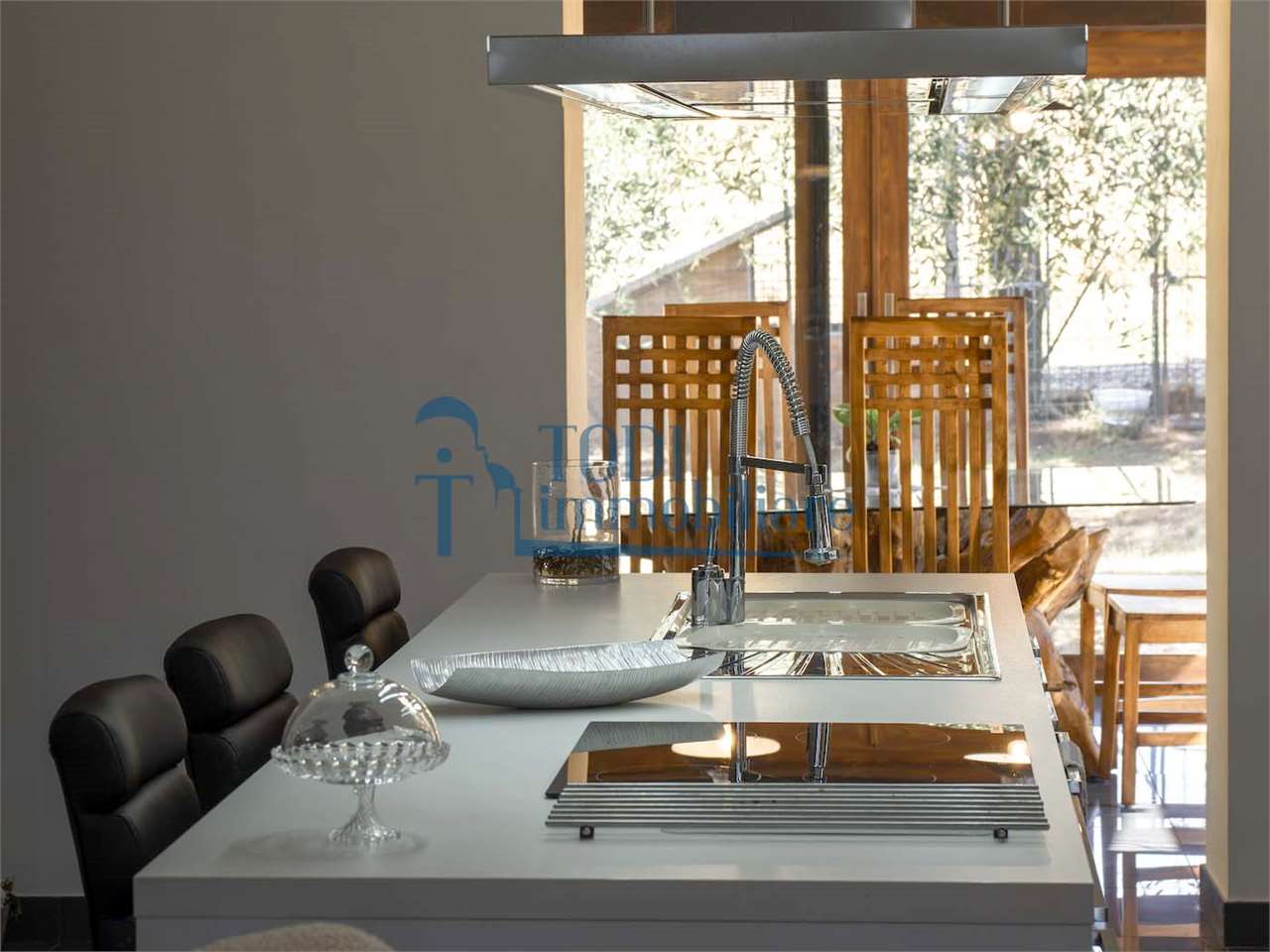 Nella pittoresca campagna di Casteltodino, a pochi chilometri da San Gemini e Terni, proponiamo in vendita una straordinaria proprietà che unisce comfort e fascino rurale. La posizione strategica, a ridosso della superstrada E-45, garantisce collegamenti agevoli con le maggiori città umbre e le mete turistiche della regione.\n\nLa proprietà include una villa indipendente di circa 370 m², caratterizzata da pareti esterne rivestite interamente in pietra locale, che richiamano l’autenticità dei tradizionali casali umbri. Il tutto è incorniciato da un terreno esclusivo e completamente recintato di 2.800 m², arricchito da una piscina, una tettoia per il ricovero delle auto e un uliveto con 70 piante attualmente in produzione.\n\nLa villa si sviluppa su tre livelli, ciascuno con funzioni ben definite: il piano terra ospita la zona giorno, il primo piano è dedicato alla zona notte, mentre il seminterrato accoglie una taverna, un’area SPA e un ampio garage. I piani sono comodamente collegati da un ascensore interno, una soluzione che aggiunge praticità e valorizza ulteriormente la proprietà.\n\nLa superficie abitativa è di circa 245 m², cui si aggiunge un terrazzo di 24 m², ideale per gustare colazioni o pranzi nella tranquillità delle colline circostanti. Al piano terra spiccano una luminosa sala con pareti completamente vetrate, una moderna cucina a induzione con vista panoramica, un doppio salone impreziosito da un elegante camino in marmo e zone relax dedicate alla lettura o alla TV, oltre a un bagno pratico e funzionale.\n\nAl primo piano troviamo tre ampie camere matrimoniali (di 35, 22 e 16 m²), tutte con bagno privato, oltre a un disimpegno che conduce all’ascensore. La camera padronale, particolarmente spaziosa, si distingue per la presenza di una cabina armadio e di un grazioso terrazzino con vista mozzafiato.\n\nIl piano seminterrato rappresenta una vera aggiunta di valore alla proprietà. Qui si trovano una grande taverna con angolo cucina, camino, forno a legna e patio esterno perfetto per aperitivi; un’area SPA dotata di vasca idromassaggio per quattro persone, sauna/bagno turco e bagno completo; infine, un doppio garage con zona lavanderia.\n\nIl terreno pertinenziale è organizzato in diverse aree: un giardino curato nei minimi dettagli con impianto di irrigazione automatica e robot per il taglio dell’erba; una zona piscina; uno spazio dedicato all’uliveto e infine un piazzale con tettoia per due auto. L’uliveto offre un’eccellente produzione stagionale, generando circa 5 quintali di olive nell’ultima stagione.\n\nLa piscina in muratura misura 8x16 metri ed è dotata di acqua salata, bordo pavimentato e lettini per garantire massimo relax. Gli spazi esterni sono stati progettati per offrire comfort ottimale e grande vivibilità.\n\nLa proprietà è arricchita da dettagli tecnici di alta qualità: infissi esterni con vetri antisfondamento e zanzariere al piano terra; persiane in legno al primo piano; riscaldamento a pavimento alimentato sia a GPL che a pellet; impianto fotovoltaico da 6 kW con accumulo da 10 kW e pannelli solari per l’acqua calda; pozzo con acqua sorgiva; cancelli automatici carrabili e pedonali in ferro battuto; porta basculante del garage motorizzata; colonna per lavatrice e asciugatrice. Completano la villa i pavimenti in marmo al piano terra e in gres porcellanato negli altri ambienti, oltre alla connessione internet.\n\nAcquistare questa straordinaria proprietà significa regalarsi un raffinato stile di vita nell’autentica campagna umbra: un luogo dove il giorno inizia con il canto degli uccelli e si conclude con tramonti spettacolari. Contattaci e trasforma il tuo sogno in realtà!