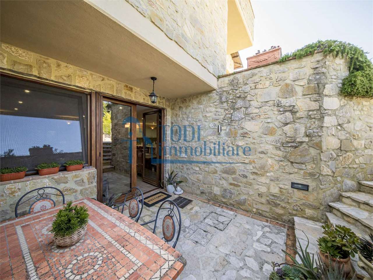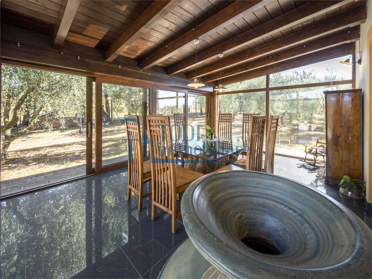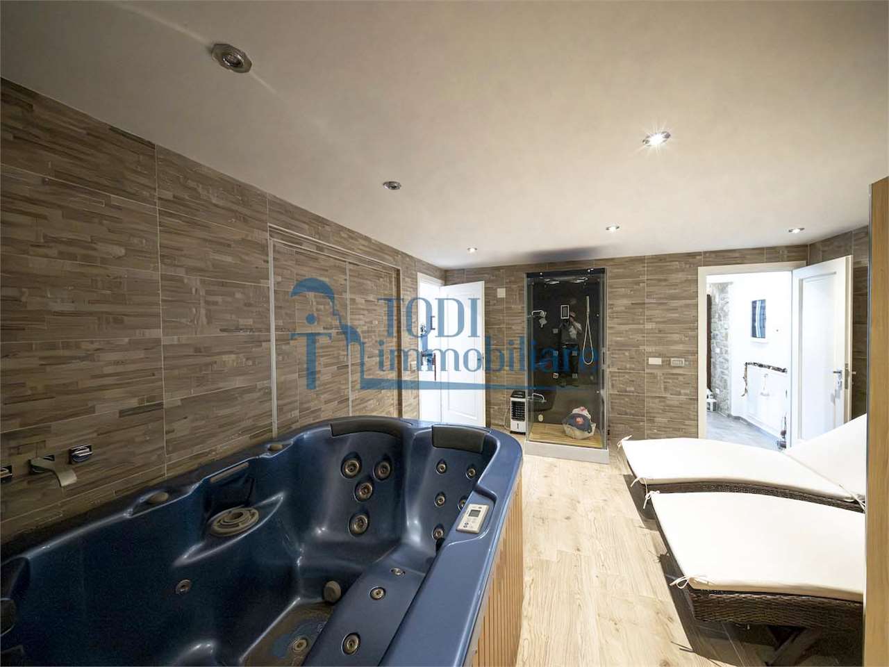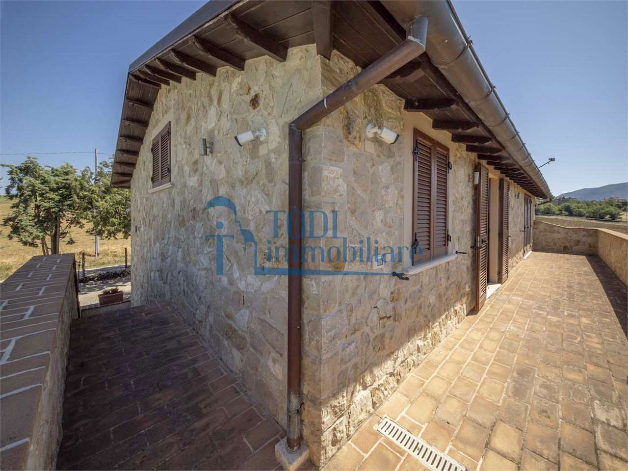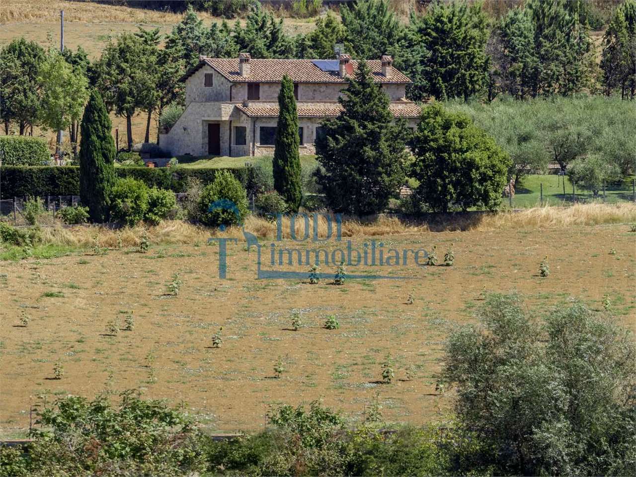 Nella pittoresca campagna di Casteltodino, a pochi chilometri da San Gemini e Terni, proponiamo in vendita una straordinaria proprietà che unisce comfort e fascino rurale. La posizione strategica, a ridosso della superstrada E-45, garantisce collegamenti agevoli con le maggiori città umbre e le mete turistiche della regione.\n\nLa proprietà include una villa indipendente di circa 370 m², caratterizzata da pareti esterne rivestite interamente in pietra locale, che richiamano l’autenticità dei tradizionali casali umbri. Il tutto è incorniciato da un terreno esclusivo e completamente recintato di 2.800 m², arricchito da una piscina, una tettoia per il ricovero delle auto e un uliveto con 70 piante attualmente in produzione.\n\nLa villa si sviluppa su tre livelli, ciascuno con funzioni ben definite: il piano terra ospita la zona giorno, il primo piano è dedicato alla zona notte, mentre il seminterrato accoglie una taverna, un’area SPA e un ampio garage. I piani sono comodamente collegati da un ascensore interno, una soluzione che aggiunge praticità e valorizza ulteriormente la proprietà.\n\nLa superficie abitativa è di circa 245 m², cui si aggiunge un terrazzo di 24 m², ideale per gustare colazioni o pranzi nella tranquillità delle colline circostanti. Al piano terra spiccano una luminosa sala con pareti completamente vetrate, una moderna cucina a induzione con vista panoramica, un doppio salone impreziosito da un elegante camino in marmo e zone relax dedicate alla lettura o alla TV, oltre a un bagno pratico e funzionale.\n\nAl primo piano troviamo tre ampie camere matrimoniali (di 35, 22 e 16 m²), tutte con bagno privato, oltre a un disimpegno che conduce all’ascensore. La camera padronale, particolarmente spaziosa, si distingue per la presenza di una cabina armadio e di un grazioso terrazzino con vista mozzafiato.\n\nIl piano seminterrato rappresenta una vera aggiunta di valore alla proprietà. Qui si trovano una grande taverna con angolo cucina, camino, forno a legna e patio esterno perfetto per aperitivi; un’area SPA dotata di vasca idromassaggio per quattro persone, sauna/bagno turco e bagno completo; infine, un doppio garage con zona lavanderia.\n\nIl terreno pertinenziale è organizzato in diverse aree: un giardino curato nei minimi dettagli con impianto di irrigazione automatica e robot per il taglio dell’erba; una zona piscina; uno spazio dedicato all’uliveto e infine un piazzale con tettoia per due auto. L’uliveto offre un’eccellente produzione stagionale, generando circa 5 quintali di olive nell’ultima stagione.\n\nLa piscina in muratura misura 8x16 metri ed è dotata di acqua salata, bordo pavimentato e lettini per garantire massimo relax. Gli spazi esterni sono stati progettati per offrire comfort ottimale e grande vivibilità.\n\nLa proprietà è arricchita da dettagli tecnici di alta qualità: infissi esterni con vetri antisfondamento e zanzariere al piano terra; persiane in legno al primo piano; riscaldamento a pavimento alimentato sia a GPL che a pellet; impianto fotovoltaico da 6 kW con accumulo da 10 kW e pannelli solari per l’acqua calda; pozzo con acqua sorgiva; cancelli automatici carrabili e pedonali in ferro battuto; porta basculante del garage motorizzata; colonna per lavatrice e asciugatrice. Completano la villa i pavimenti in marmo al piano terra e in gres porcellanato negli altri ambienti, oltre alla connessione internet.\n\nAcquistare questa straordinaria proprietà significa regalarsi un raffinato stile di vita nell’autentica campagna umbra: un luogo dove il giorno inizia con il canto degli uccelli e si conclude con tramonti spettacolari. Contattaci e trasforma il tuo sogno in realtà!