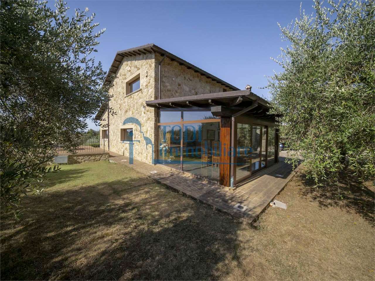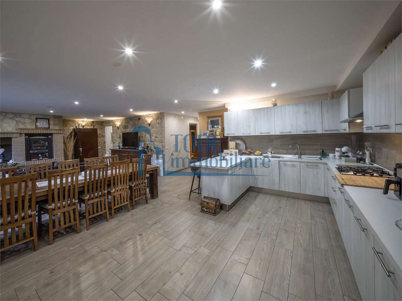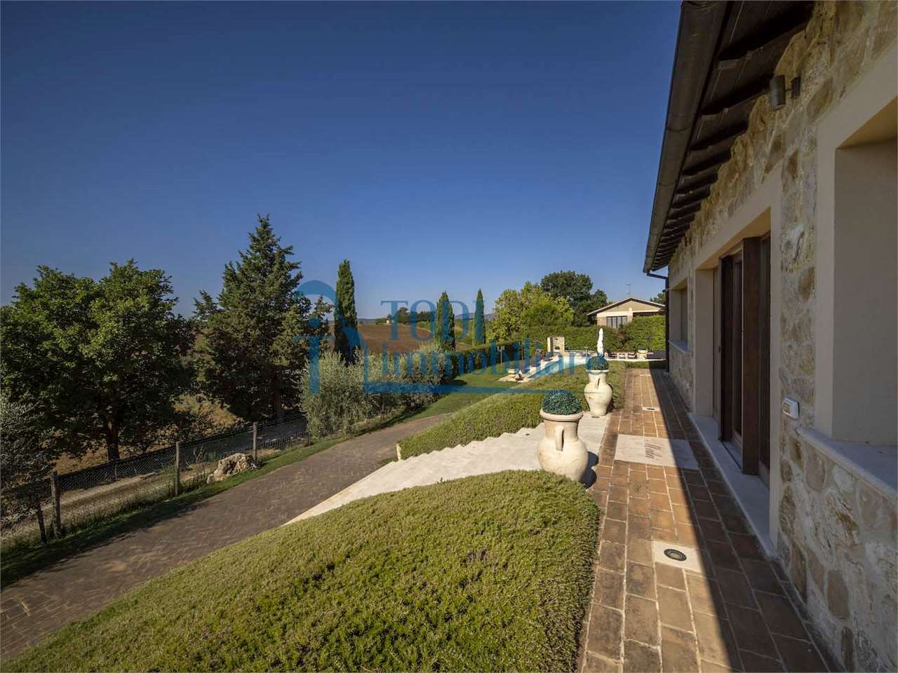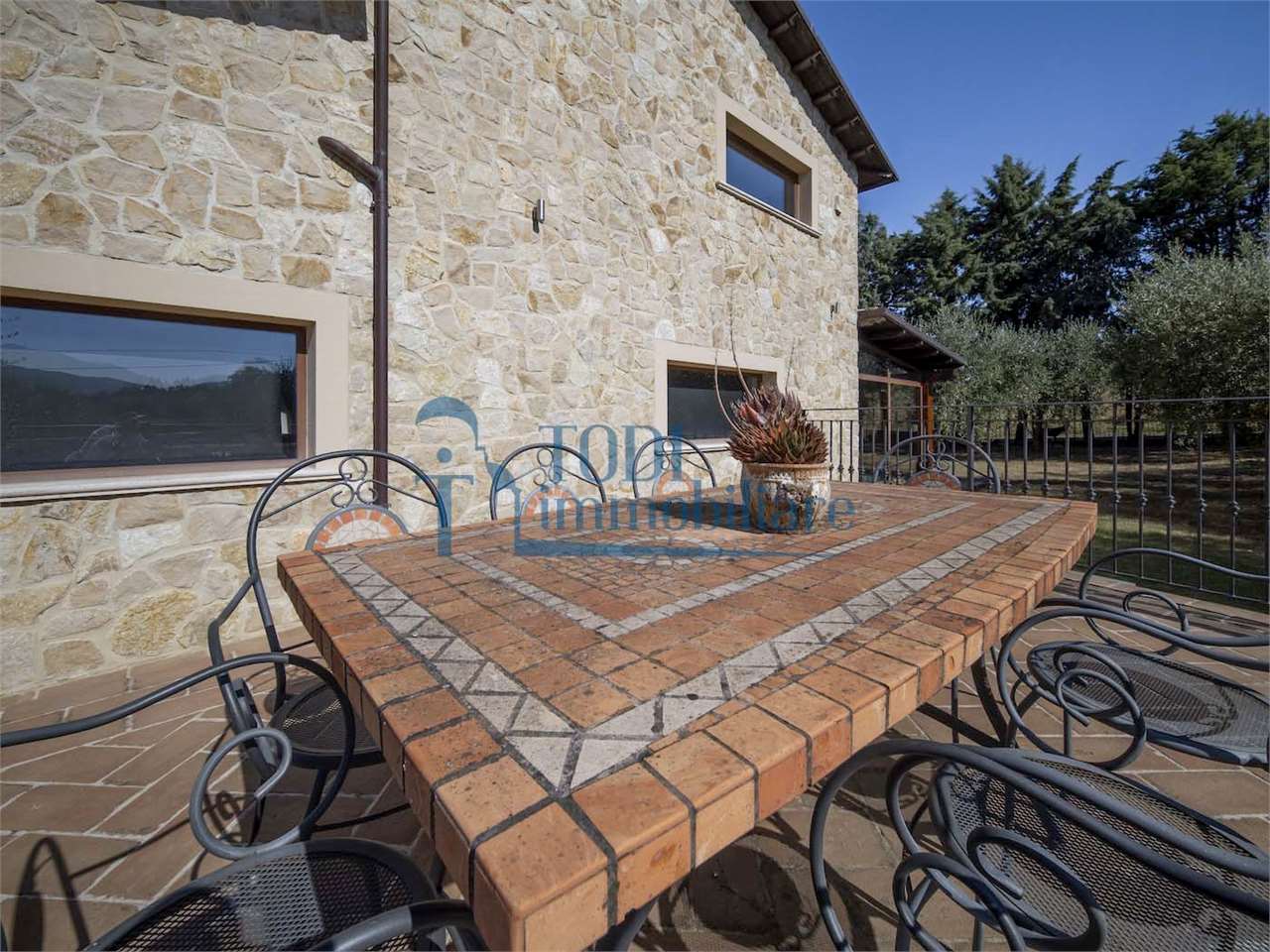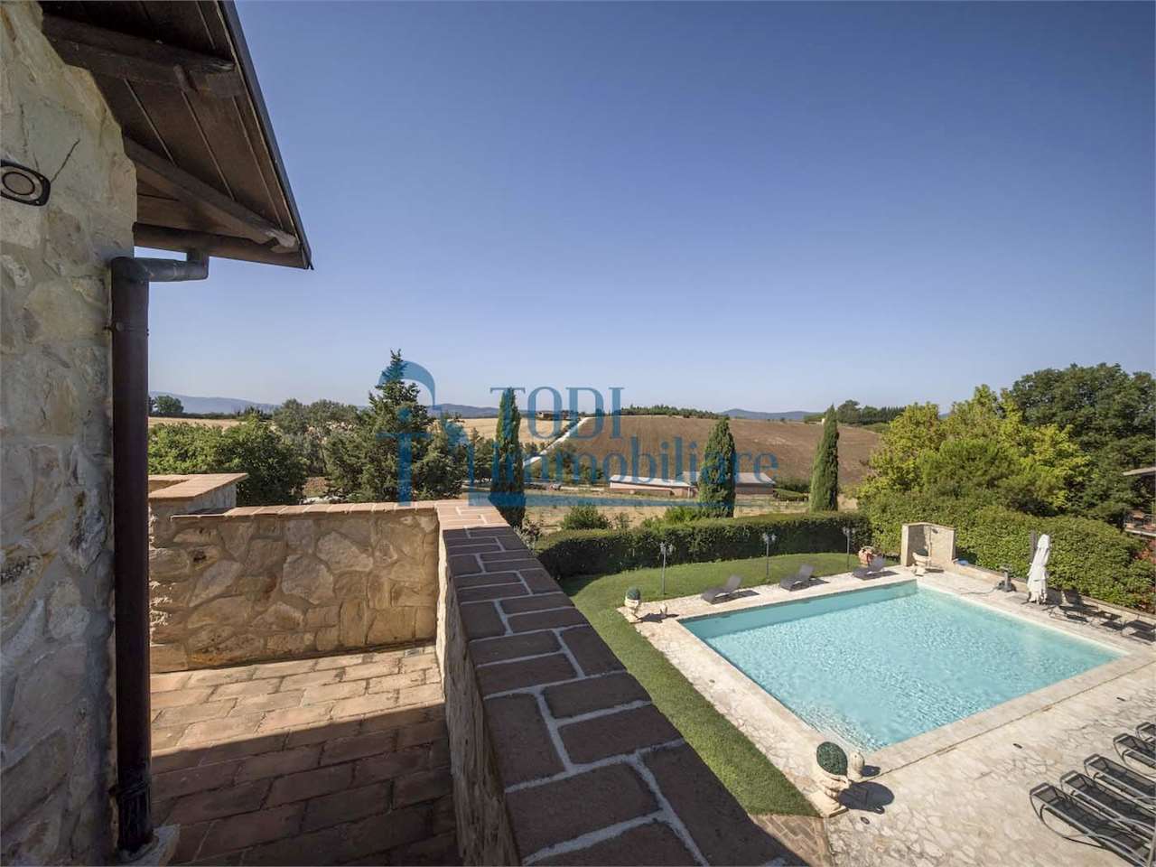 Nella pittoresca campagna di Casteltodino, a pochi chilometri da San Gemini e Terni, proponiamo in vendita una straordinaria proprietà che unisce comfort e fascino rurale. La posizione strategica, a ridosso della superstrada E-45, garantisce collegamenti agevoli con le maggiori città umbre e le mete turistiche della regione.\n\nLa proprietà include una villa indipendente di circa 370 m², caratterizzata da pareti esterne rivestite interamente in pietra locale, che richiamano l’autenticità dei tradizionali casali umbri. Il tutto è incorniciato da un terreno esclusivo e completamente recintato di 2.800 m², arricchito da una piscina, una tettoia per il ricovero delle auto e un uliveto con 70 piante attualmente in produzione.\n\nLa villa si sviluppa su tre livelli, ciascuno con funzioni ben definite: il piano terra ospita la zona giorno, il primo piano è dedicato alla zona notte, mentre il seminterrato accoglie una taverna, un’area SPA e un ampio garage. I piani sono comodamente collegati da un ascensore interno, una soluzione che aggiunge praticità e valorizza ulteriormente la proprietà.\n\nLa superficie abitativa è di circa 245 m², cui si aggiunge un terrazzo di 24 m², ideale per gustare colazioni o pranzi nella tranquillità delle colline circostanti. Al piano terra spiccano una luminosa sala con pareti completamente vetrate, una moderna cucina a induzione con vista panoramica, un doppio salone impreziosito da un elegante camino in marmo e zone relax dedicate alla lettura o alla TV, oltre a un bagno pratico e funzionale.\n\nAl primo piano troviamo tre ampie camere matrimoniali (di 35, 22 e 16 m²), tutte con bagno privato, oltre a un disimpegno che conduce all’ascensore. La camera padronale, particolarmente spaziosa, si distingue per la presenza di una cabina armadio e di un grazioso terrazzino con vista mozzafiato.\n\nIl piano seminterrato rappresenta una vera aggiunta di valore alla proprietà. Qui si trovano una grande taverna con angolo cucina, camino, forno a legna e patio esterno perfetto per aperitivi; un’area SPA dotata di vasca idromassaggio per quattro persone, sauna/bagno turco e bagno completo; infine, un doppio garage con zona lavanderia.\n\nIl terreno pertinenziale è organizzato in diverse aree: un giardino curato nei minimi dettagli con impianto di irrigazione automatica e robot per il taglio dell’erba; una zona piscina; uno spazio dedicato all’uliveto e infine un piazzale con tettoia per due auto. L’uliveto offre un’eccellente produzione stagionale, generando circa 5 quintali di olive nell’ultima stagione.\n\nLa piscina in muratura misura 8x16 metri ed è dotata di acqua salata, bordo pavimentato e lettini per garantire massimo relax. Gli spazi esterni sono stati progettati per offrire comfort ottimale e grande vivibilità.\n\nLa proprietà è arricchita da dettagli tecnici di alta qualità: infissi esterni con vetri antisfondamento e zanzariere al piano terra; persiane in legno al primo piano; riscaldamento a pavimento alimentato sia a GPL che a pellet; impianto fotovoltaico da 6 kW con accumulo da 10 kW e pannelli solari per l’acqua calda; pozzo con acqua sorgiva; cancelli automatici carrabili e pedonali in ferro battuto; porta basculante del garage motorizzata; colonna per lavatrice e asciugatrice. Completano la villa i pavimenti in marmo al piano terra e in gres porcellanato negli altri ambienti, oltre alla connessione internet.\n\nAcquistare questa straordinaria proprietà significa regalarsi un raffinato stile di vita nell’autentica campagna umbra: un luogo dove il giorno inizia con il canto degli uccelli e si conclude con tramonti spettacolari. Contattaci e trasforma il tuo sogno in realtà!