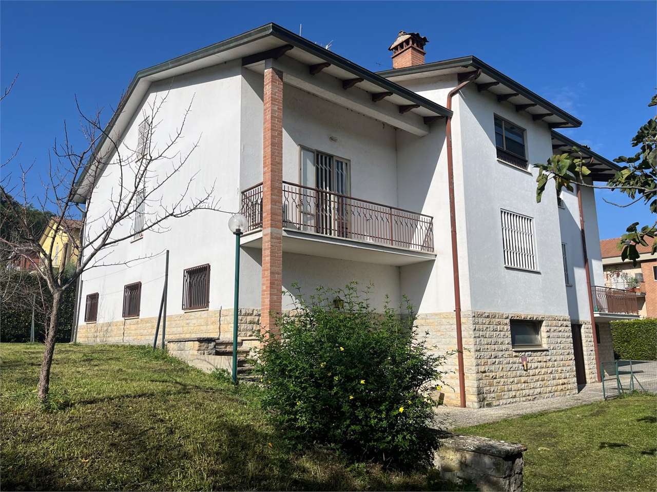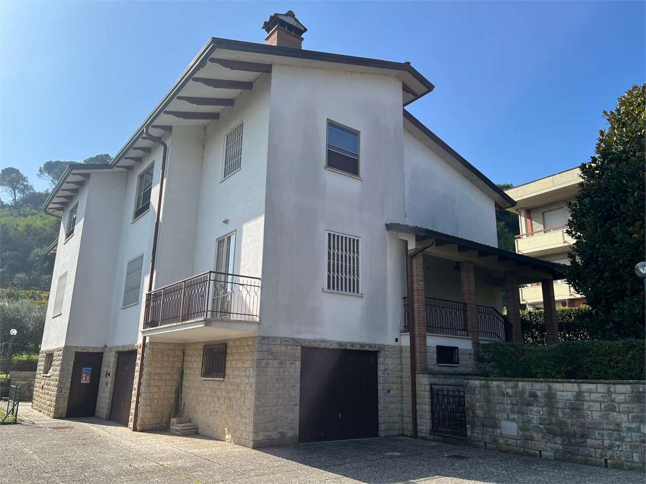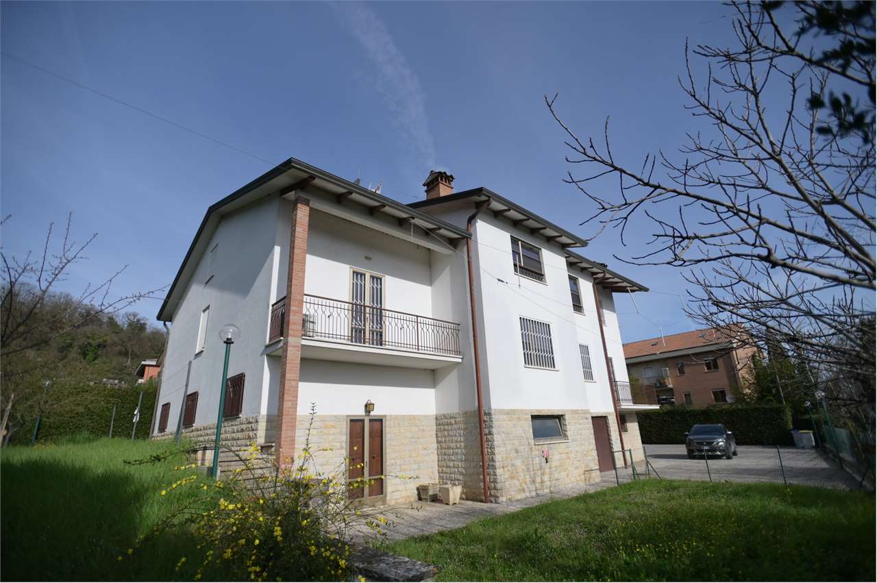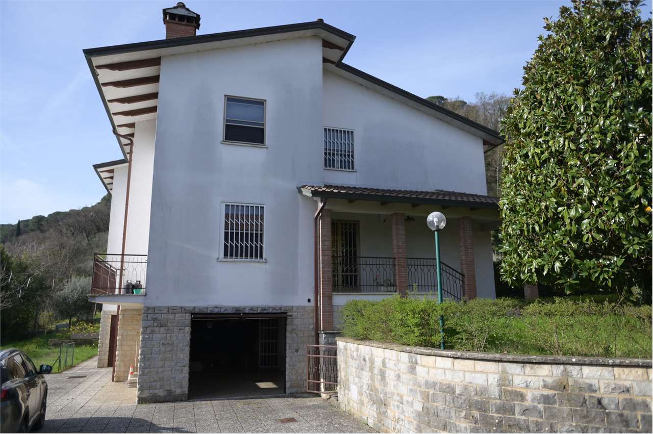CASAGLIA: Proponiamo in vendita villa indipendente di grandi dimensioni, in posizione panoramica ed in buono stato d\'uso.\nDisposta su 3 livelli, con giardino recintato sui 4 lati di circa 500 mq.\nIl piano terra è composto da ampio garage (per 4 auto con 2 accessi carrabili), lavanderia/stireria, magazzino, bagno, cantina, centrale termica/locale tecnico, cucina di sevizio ed ampio salone rustico con camino di circa 60 mq, con accesso diretto al giardino.\nAl primo piano troviamo nella zona giorno l\'ingresso principale, al quale si accede direttamente con una scala esterna, salone doppio con camino e terrazzo, cucina abitabile con ulteriore terrazzo, studio e bagno di servizio finestrato, nella zona notte 3 camere matrimoniali e 2 bagni.\nAl secondo piano 2 camere, bagno, ulteriore salone doppio con camino, e soffitta di oltre 100 mq.\nPer ulteriori informazioni 07530040.
