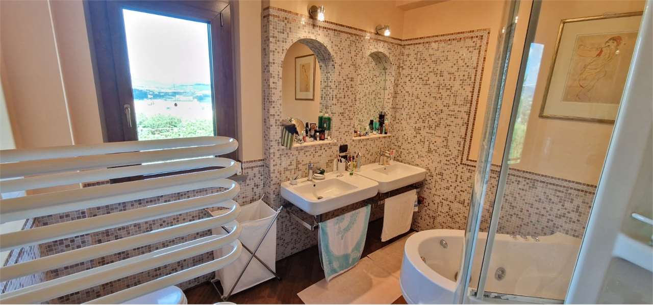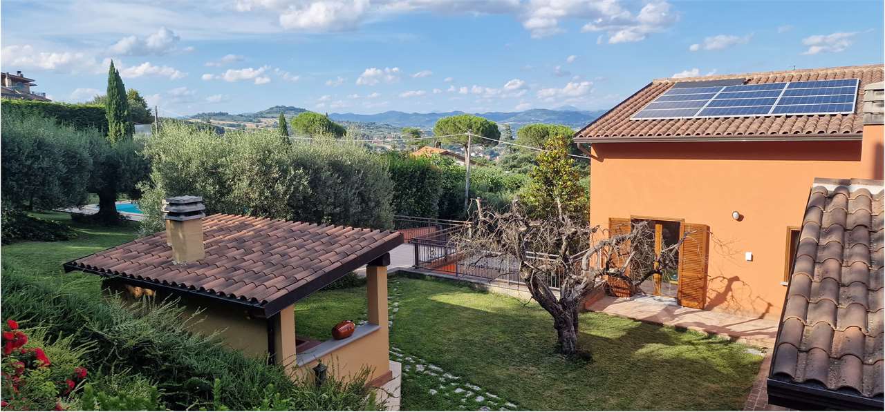 Proponiamo in vendita, in posizione dominante lungo la Strada Eugubina, una splendida villa indipendente di ampia metratura, situata in un contesto residenziale tranquillo e strategico (4 km da Perugia, 10 km dall\'Aeroporto, vicinanza E45).\n\nL’immobile è stato oggetto di una ristrutturazione totale con ampliamento, curata nei minimi dettagli. La disposizione interna prevede:\n\nSalone doppio e cucina abitabile collegati al portico;\n\nStudio e 6 camere totali (4 al piano, 2 mansardate);\n\n6 bagni, lavanderia e ampi locali tecnici/cantine.\n\nCaratteristiche Tecniche e Impiantistiche:\nLa villa si distingue per un\'anima altamente tecnologica volta al risparmio energetico:\n\nEnergia: Impianto fotovoltaico (11,6 kW) con sistema di accumulo e solare termico.\n\nClimatizzazione: Pompa di calore da 12,5 kW e infissi di nuova generazione a triplo vetro.\n\nRisorse Idriche: Due pozzi privati, addolcitore e irrigazione automatizzata per il parco di 2.640 mq.\n\nSicurezza: Impianto antifurto e doppi ingressi carrabili automatizzati.\n\nL\'area esterna comprende una piscina con clorinatore a sale, zona barbecue attrezzata e una corte pavimentata esclusiva. La struttura è già predisposta per un\'eventuale divisione in due appartamenti distinti.\n\nDistanze Principali:\nAssisi 28 km | Lago Trasimeno 28 km | Roma 170 km | Firenze 160 km.\n\nInfo e Appuntamenti:\nRoberto Settonce – 328*9519484.