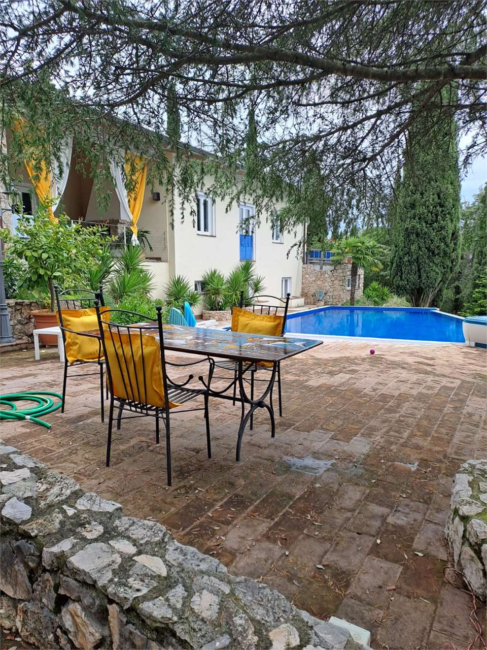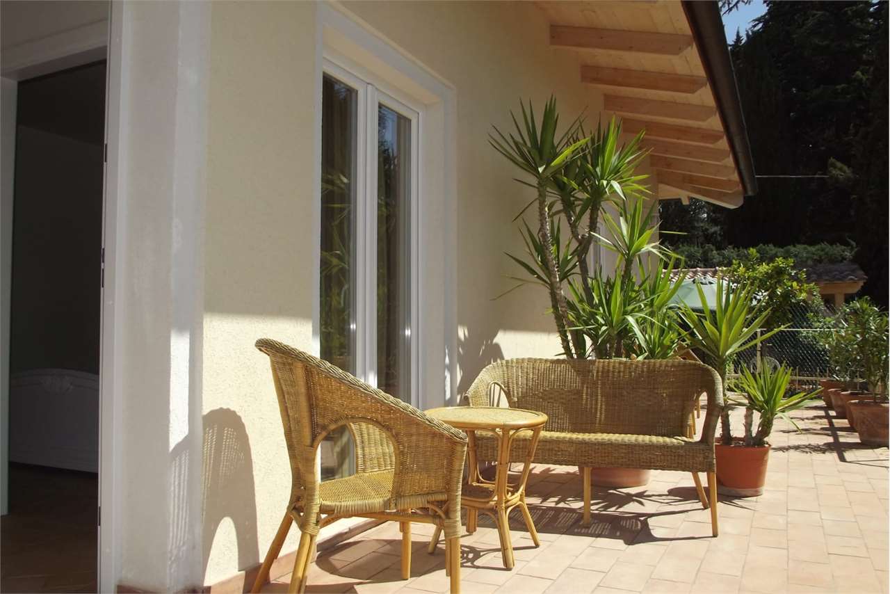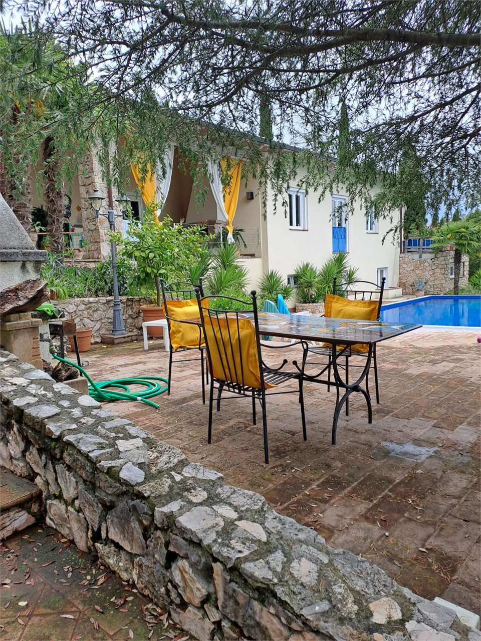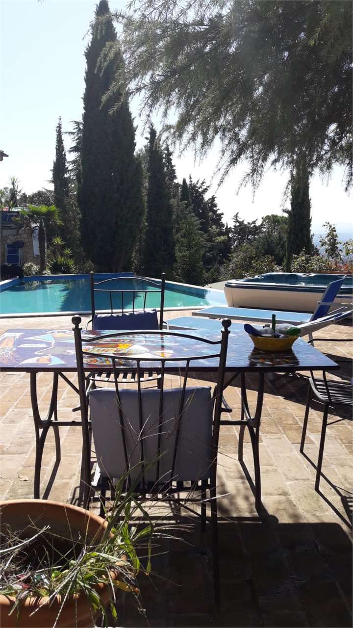 Villa di mq 426 , con piscina, costruzione recente. La casa e composta di due piani., piano terra : 4 camere da letto ogni una con bagno privato e vasca idromassaggio , cucina openspace , salotto ,dispensa., porticato , terrazza panoramica. Piano seminterrato è composto da un appartamento / camera da letto. sala con angolo cottura bagno con vasca, / garage , bagno di servizio con doccia, magazzino, cucina rustica , lavanderia , ambiente tecnico della piscina. TUTTI CONFORT : Riscaldamento a pavimento con impianto a metano., aria condizionata, rifiniture di pregio \nGiardino curato di circa mq 1500 con piscina a sfioro , Jacuzzi da esterno\n, 2 parcheggi per 5 machine . La Villa si presta benissimo anche per 2 nuclei familiari , o per un\'attività Turistico - ricettiva .